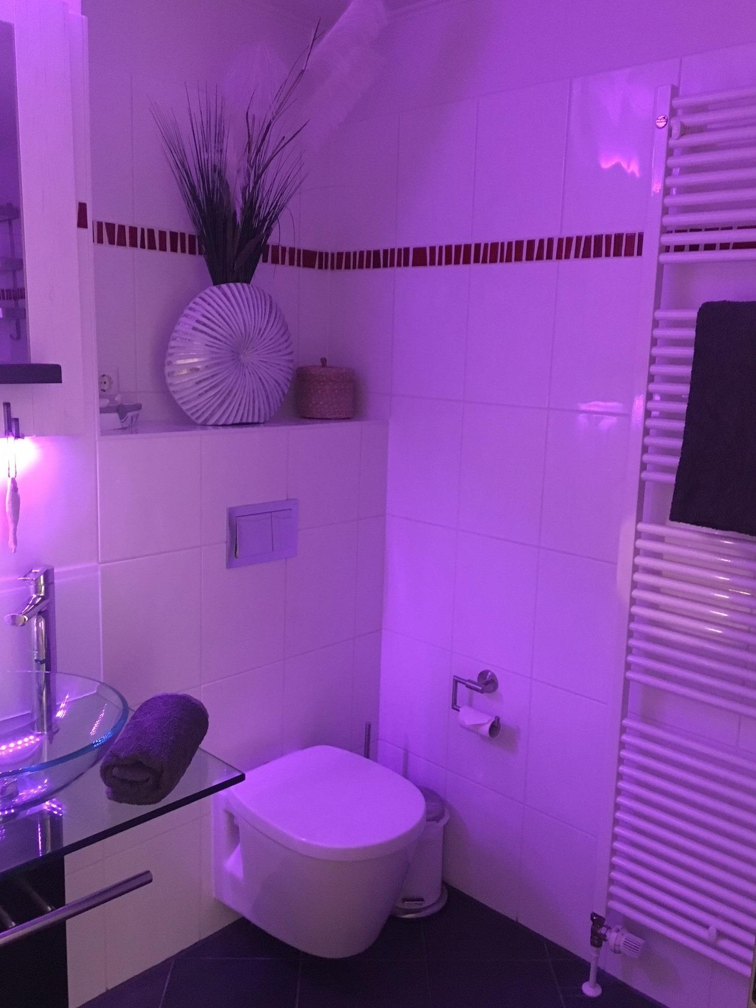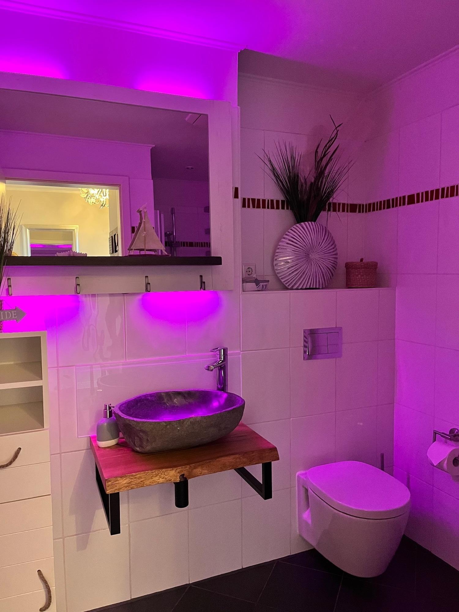 Im Wohlfühl-Duschbad mit edlem Waschbecken, Wellnessbeleuchtung, bodenebener Duschtasse und Handtuchheizkörper+Fußbodenerwärmung startet ein entspannter Urlaubstag!