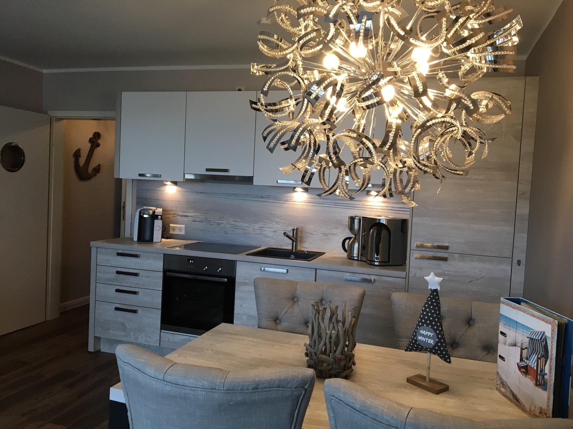 Die Pantry-Küche mit Design-Rückwand ist mit einer Mikrowelle, Kaffeemaschine, Toaster etc. startklar für ein tolles Gourmet-Menü.