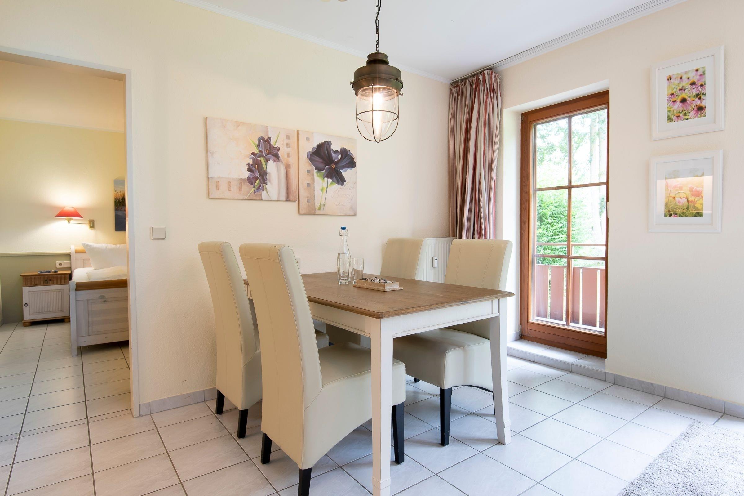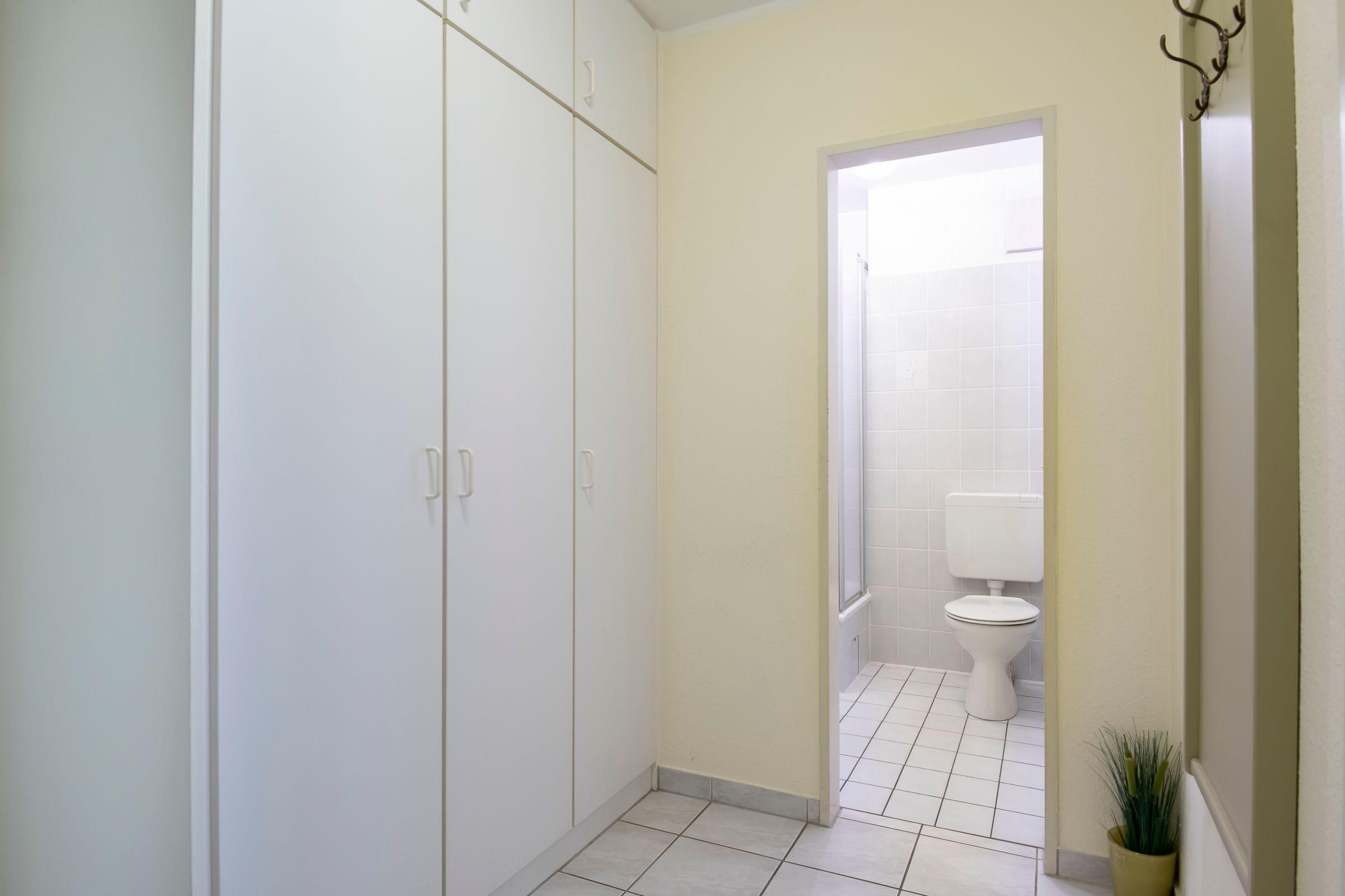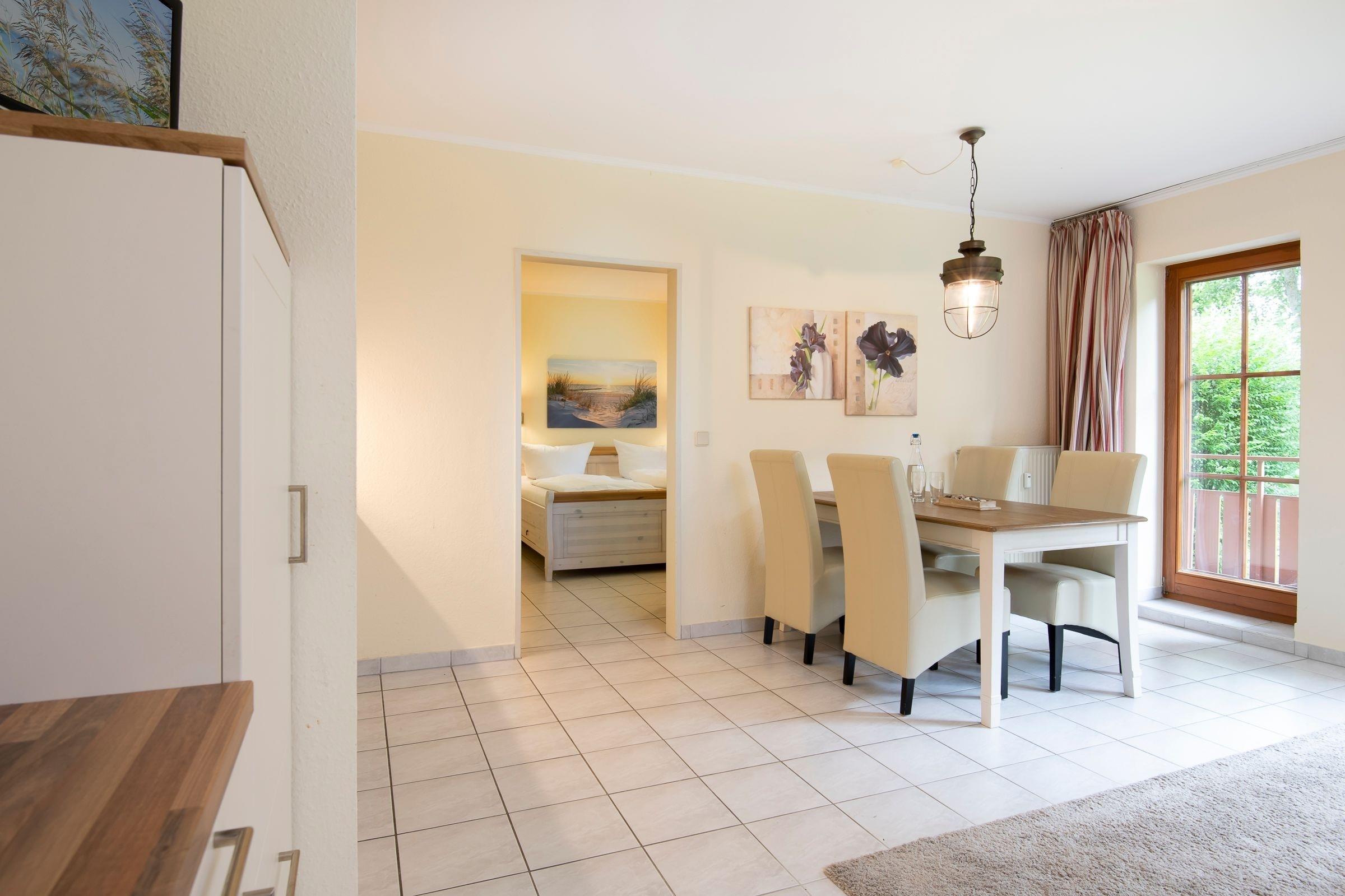 Vom Eingang des Wohnhauses sind es nur noch wenige Treppenstufen bis zu Ihrem Feriendomizil. Ein Flur empfängt Sie. Auf der linken Seite ist das Duschbad mit WC. Geradezu das Wohnzimmer mit gemütlicher, ausziehbarer Schlafcouch, Essecke und angrenzender Küche. Ob Sie nur Frühstück zubereiten möchten oder Kochen wie zu Hause, in der vollwertig ausgestatteten Küche haben Sie alle Möglichkeiten. Vom Wohnraum aus erreichen Sie den möblierten Balkon, auf dem Sie im Sommer ein leckeres Abendessen genießen können. Ihr Schlafzimmer ist kuschelig und funktional zugleich: Der Schrank schafft viel Platz, so dass auch ein weiteres Paar Schuhe oder das zweite Lieblingskleid ruhigen Gewissens mit in den Urlaubskoffer dürfen. Außerdem erwartet Sie dort ein Doppelbett (2x 90x200cm) mit Nachttischränkchen und Nachttischlampen. Die Internetnutzung ist über W-LAN kostenlos möglich.