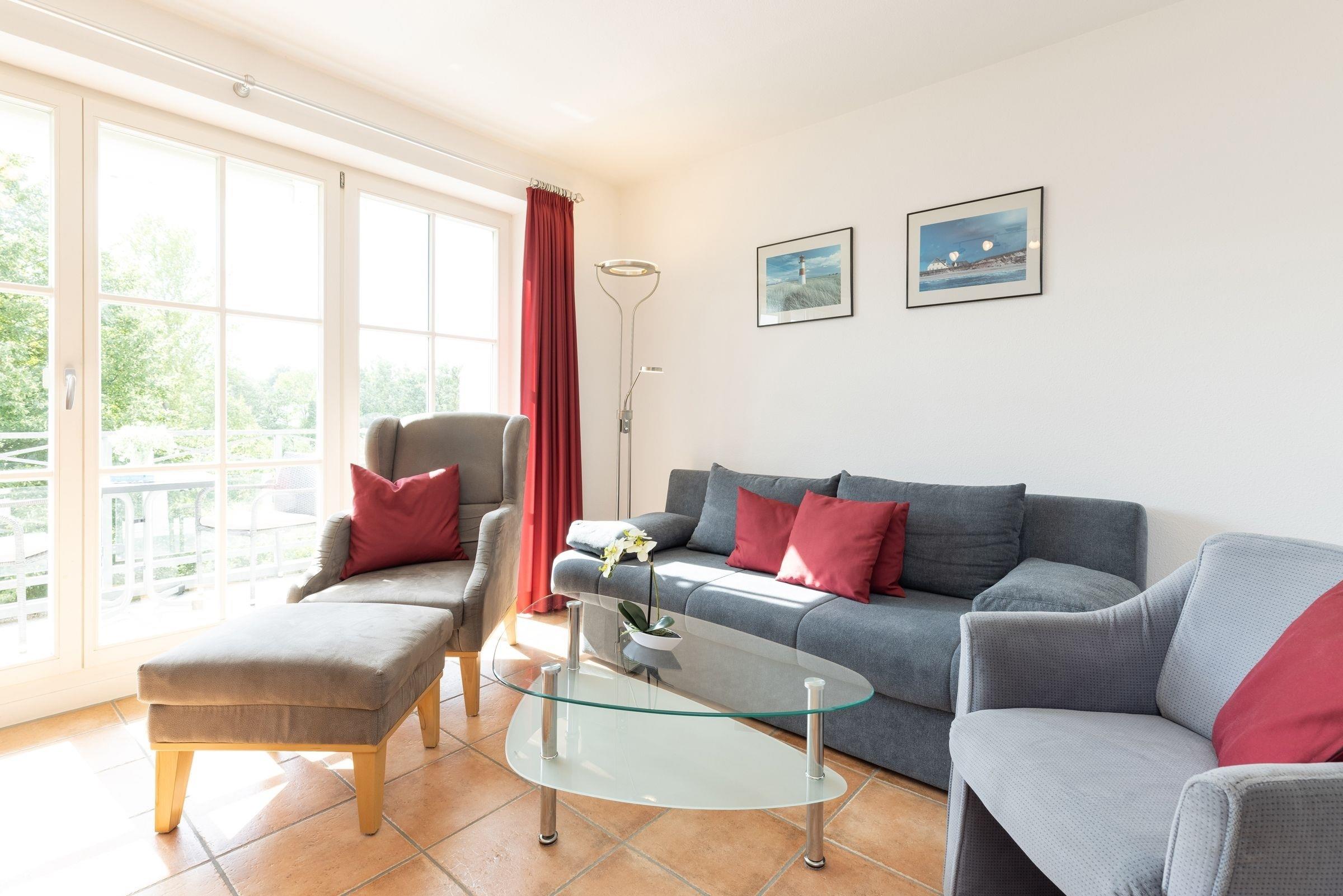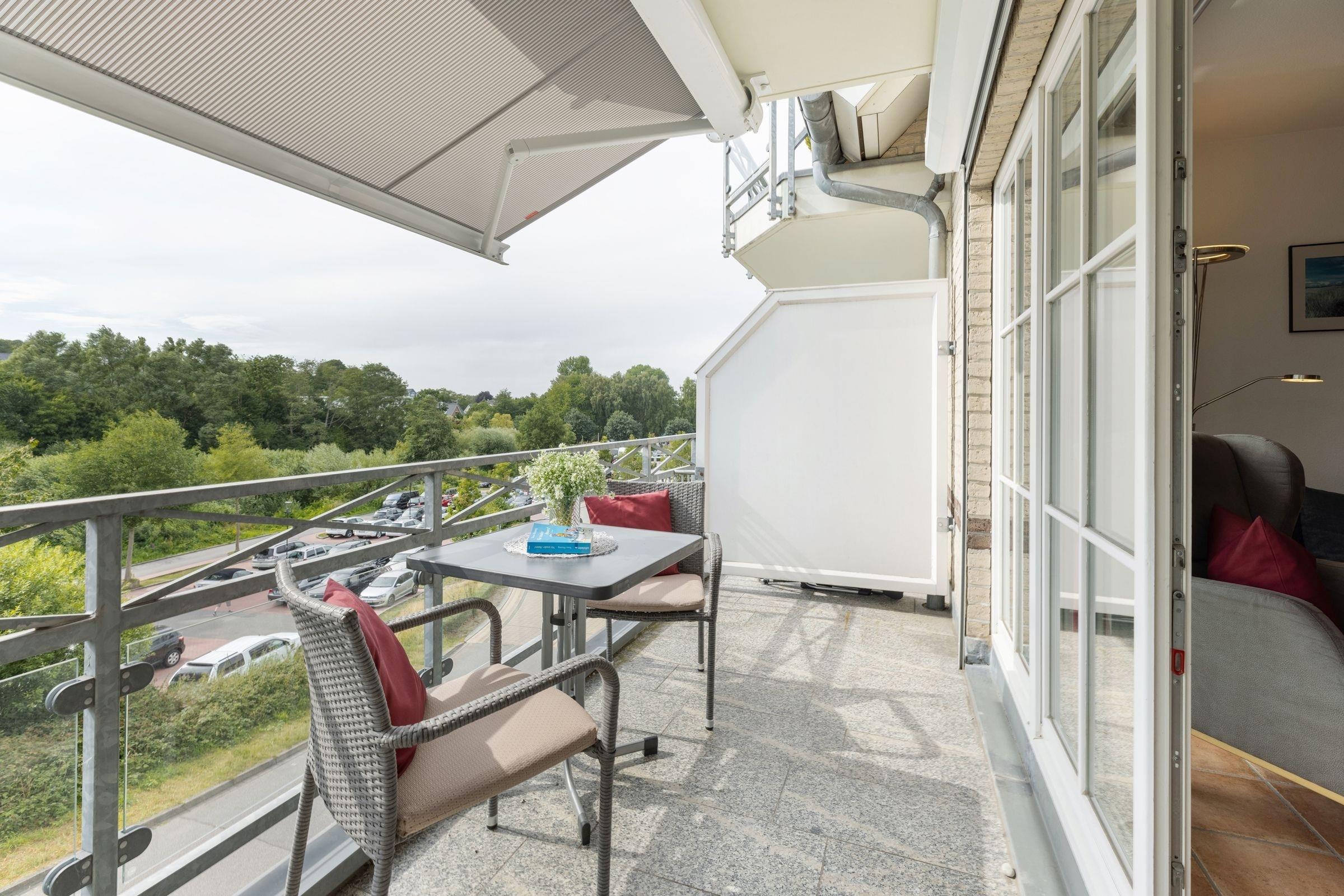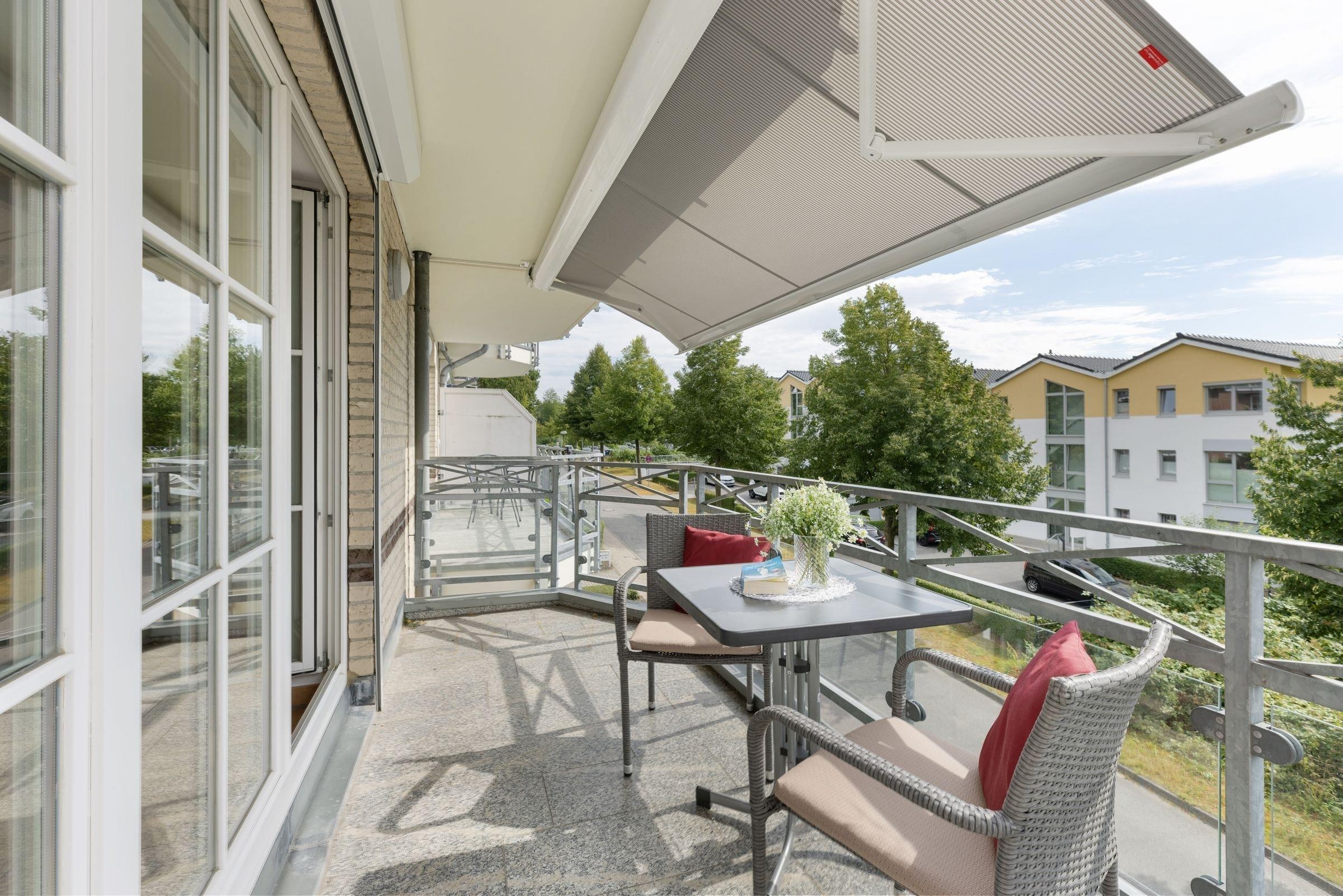 Das Wohnzimmer mit angrenzender voll ausgestatteter Wohnküche, ist mit einer gemütlichen Couch, einem großen Lesesessel mit Fußhocker, sowie einem Essplatz ausgestattet und lädt zum Verweilen, Ausspannen, Kochen und Genießen ein. Von hier haben Sie sogar einen kleinen Blick auf die schöne Ostsee. Genießen Sie zahlreiche Sonnenstunden auf dem großzügigen Balkon, die elektrische Markise spendet bei Bedarf ausreichend Schatten.