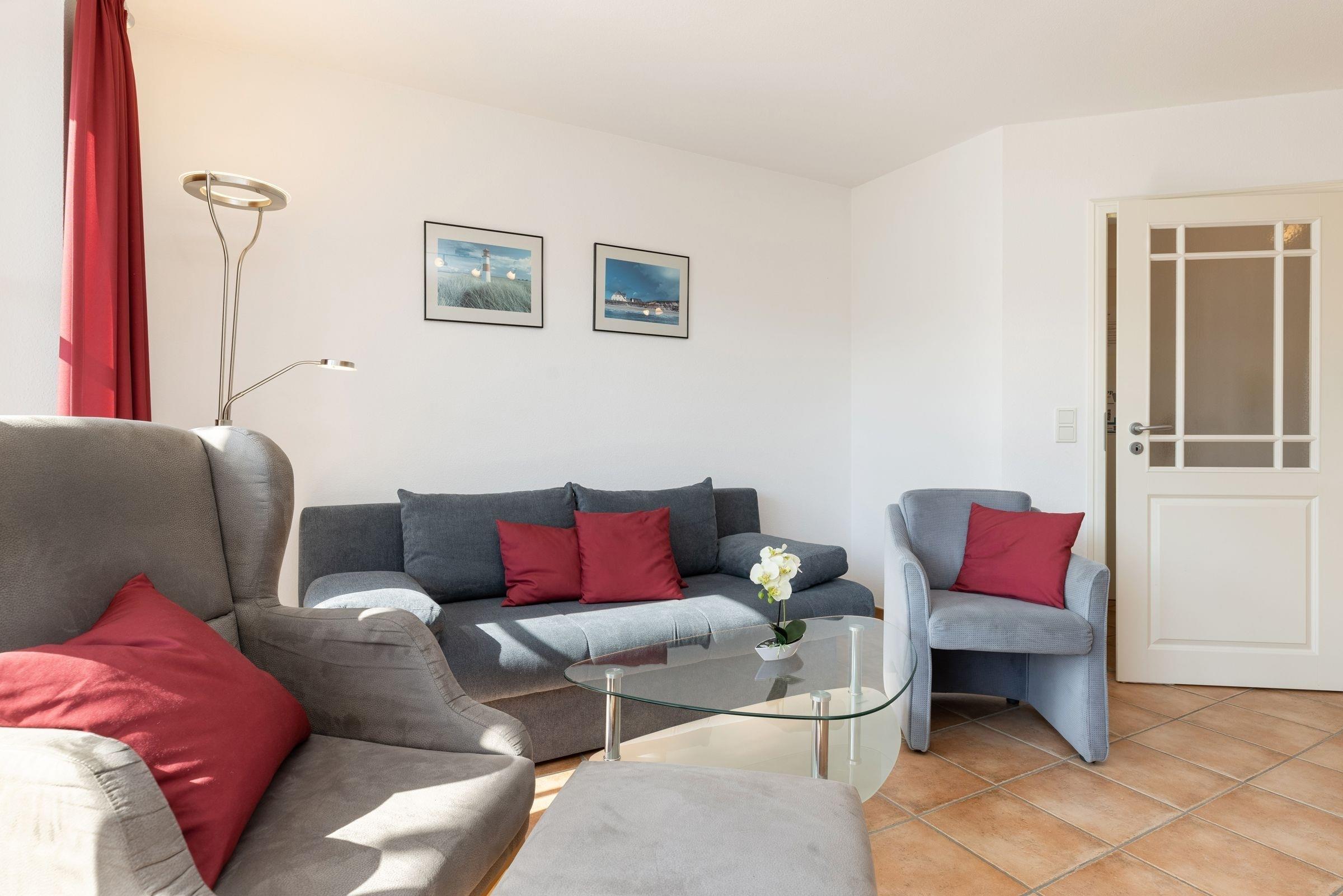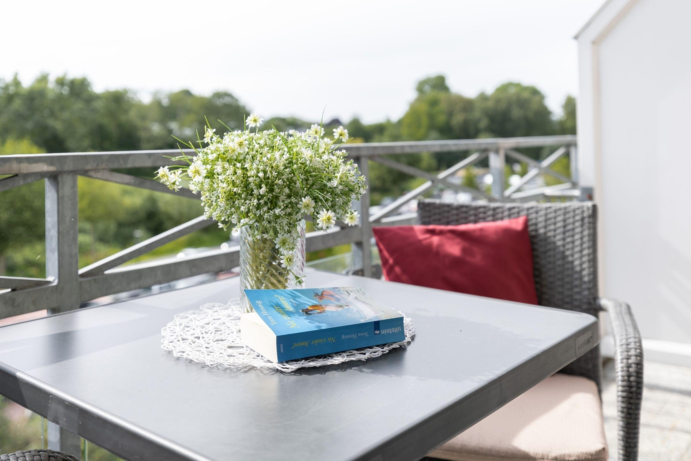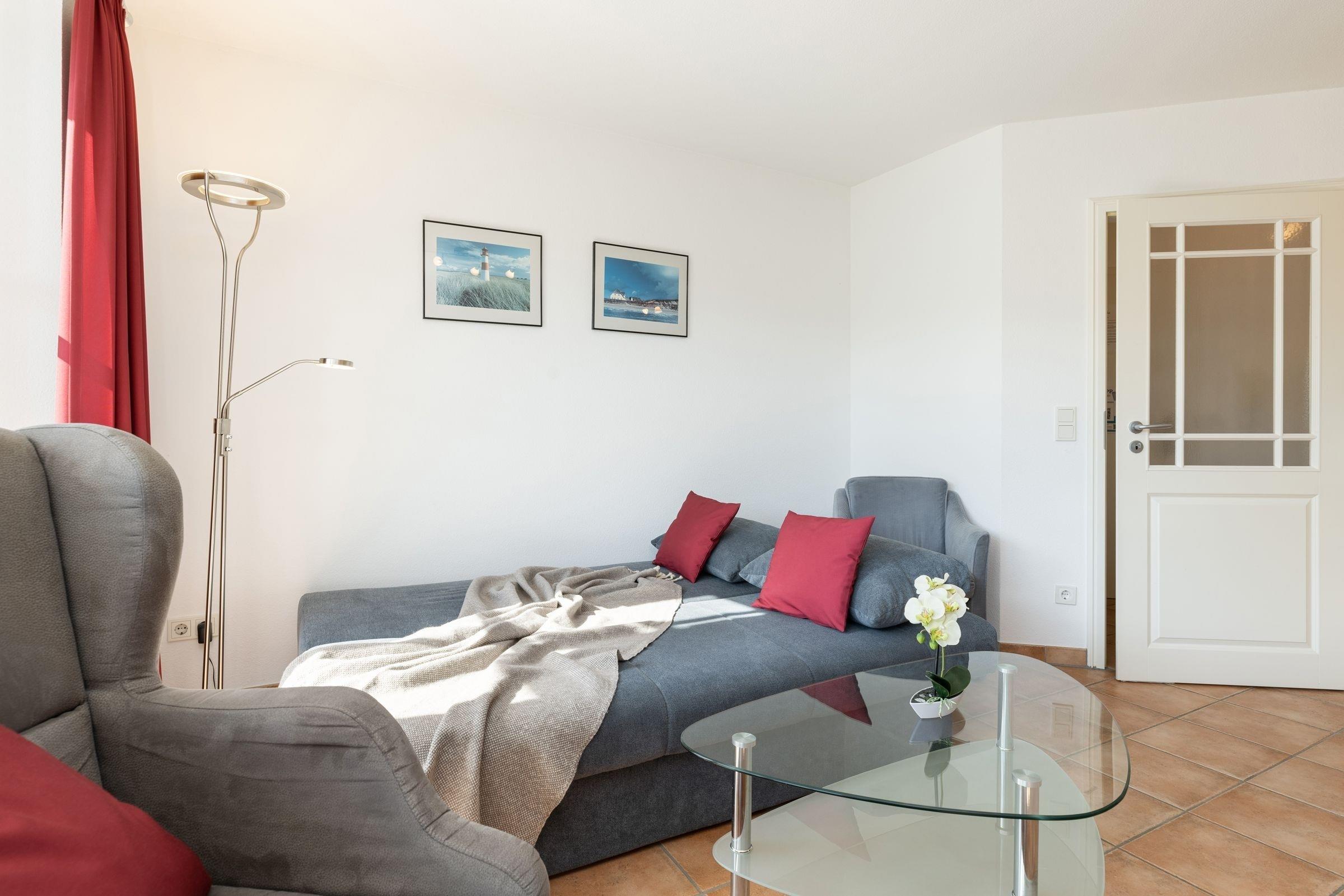 Das Wohnzimmer mit angrenzender voll ausgestatteter Wohnküche, ist mit einer gemütlichen Couch, einem großen Lesesessel mit Fußhocker, sowie einem Essplatz ausgestattet und lädt zum Verweilen, Ausspannen, Kochen und Genießen ein. Von hier haben Sie sogar einen kleinen Blick auf die schöne Ostsee. Genießen Sie zahlreiche Sonnenstunden auf dem großzügigen Balkon, die elektrische Markise spendet bei Bedarf ausreichend Schatten.