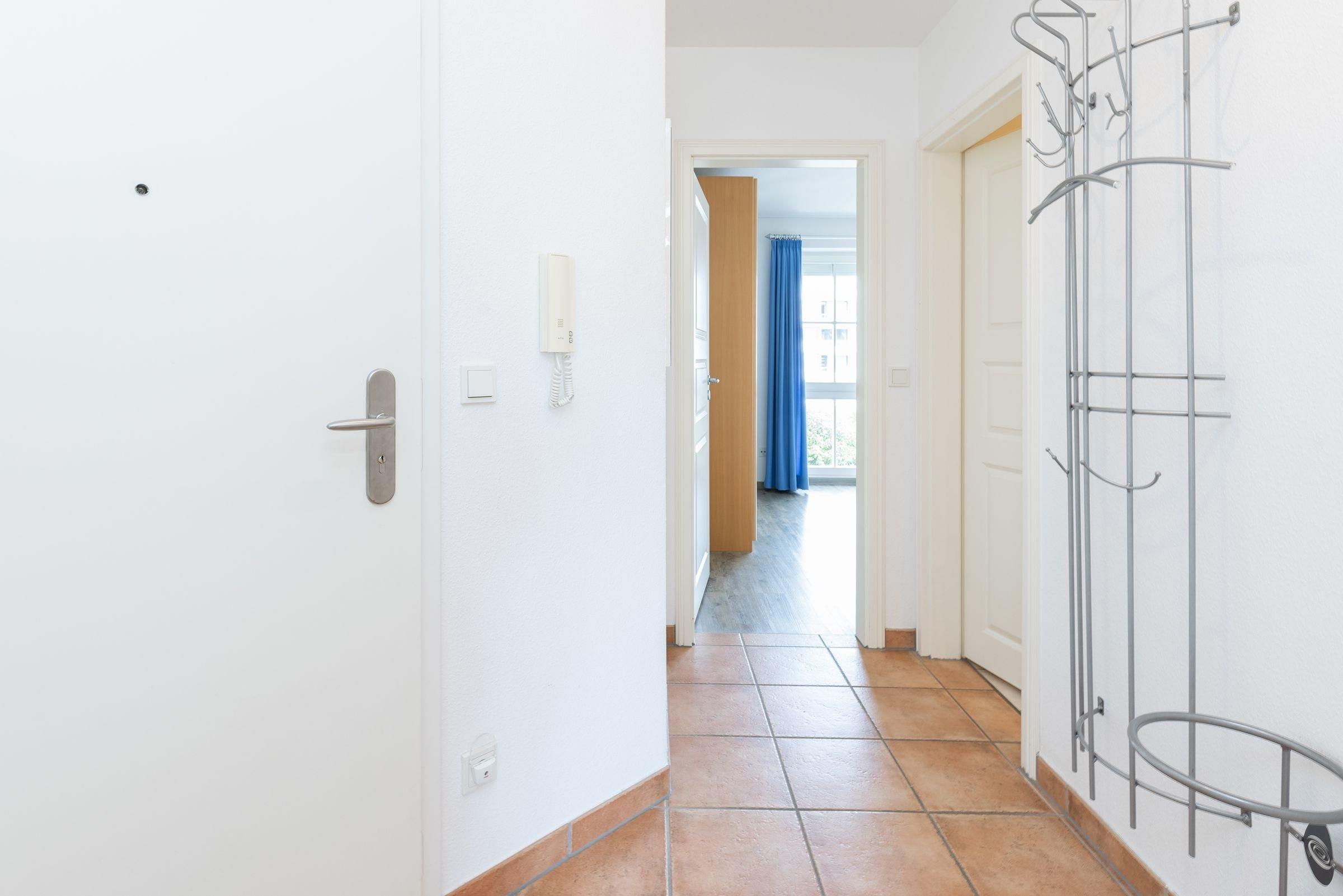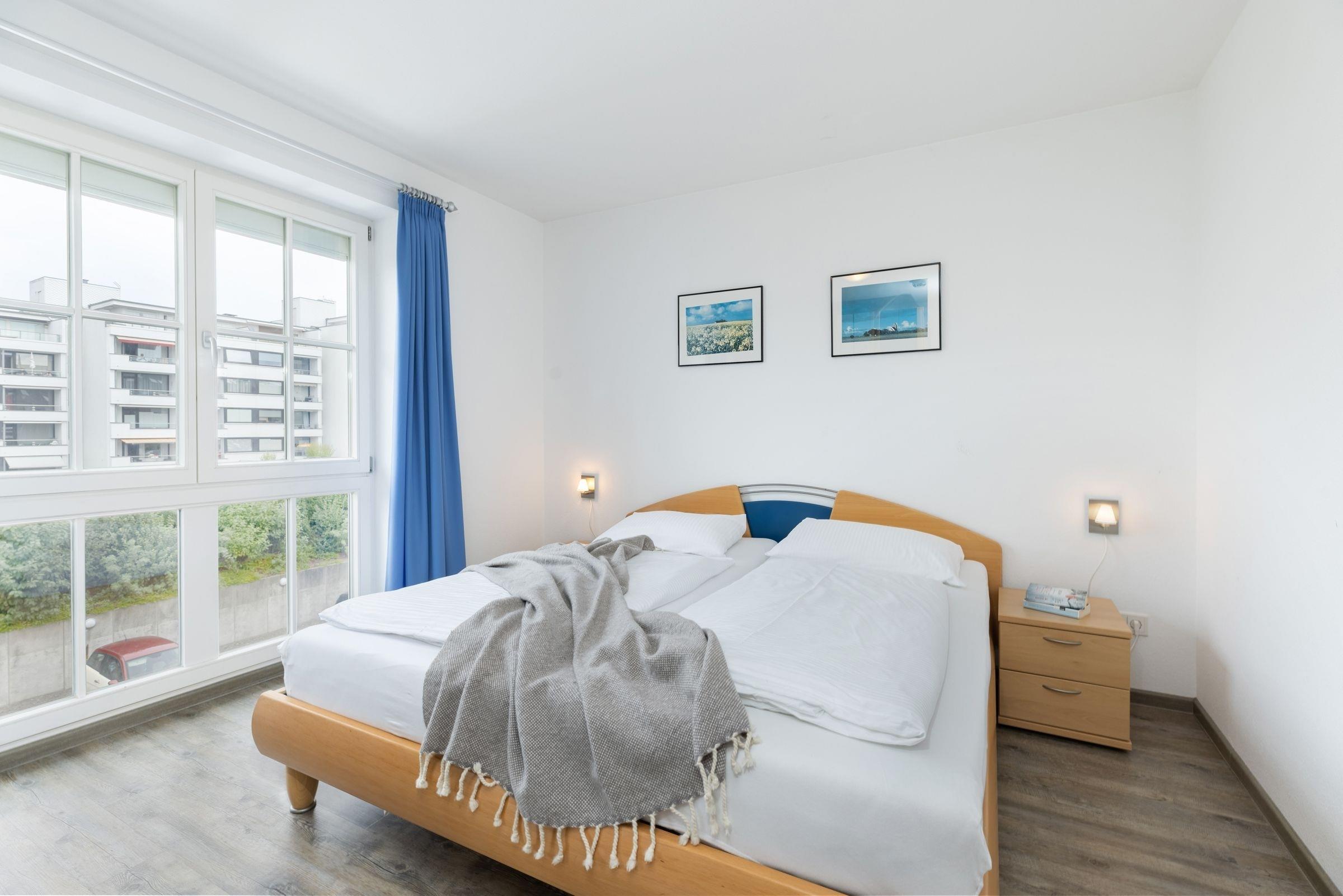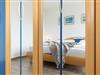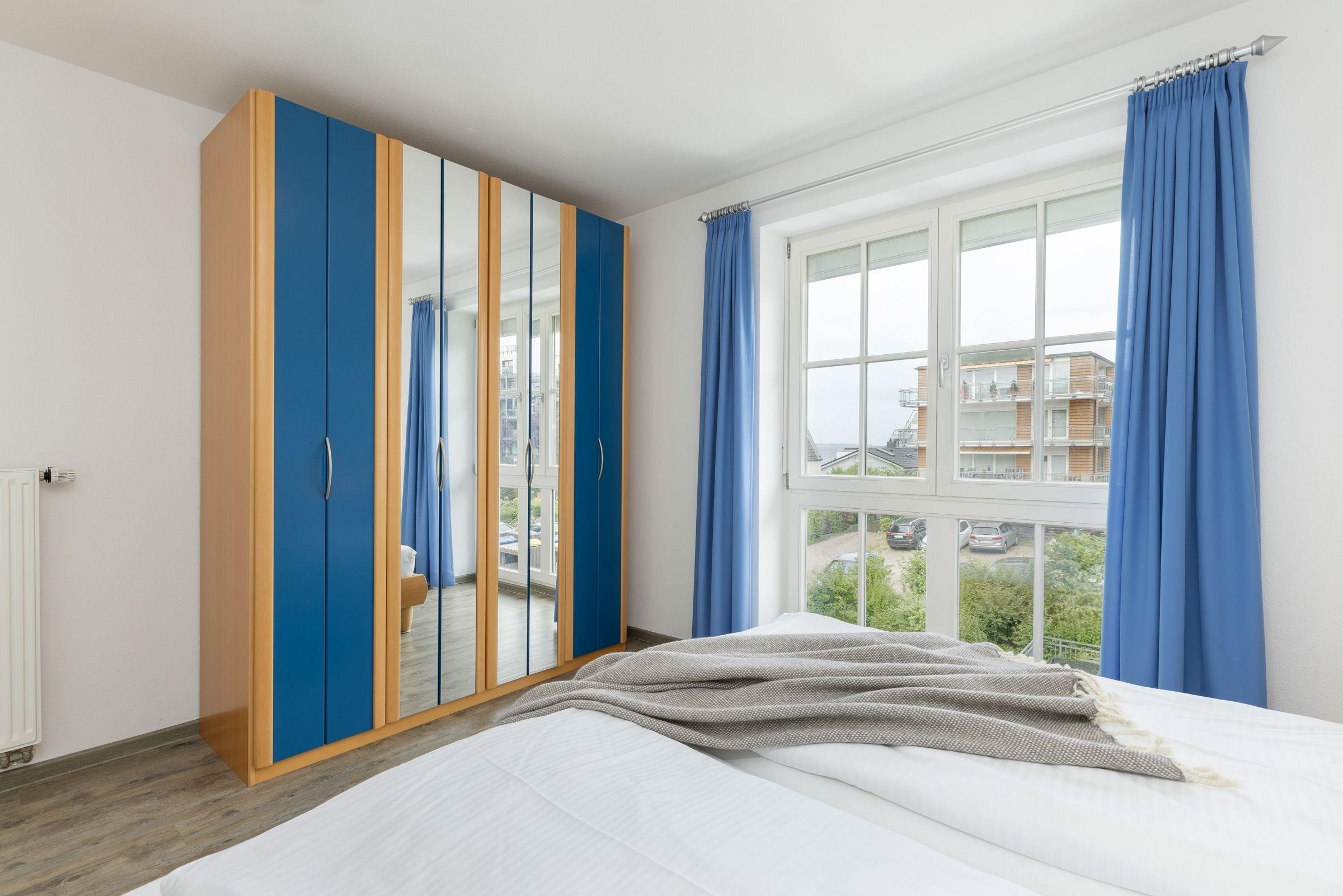 Durch den Flur gelangen Sie in das Schlafzimmer mit bodentiefen Fenstern, die für viel Licht sorgen. Im gemütlichen Doppelbett (2x 90x200 cm) verbringen Sie erholsame Nächte und der sehr großem Kleiderschrank mit Ganzkörperspiegel sorgt für reichlich Platz für Ihre Klamotten, Koffer und Souvenirs. Das moderne und geräumige Bad vervollständigt diese schöne Ferienwohnung.