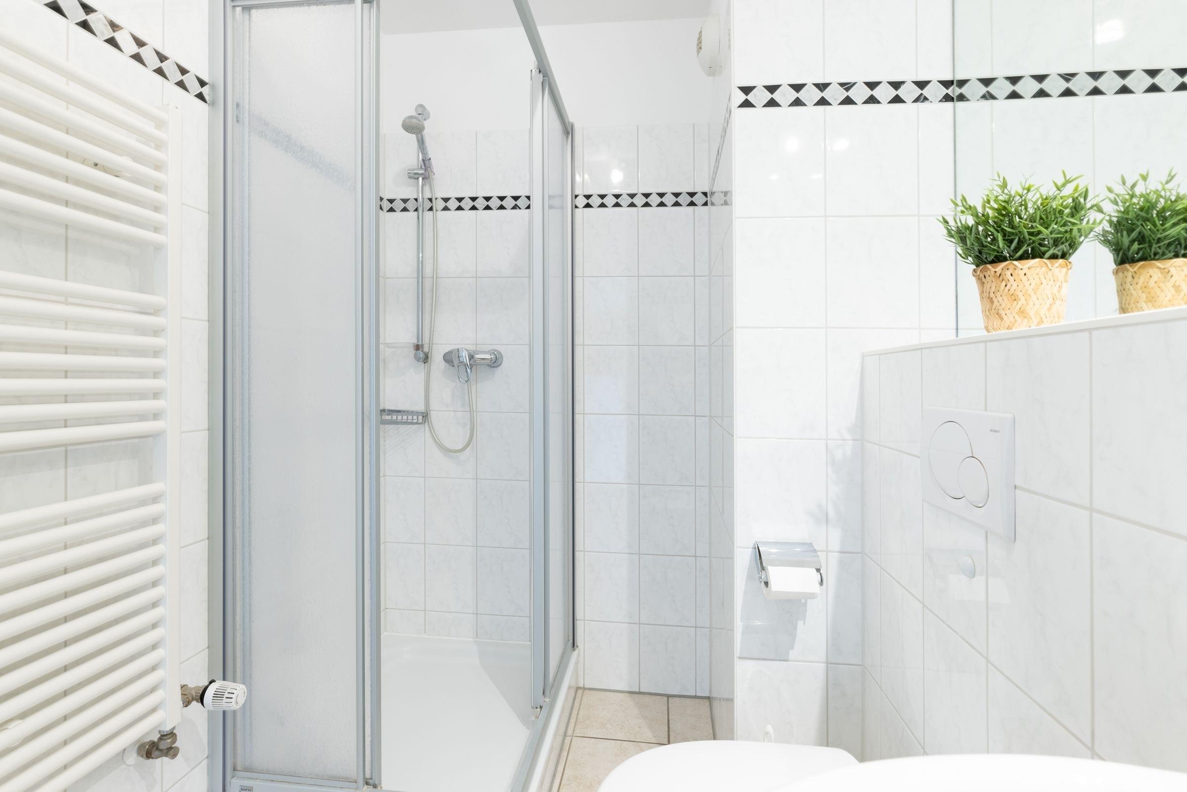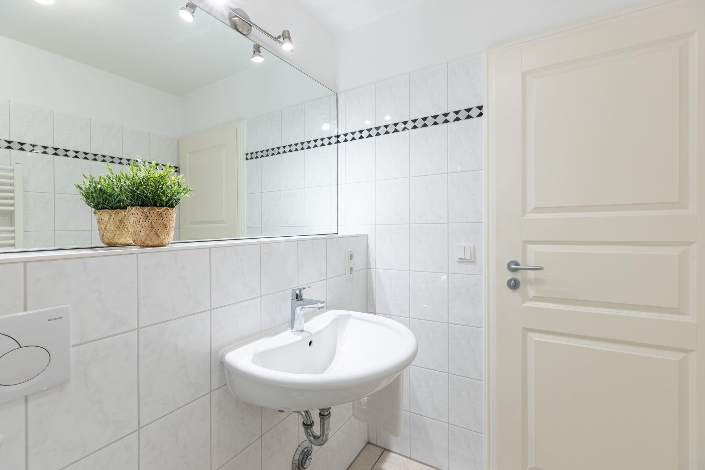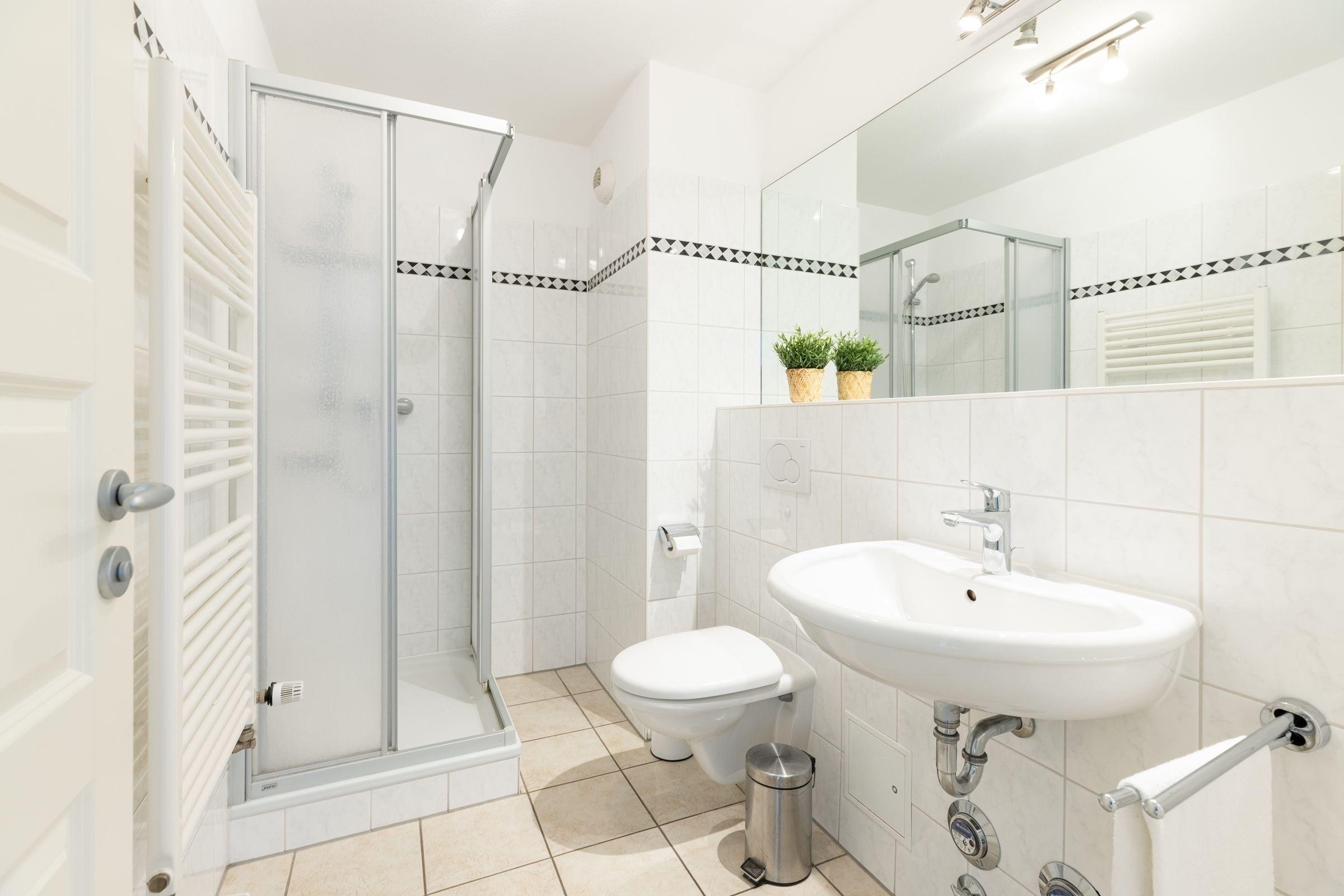 Durch den Flur gelangen Sie in das Schlafzimmer mit bodentiefen Fenstern, die für viel Licht sorgen. Im gemütlichen Doppelbett (2x 90x200 cm) verbringen Sie erholsame Nächte und der sehr großem Kleiderschrank mit Ganzkörperspiegel sorgt für reichlich Platz für Ihre Klamotten, Koffer und Souvenirs. Das moderne und geräumige Bad vervollständigt diese schöne Ferienwohnung.