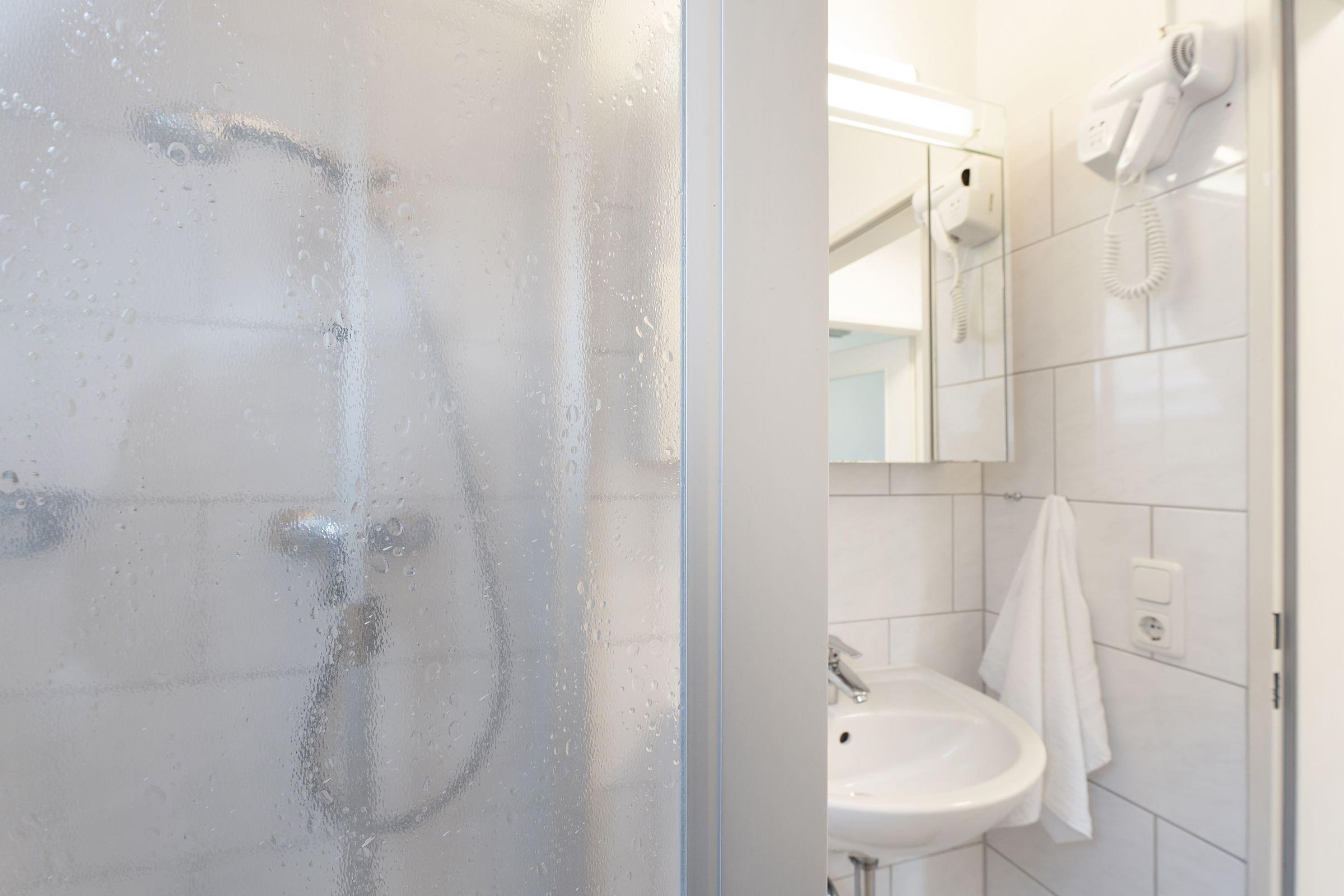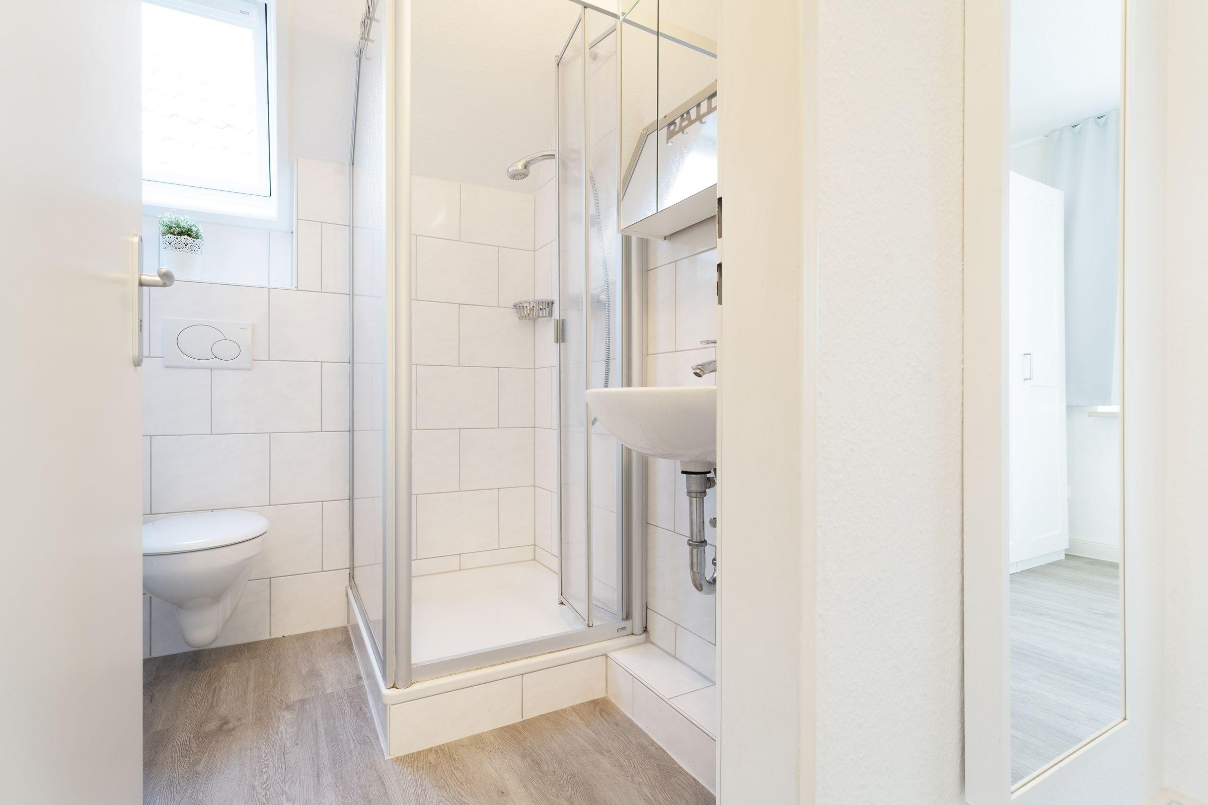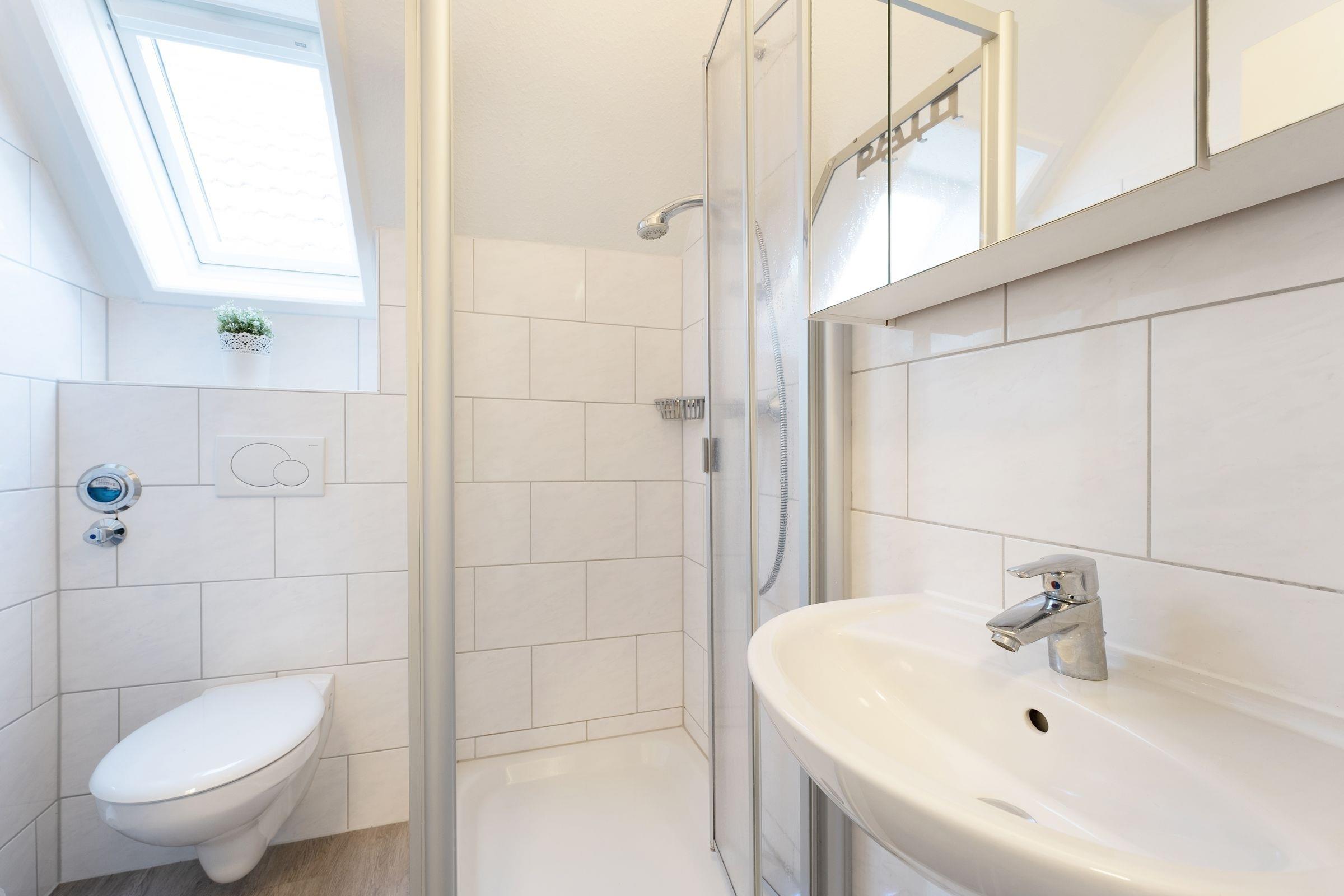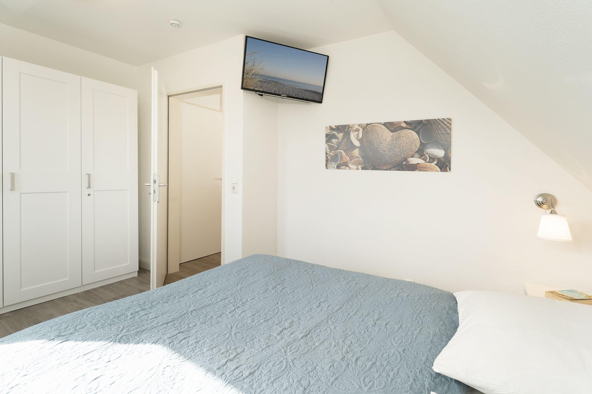 Vom Parkplatz sind es nur noch wenige Schritte und einige Treppenstufen hinauf in Ihre Ferienwohnung (ca. 44 qm) direkt unter dem Dach. Ein kleiner Flur, der alle Zimmer miteinander verbindet, empfängt Sie - treten Sie ein! Ihre Koffer können Sie gleich rechts im Schlafzimmer abstellen. Das Schlafzimmer ist eingerichtet mit einem Doppelbett (2x80x200 cm), Nachttischen und Kleiderschrank – bequem können Sie auch vom Bett aus Ihren Lieblingsfilm im Fernsehen zu Ende sehen. Im Schlafzimmer haben Sie Platz um ein Kindereisebett aufzustellen. Links daneben ist das tageslichthelle Duschbad mit Handtuchwärmer und Föhn.