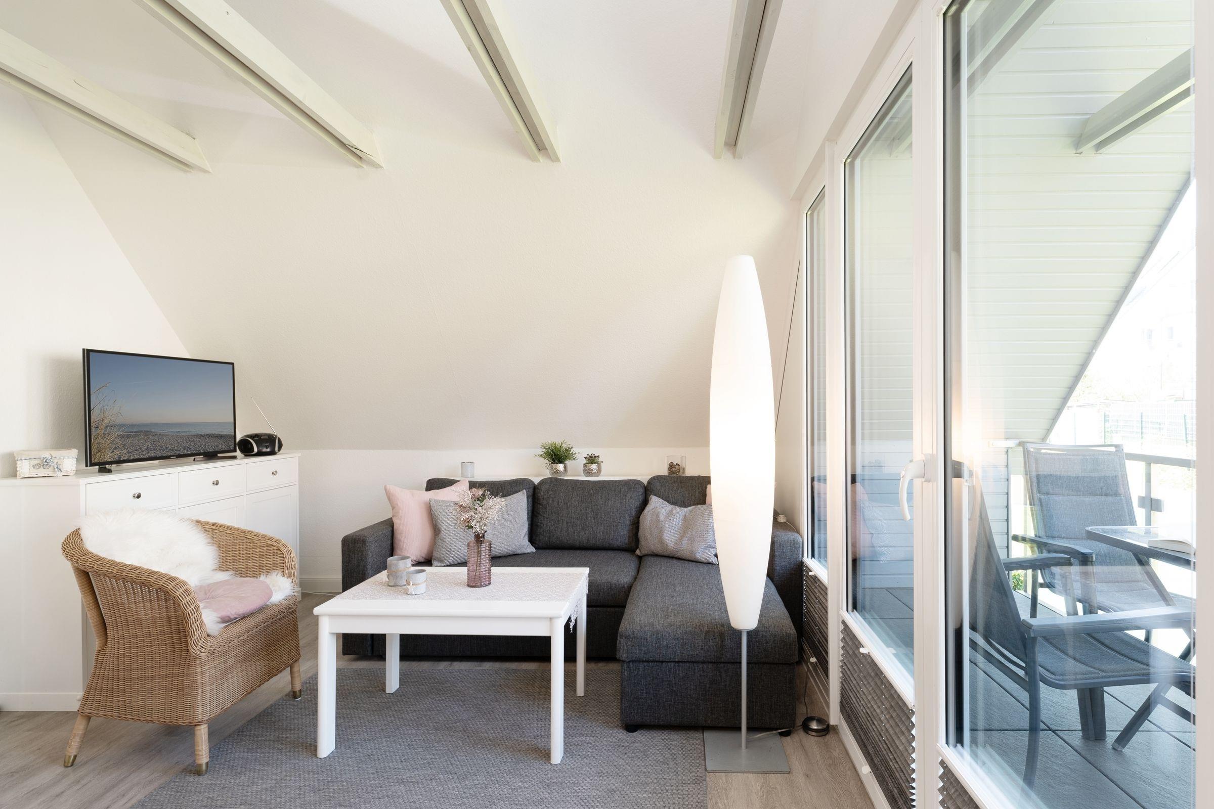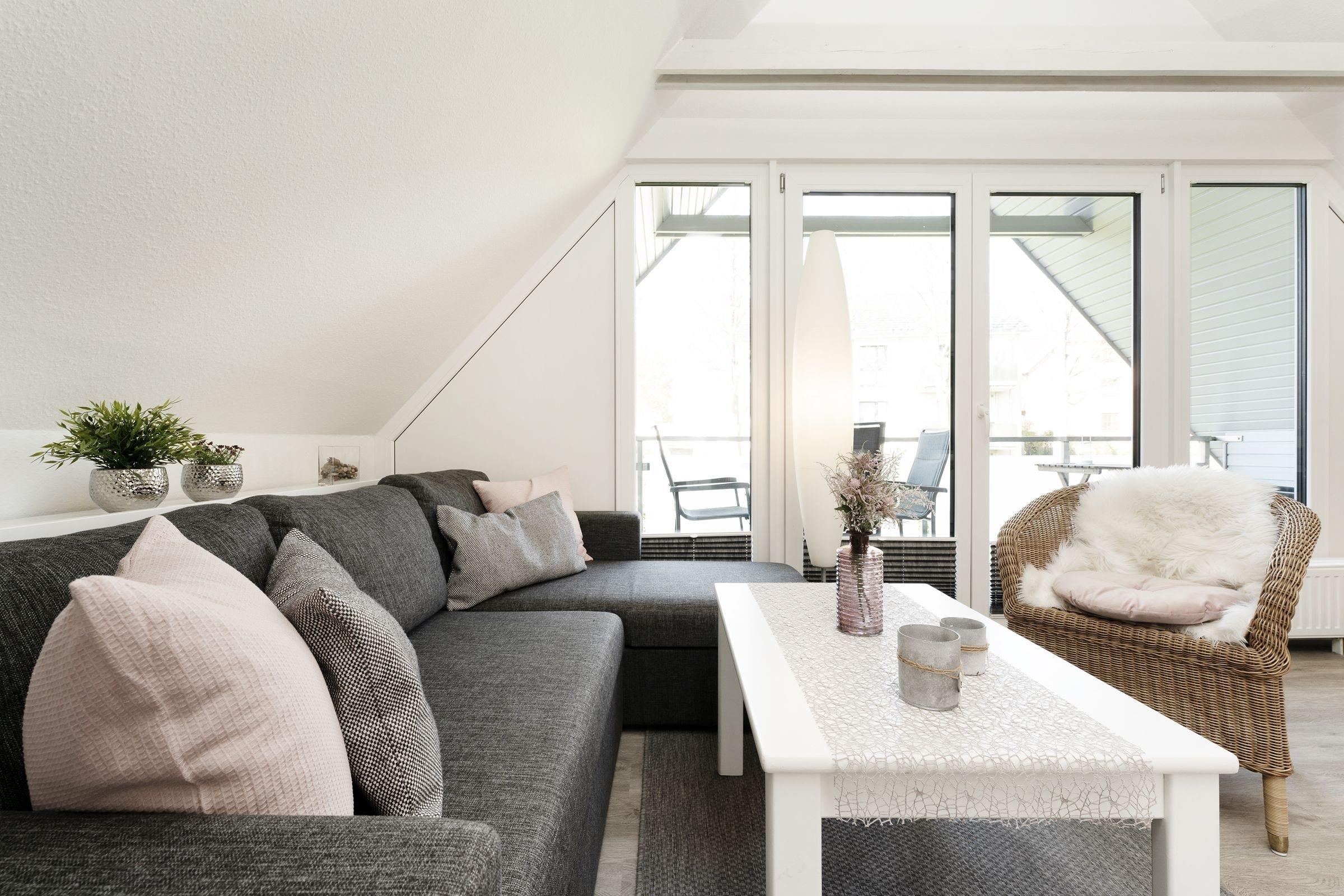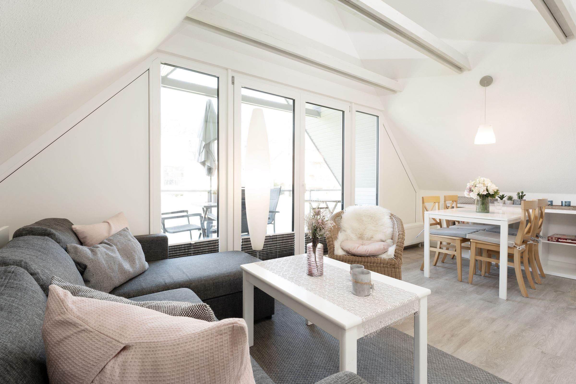 Kuschelig ist das Wohnzimmer mit Küchenzeile und Essplatz. Die bodentiefen Fensterfronten und die Dachschrägen mit freiliegenden Dachbalken lassen diesen Raum besonders wirken. Eine Sofalandschaft lädt zum Entspannen nach einem erlebnisreichen Urlaubstag ein. Mühelos können Sie die Eckcouch zur Nacht in einen bequemen Schlafplatz (160x200 cm) für 2 Personen verwandeln. Auf dem überdachten Balkon mit Süd-Ost-Ausrichtung lässt es sich am Morgen herrlich in Ruhe frühstücken oder den Abend gemütlich ausklingen lassen. Die Küche ist mit allem Komfort ausgestattet, hier können Sie je nach Lust und Laune eine Kleinigkeit oder ein kleines Menü zubereiten. Praktisch ist auch der Abstellraum im Flur, neben Alltagshelfern können Sie hier Ihre Koffer oder Strandutensilien abstellen.