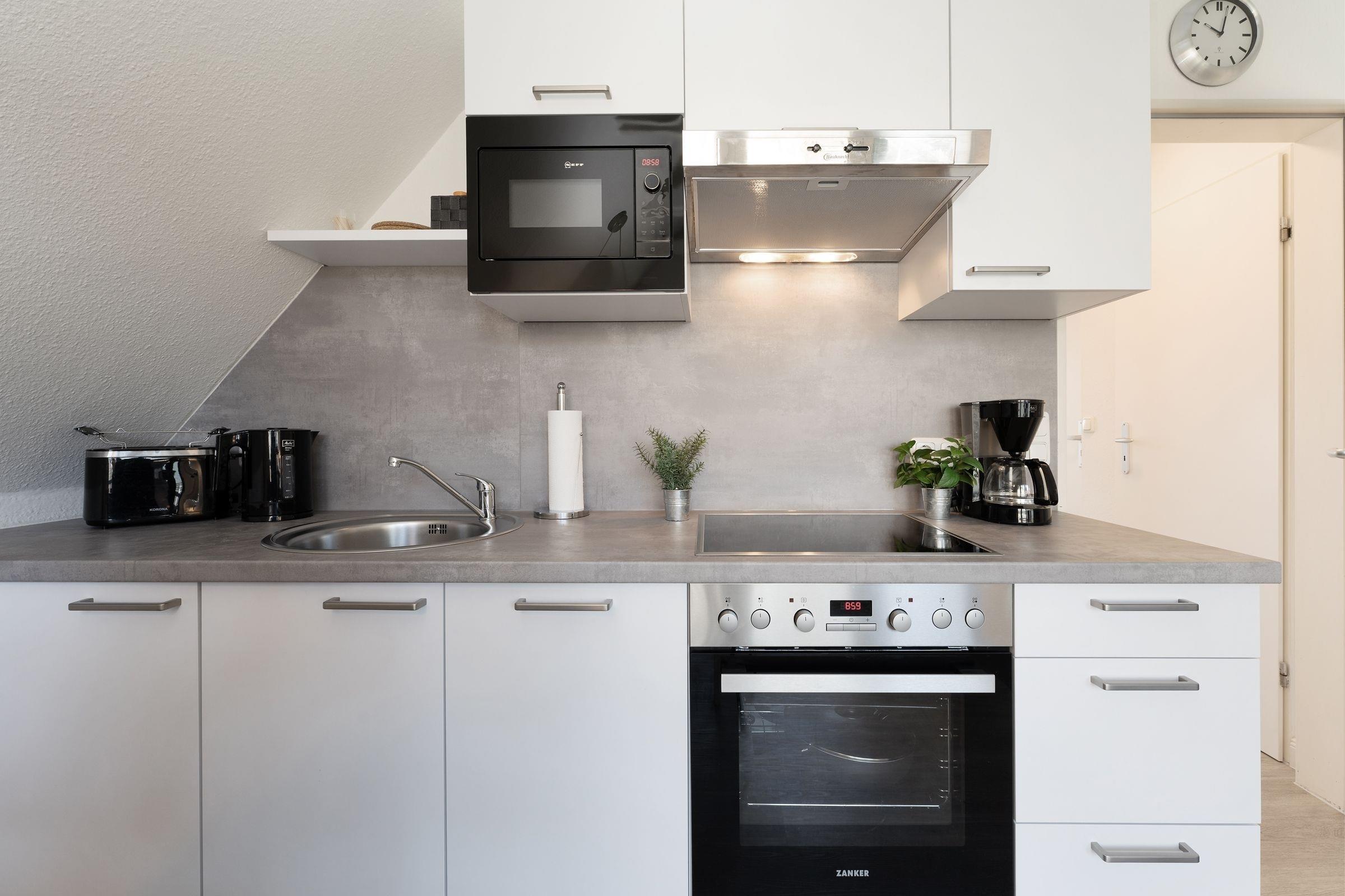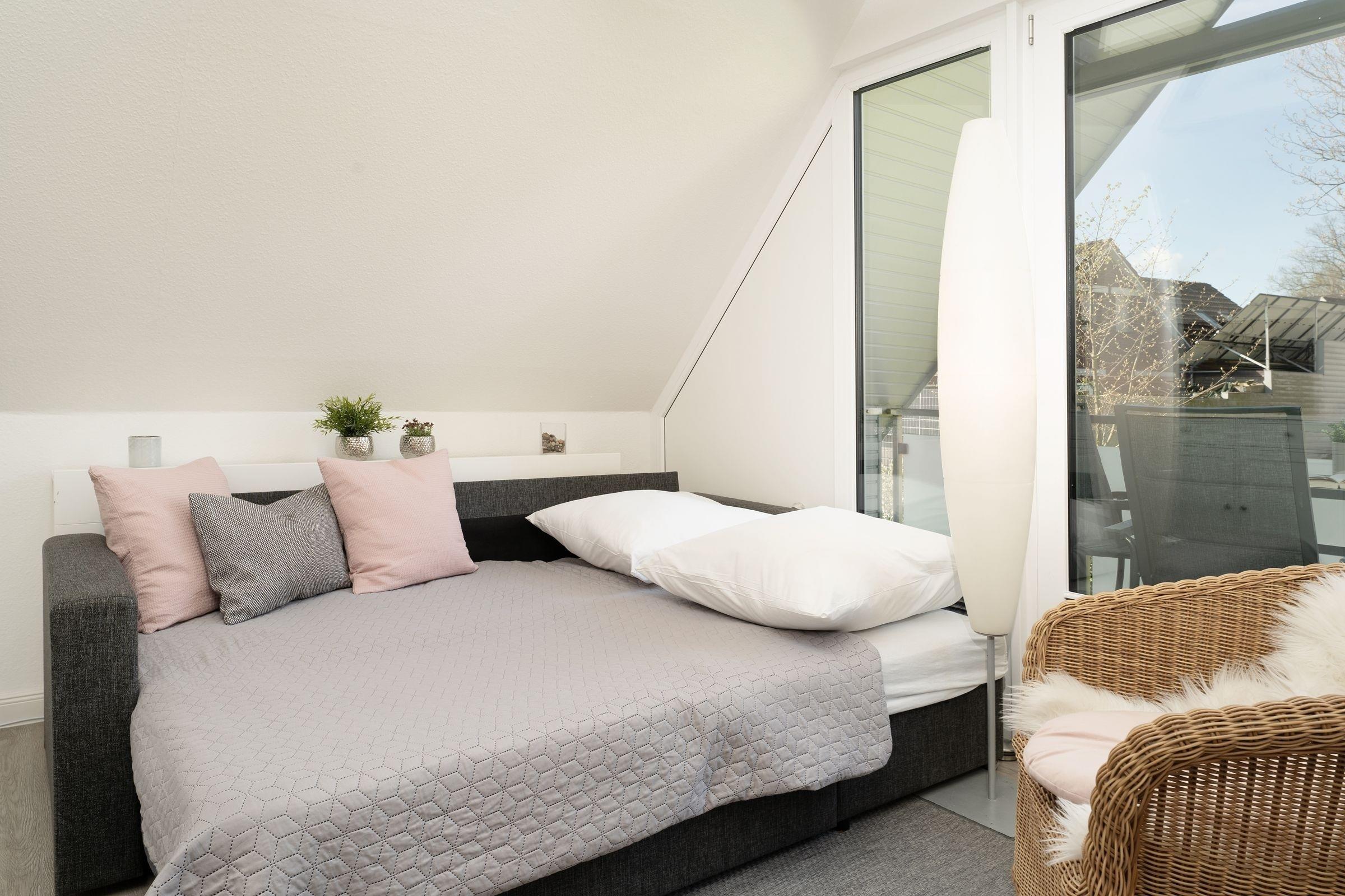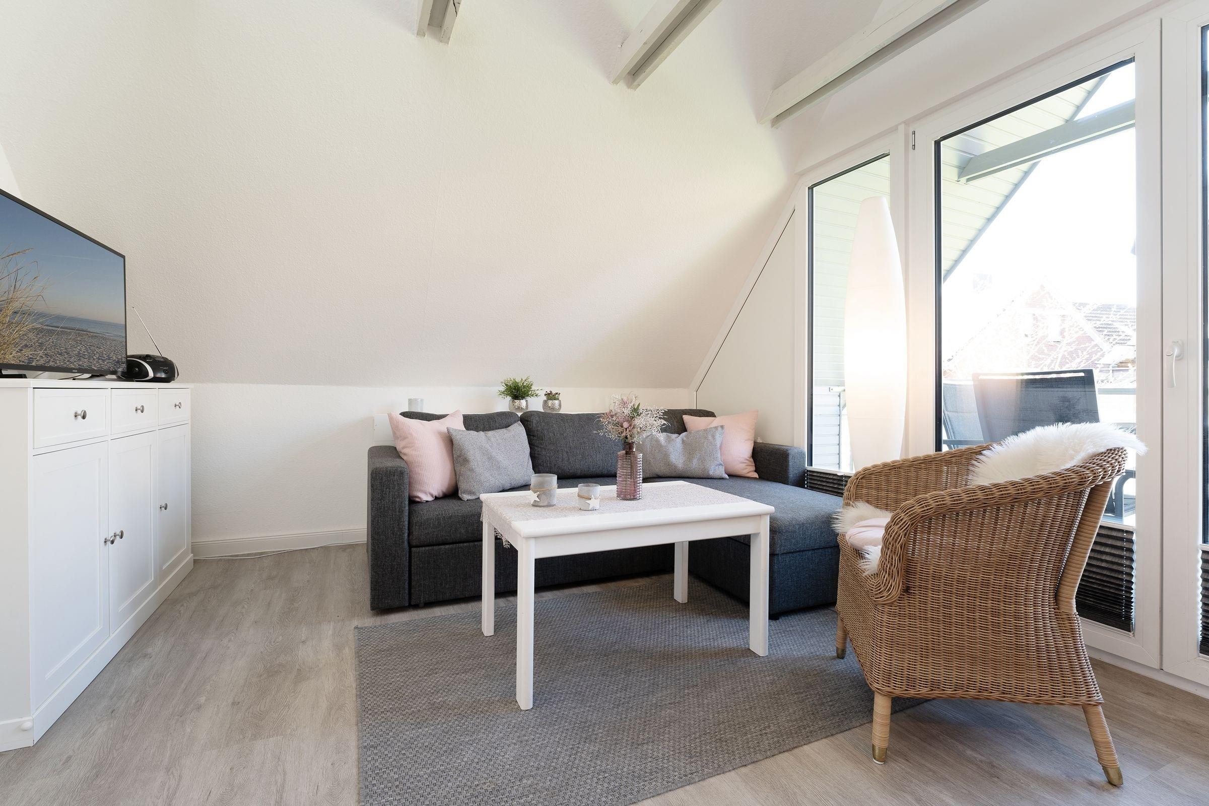 Kuschelig ist das Wohnzimmer mit Küchenzeile und Essplatz. Die bodentiefen Fensterfronten und die Dachschrägen mit freiliegenden Dachbalken lassen diesen Raum besonders wirken. Eine Sofalandschaft lädt zum Entspannen nach einem erlebnisreichen Urlaubstag ein. Mühelos können Sie die Eckcouch zur Nacht in einen bequemen Schlafplatz (160x200 cm) für 2 Personen verwandeln. Auf dem überdachten Balkon mit Süd-Ost-Ausrichtung lässt es sich am Morgen herrlich in Ruhe frühstücken oder den Abend gemütlich ausklingen lassen. Die Küche ist mit allem Komfort ausgestattet, hier können Sie je nach Lust und Laune eine Kleinigkeit oder ein kleines Menü zubereiten. Praktisch ist auch der Abstellraum im Flur, neben Alltagshelfern können Sie hier Ihre Koffer oder Strandutensilien abstellen.