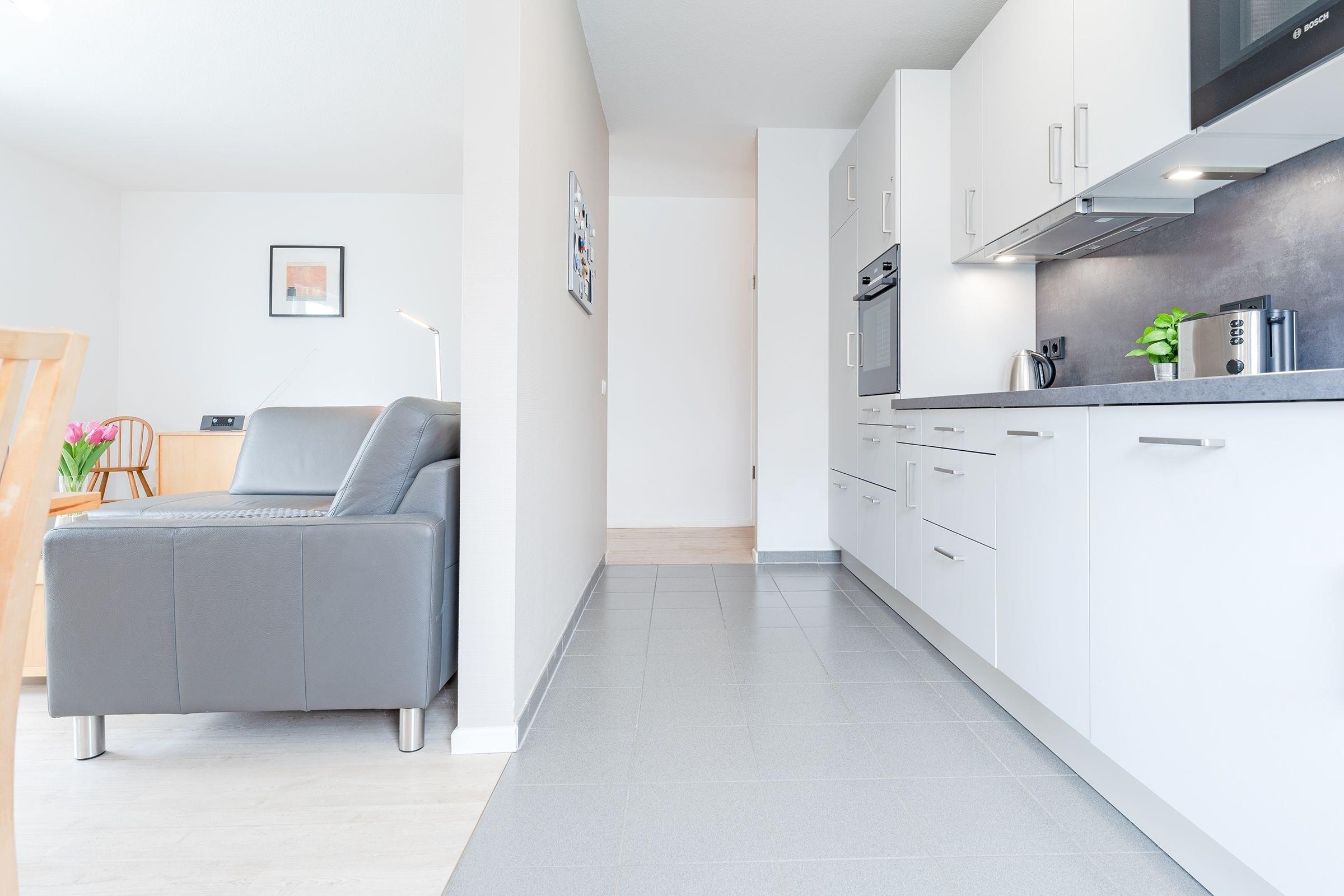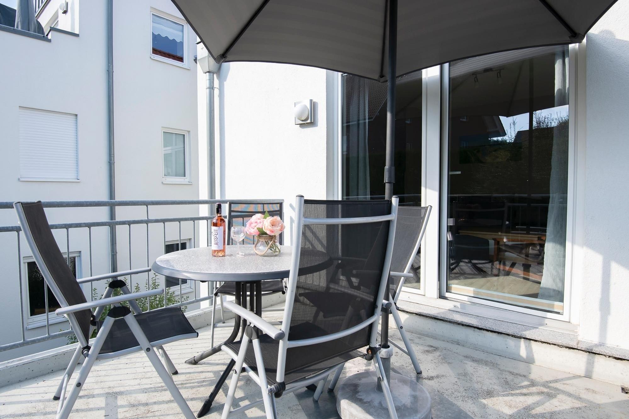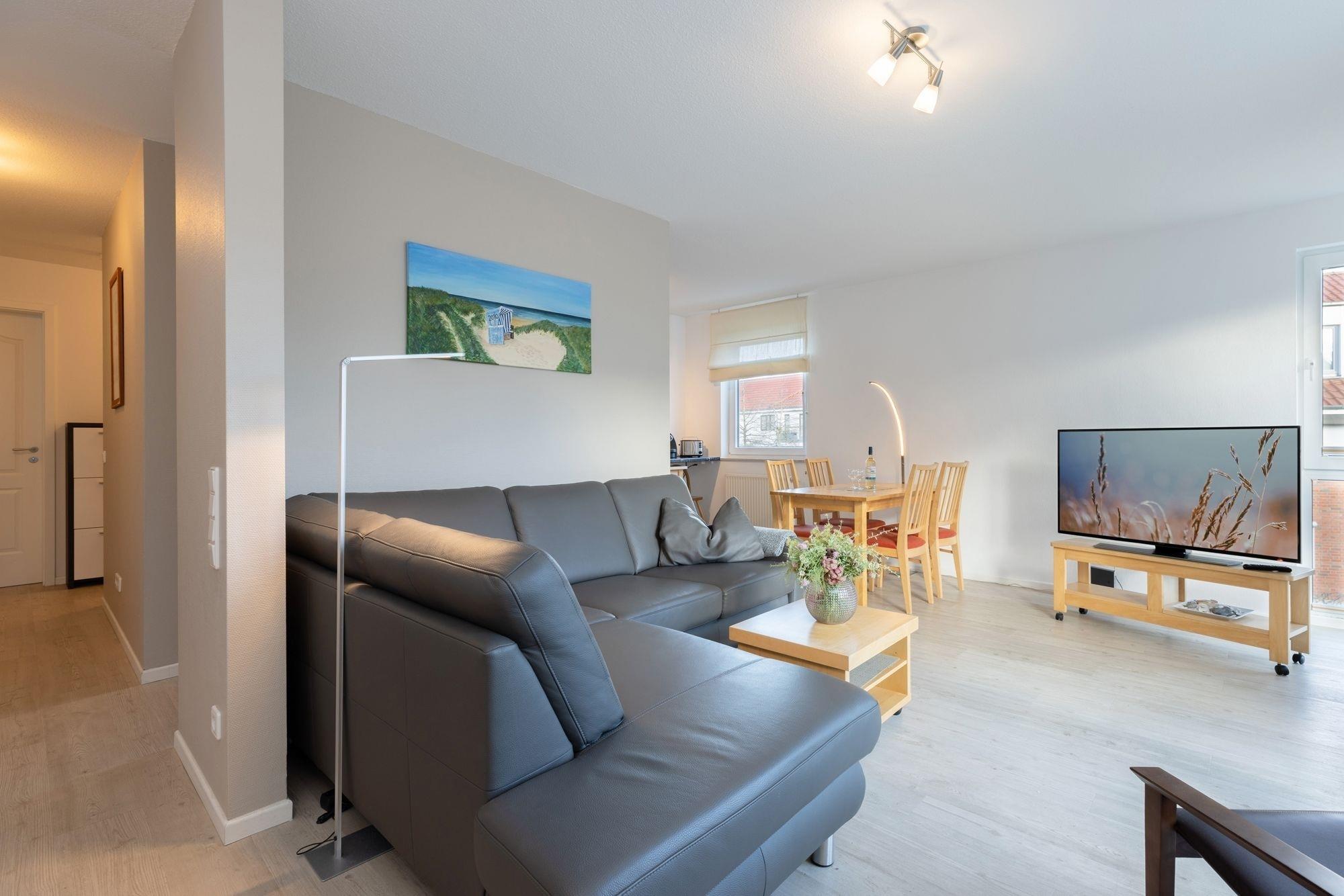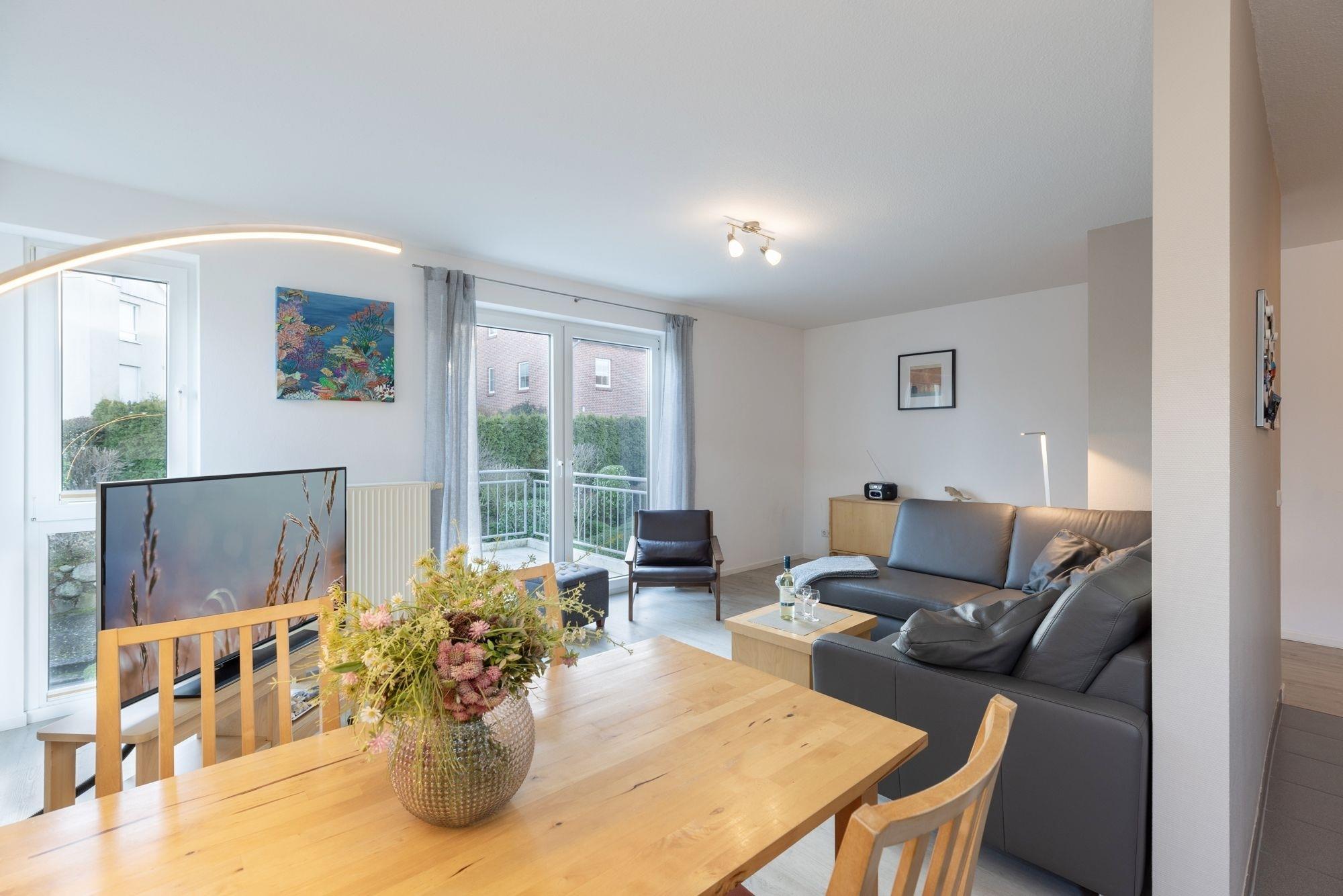 Die Ausstattung dieser Wohnung ist hochwertig, das Wohnambiente klar und modern. Sie wohnen komfortabel auf insgesamt 63 m². Aufgeteilt in zwei Schlafräume für jeweils 2 Personen, offener Wohnraum mit gemütlicher Sitzecke und Ausblick ins Grüne. Die in den Wohnbereich integrierte Designerküche mit angrenzendem Essplatz begeistert mit guter Ausstattung wie 4-Platten-Ceranherd, Backofen, Mikrowelle und Spülmaschine. Der Wohnraum ist hell und großzügig mit gemütlichem Ecksofa, Sessel und großem Flatscreen TV eingerichtet. Vom Wohnraum aus gelangen Sie auf den großzügigen Balkon mit einer zusätzlichen Outdoor-Wohnfläche von 10 m². Im tageslichthellen Badezimmer sorgen eine Badewanne, WC, Handtuch- sowie Fussbodenheizung und eine eigene Waschmaschine für gute Laune. Ein Schlafzimmer mit Doppelbett (2x 90x200 cm), zweitem TV-Gerät und das weitere Schlafzimmer mit französischem Bett (140x200 cm) vervollständigen dieses schöne Urlaubsdomizil.