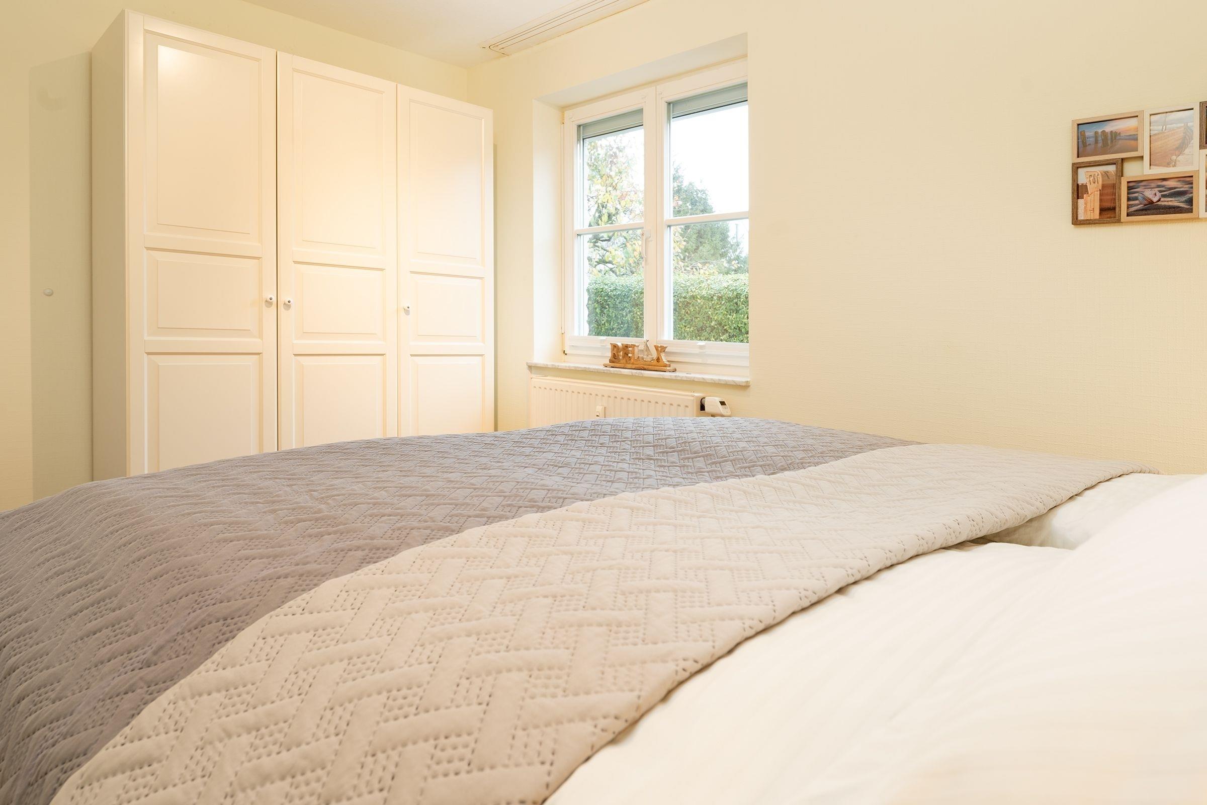 Schlafzimmer: 1 Doppelbett (2x 90x200 cm), Kleiderschrank, Verdunkelung: Außenjalousie elektrisch