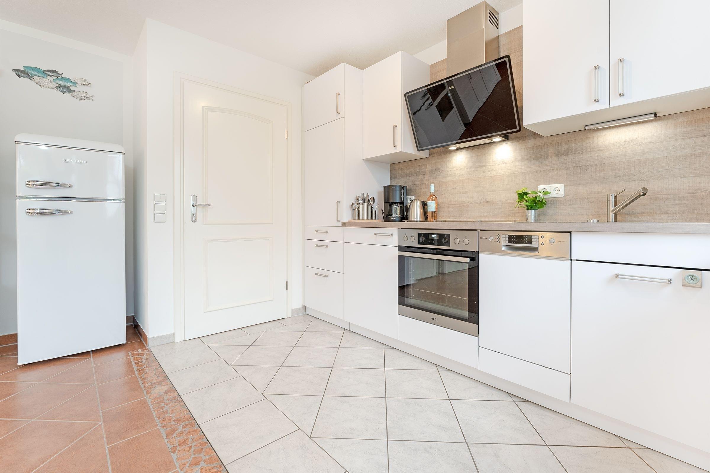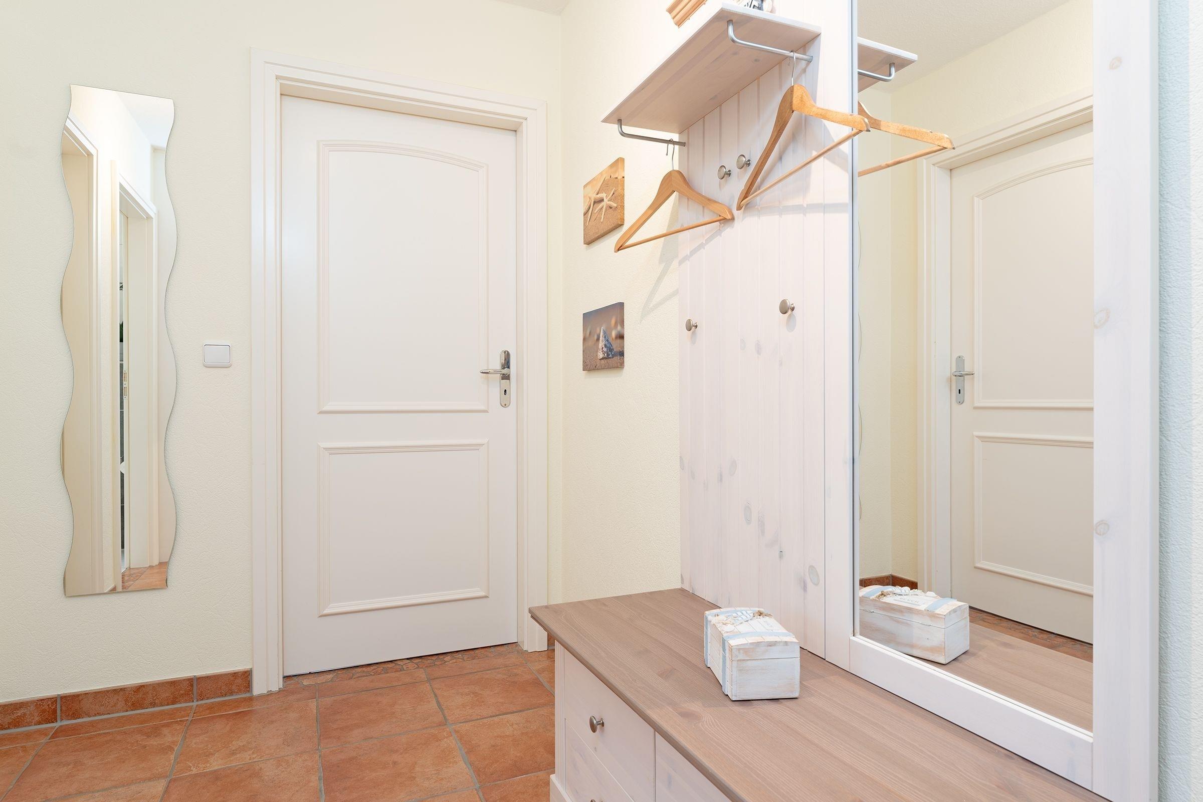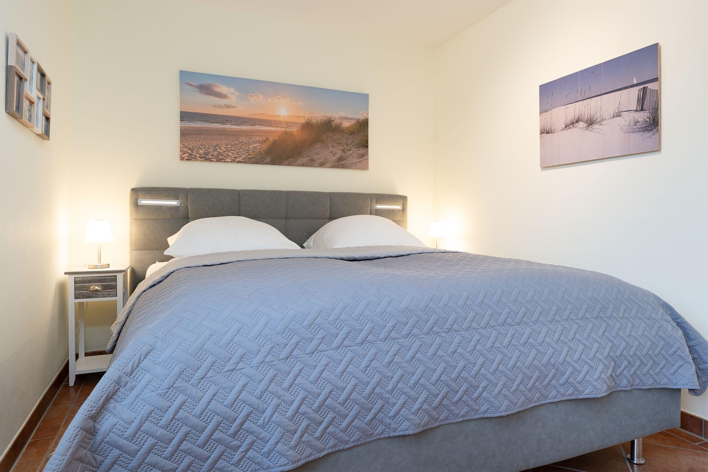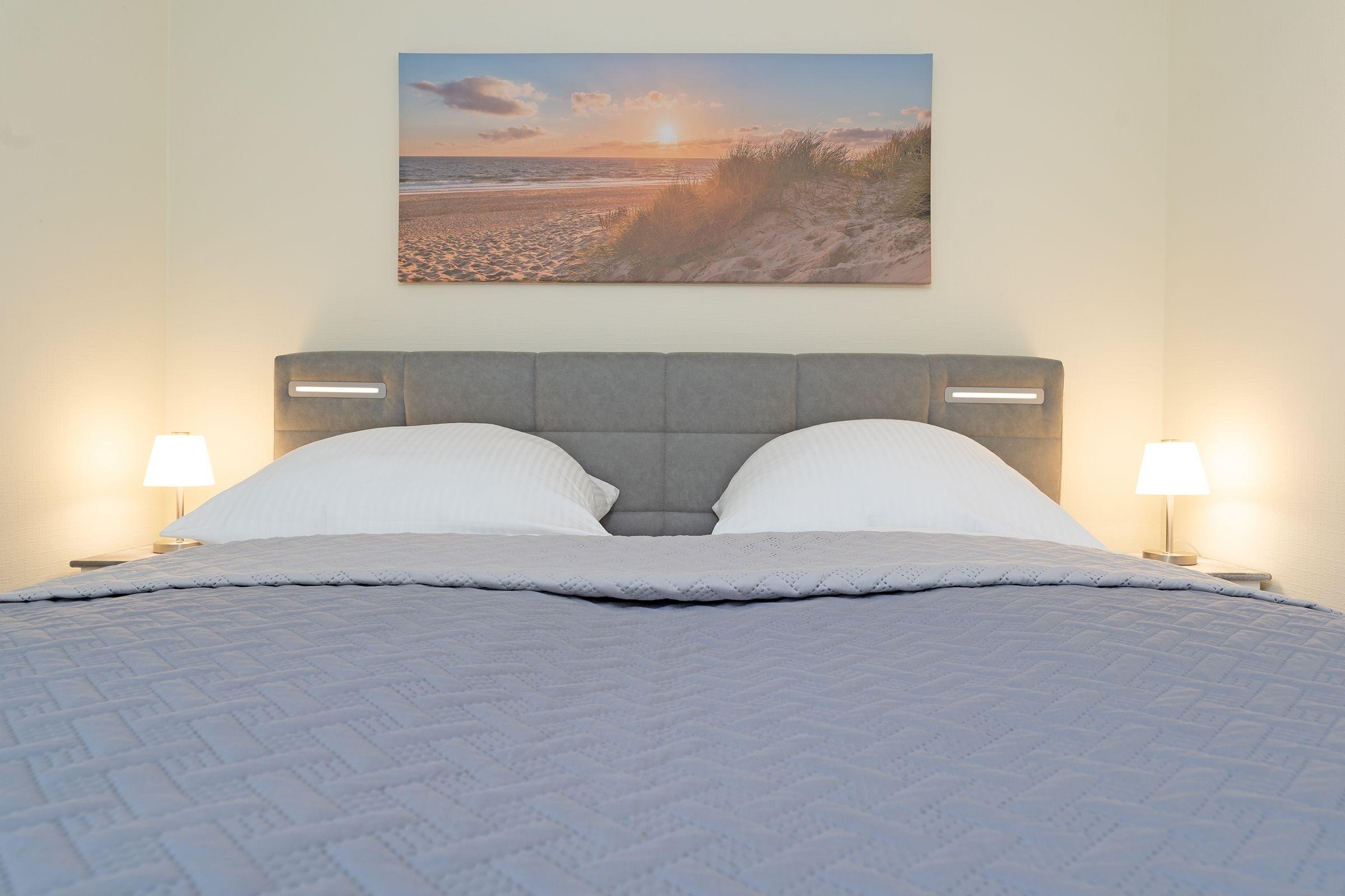 Vom geräumigen Flur aus gelangen Sie in den hell gestalteten Wohnraum mit offener Küchenzeile. Ihre Mahlzeiten können Sie, je nach Jahreszeit, am Esstisch oder wunderbar auf einer der beiden geschützten Terrassen einnehmen. Beide Terrassen sind möbliert und bieten durch elektrische Markisen ausreichend Sonnenschutz. Herrlich entspannen lässt es sich auf der kuscheligen Couch vor dem Fernseher. Das Schlafzimmer ist mit einem gemütlichen Doppelbett (2x 90x200 cm) ausgestattet, im Kleiderschrank können Sie prima Ihre Urlaubsgarderobe verstauen. Durch elektrische Außenrolladen lässt sich das Schlafzimmer angenehm verdunkeln. Das große tageslichthelle Badezimmer mit Badewanne und Duschsystem rundet die schöne Ferienwohnung ab.