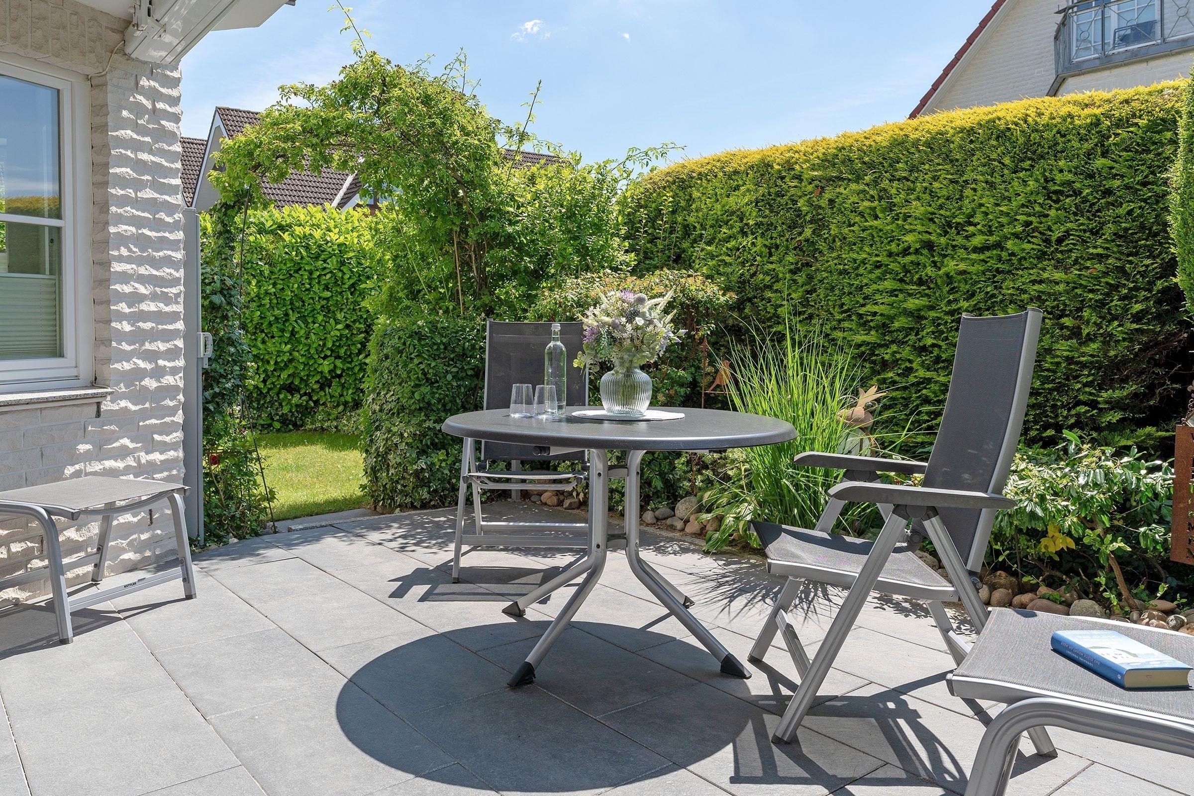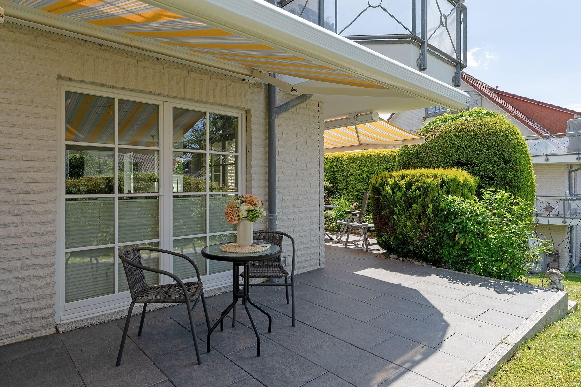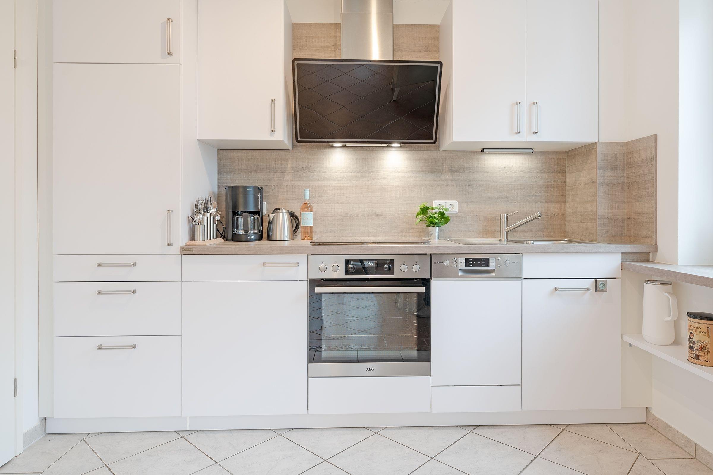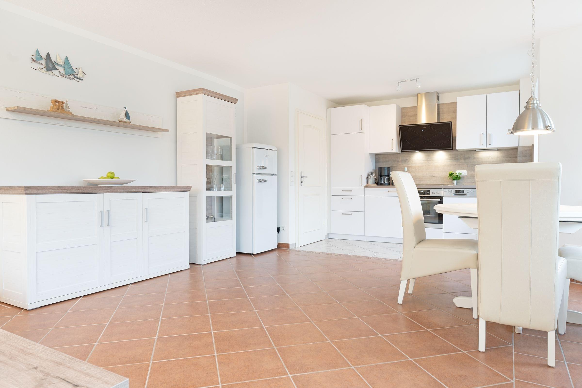 Vom geräumigen Flur aus gelangen Sie in den hell gestalteten Wohnraum mit offener Küchenzeile. Ihre Mahlzeiten können Sie, je nach Jahreszeit, am Esstisch oder wunderbar auf einer der beiden geschützten Terrassen einnehmen. Beide Terrassen sind möbliert und bieten durch elektrische Markisen ausreichend Sonnenschutz. Herrlich entspannen lässt es sich auf der kuscheligen Couch vor dem Fernseher. Das Schlafzimmer ist mit einem gemütlichen Doppelbett (2x 90x200 cm) ausgestattet, im Kleiderschrank können Sie prima Ihre Urlaubsgarderobe verstauen. Durch elektrische Außenrolladen lässt sich das Schlafzimmer angenehm verdunkeln. Das große tageslichthelle Badezimmer mit Badewanne und Duschsystem rundet die schöne Ferienwohnung ab.