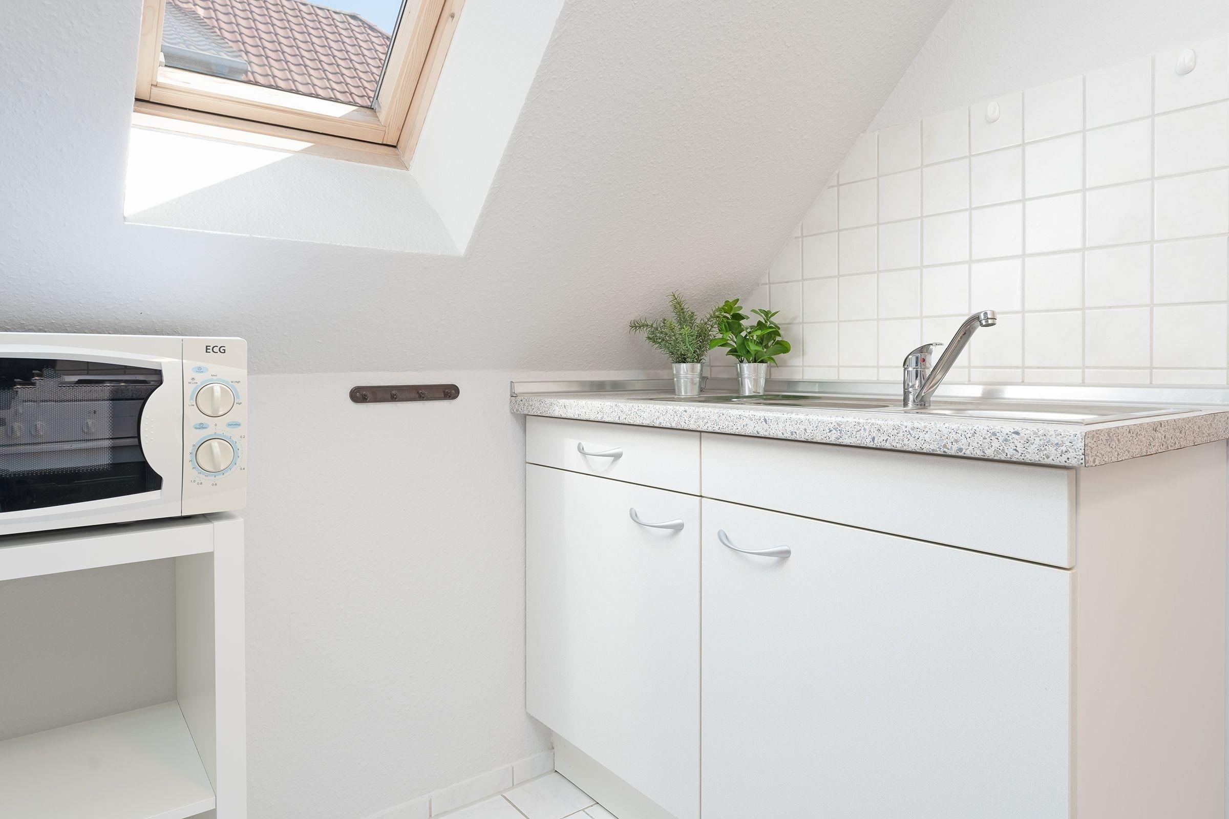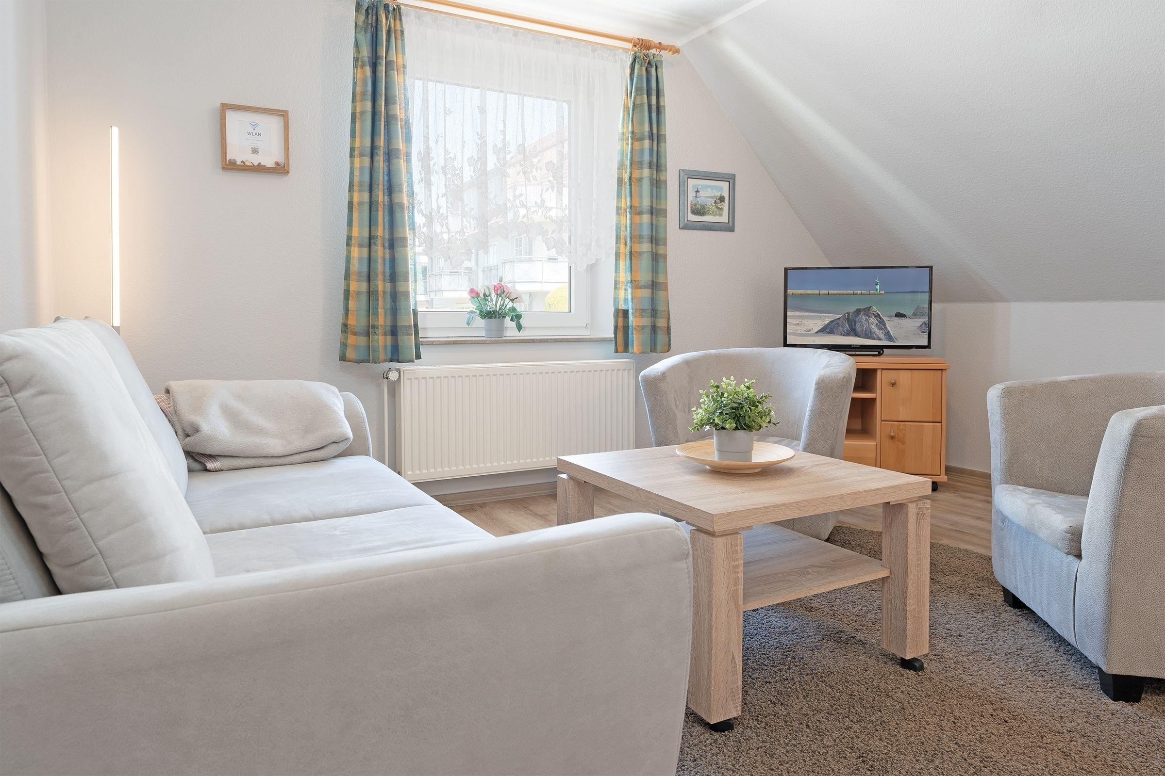 Vom Wohnzimmer mit gemütlicher und moderner Schlafcouch (140x200 cm), Flat-TV und Radio, sowie Essecke für 4 Personen gelangen Sie in das großzügige, helle Schlafzimmer mit Doppelbett (180x200 cm) und geräumigem Kleiderschrank für all Ihre Urlaubsutensilien. Die separate Küche ist mit Backofen, Herd, Kaffeemaschine, Mikrowelle, Toaster und Wasserkocher voll ausgestattet und lädt Sie ein, interessante Gerichte zu kreieren und zu zaubern. Das hell geflieste Duschbad rundet diese Ferienwohnung ab. Der WLAN-Anschluss ist inklusive.