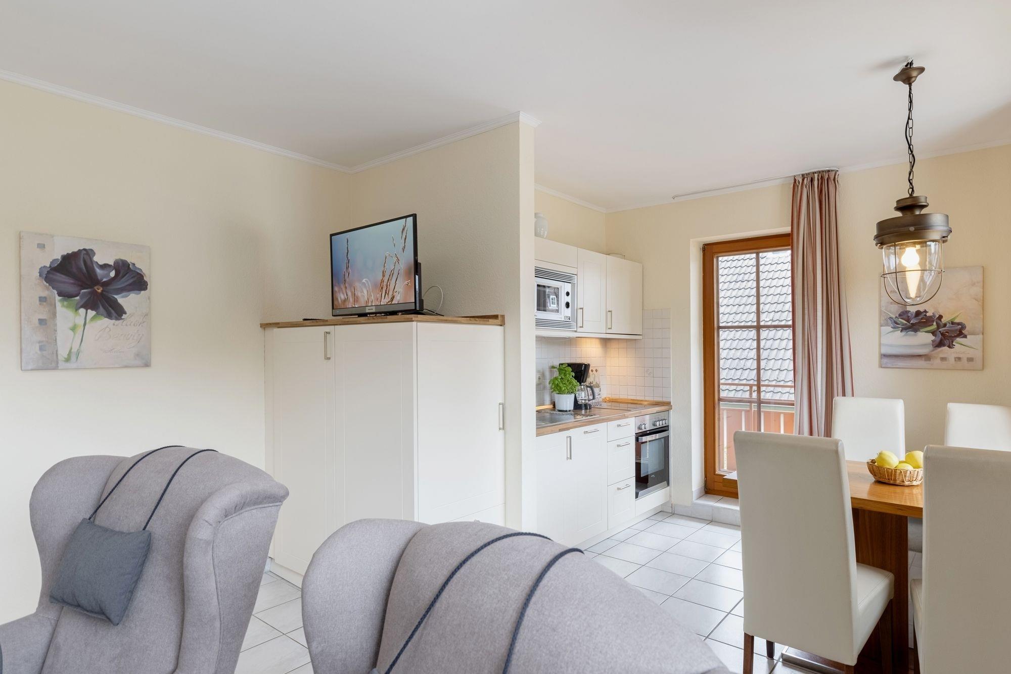 Das freundliche Wohnzimmer ist mit einer offenen Küche ausgestattet. Der Esstisch lädt zum gemeinsamen Essen ein.