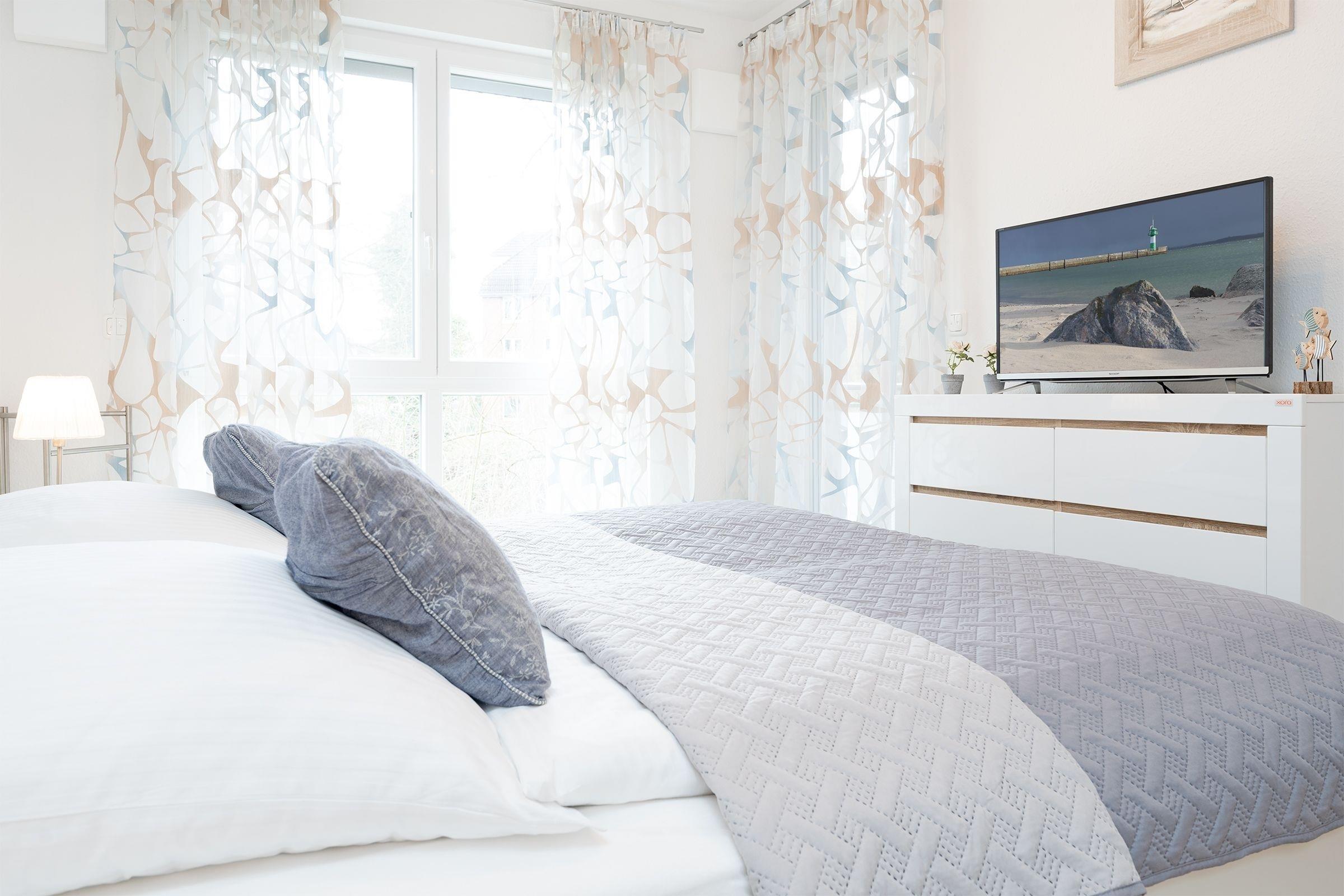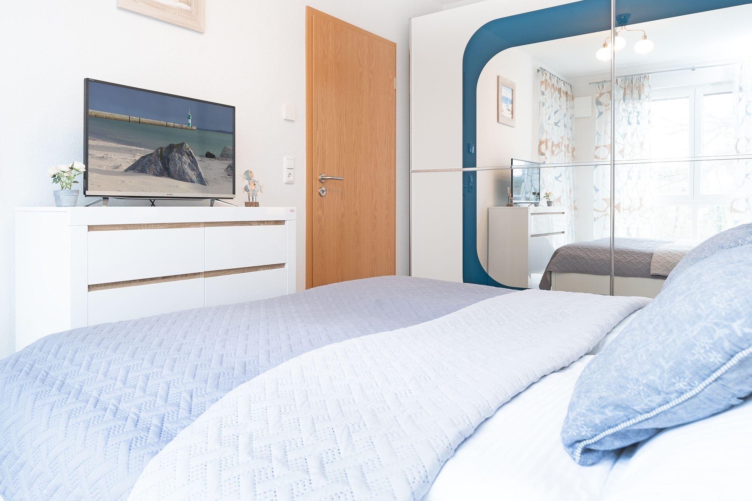 Schlafzimmer: 1 Doppelbett (2x 90x200 cm), Kinderreisebett passt ins Schlafzimmer zwischen Bett und Fenster, Verdunkelung (elektr. Außenrollläden)