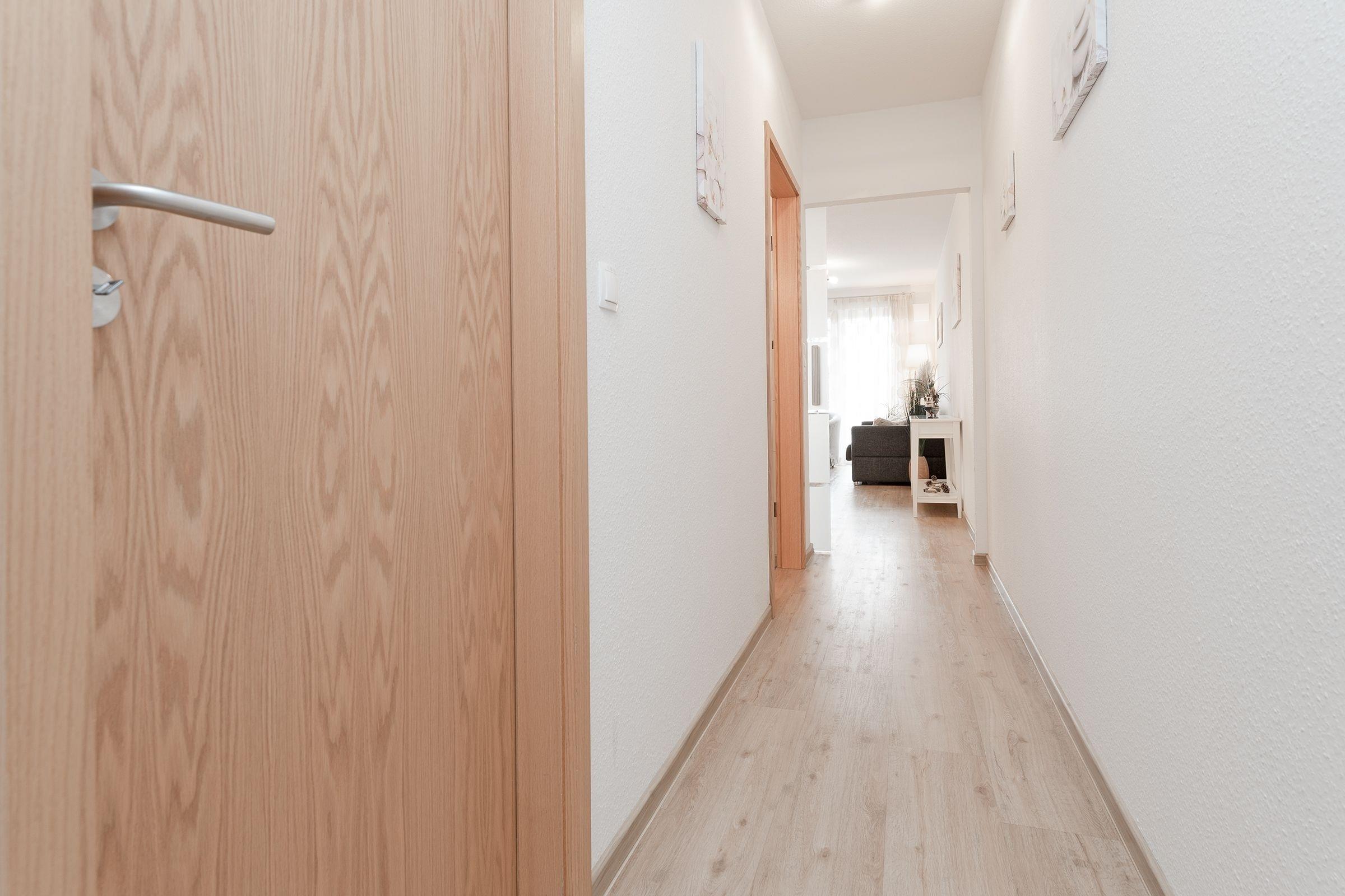 Im Eingangsflur säumen stimmungsvolle Muschelbilder den Weg bis zum Fahrstuhl. In der 1. Etage angekommen – nun sind gleich da in Ihrem Feriendomizil. Empfangen werden Sie von einem großzügigen Flur mit Garderobe. Die "Kleinen" können schon einmal durchflitzen zum Wohnraum. Herrlich angekommen – ab jetzt ist Urlaub.