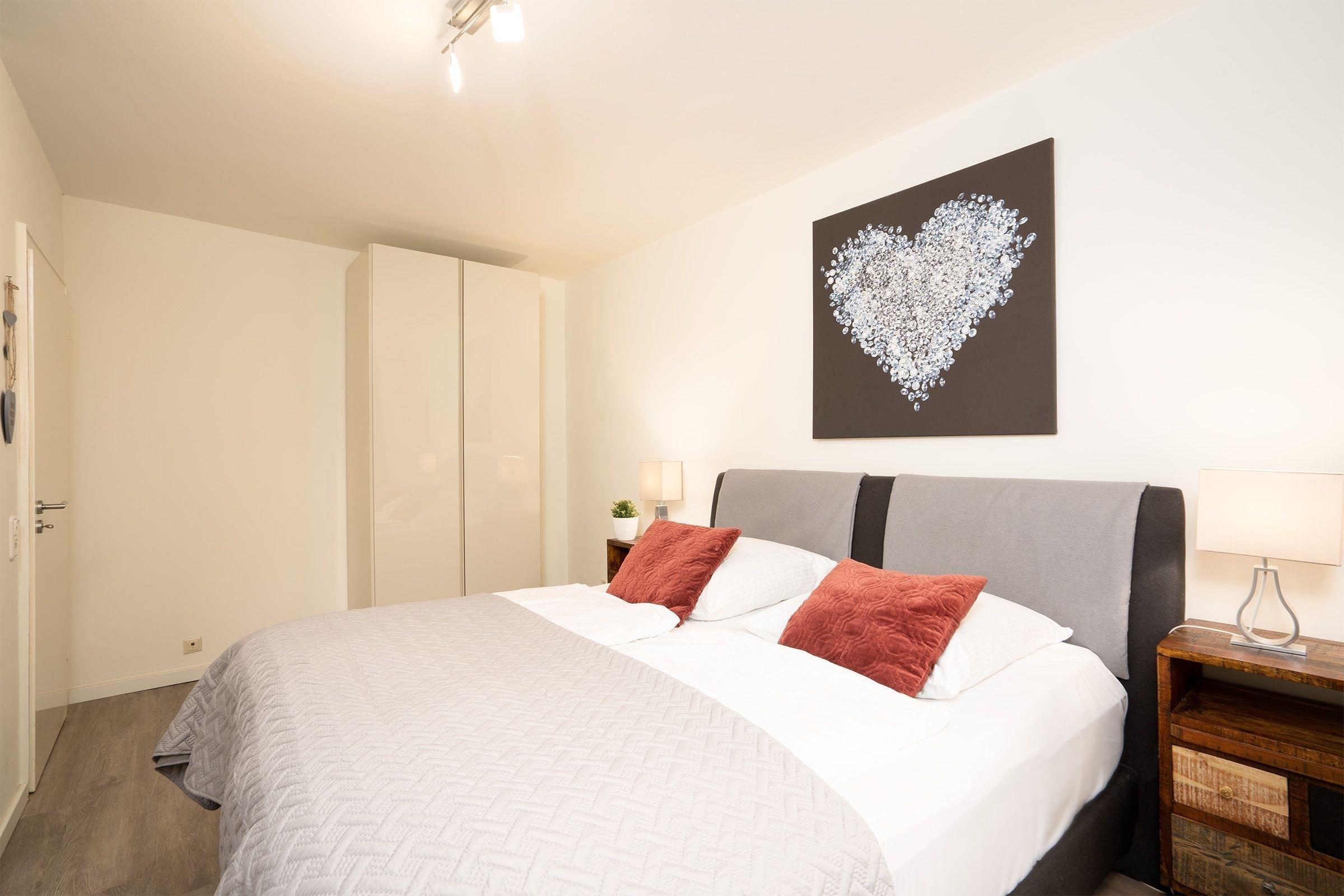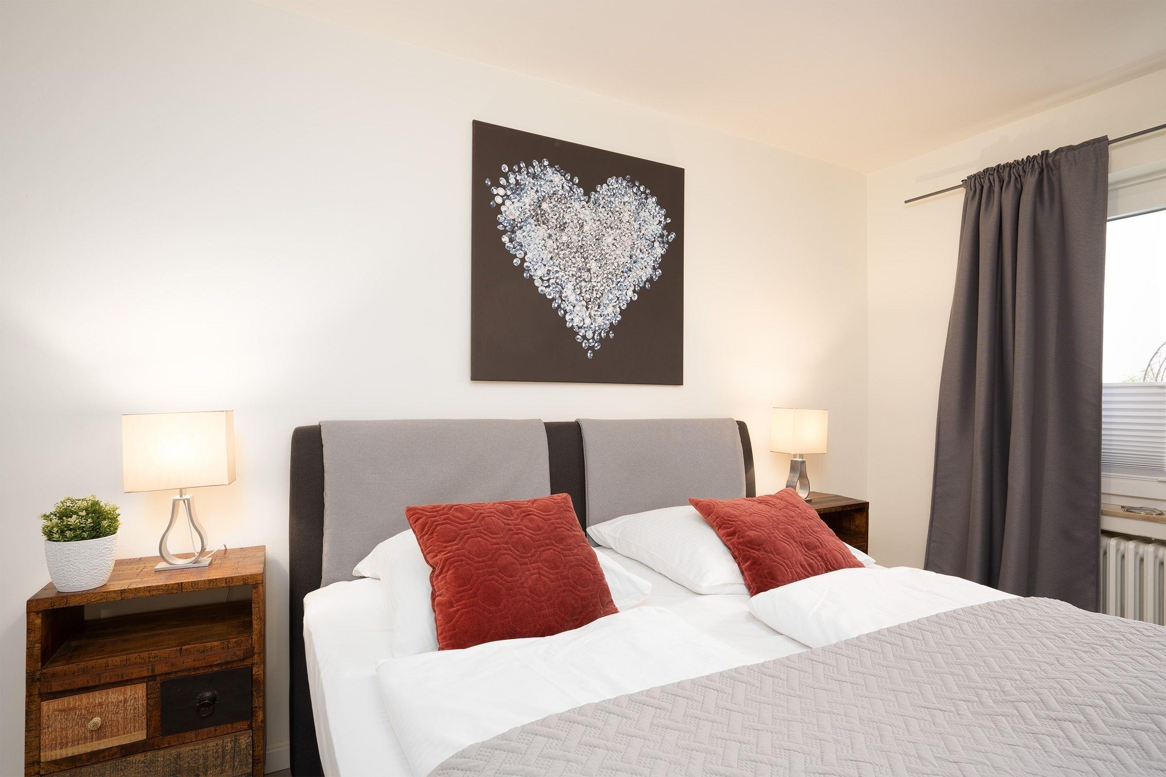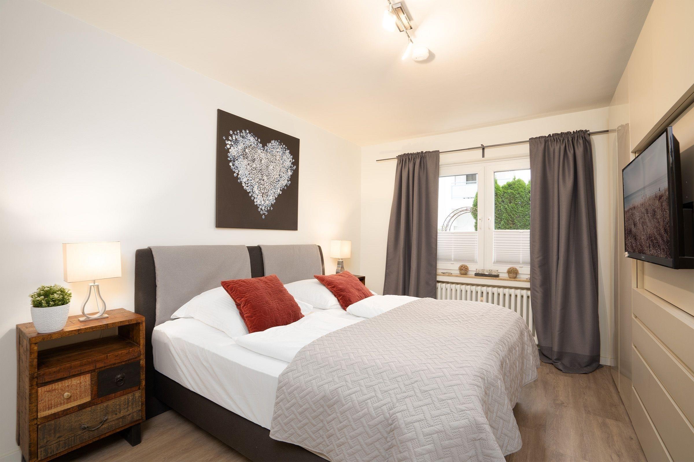 Schlafzimmer 1: 1 Boxspringbett (180x200 cm), TV, Kleiderschrank, Verdunkelung (Plissees, Gardinen)