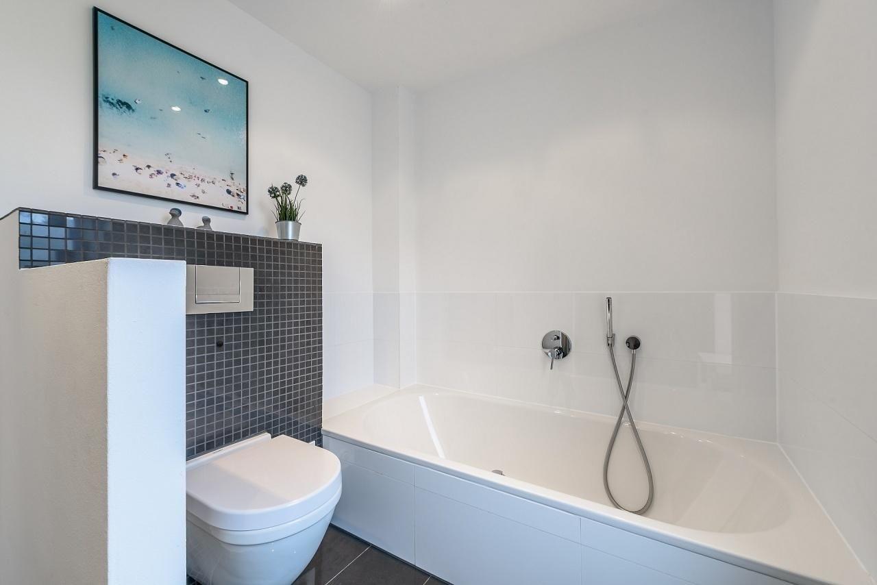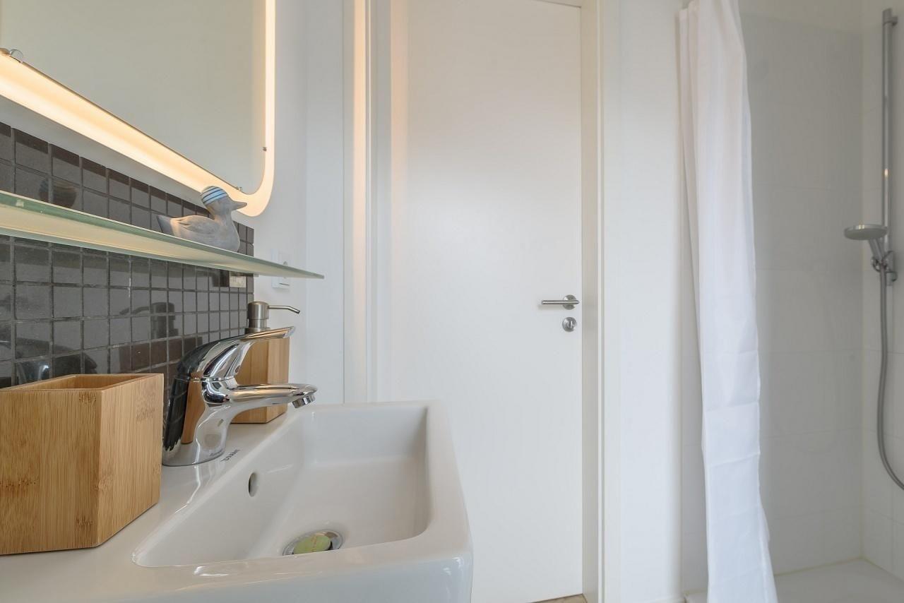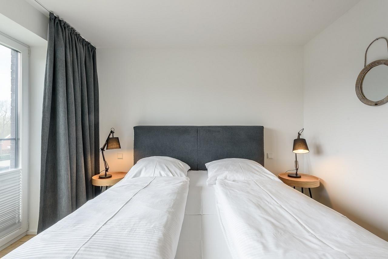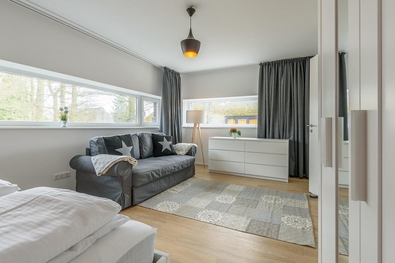 Verbunden durch breite Flure sind auf dieser Ebene insgesamt 3 separate Schlafzimmer, 2 Bäder und ein Ankleidezimmer. Am Ende des Flures auf der rechten Seite befindet sich ein Schlafzimmer mit Boxspringbett (180x200 cm), Kommode und Flatscreen TV. Daneben ein modernes Vollbad mit Badewanne und Dusche. Ein Ankleidezimmer mit zwei durchgängig offenen Schränken trennt die beiden "Elternschlafzimmer" auf dieser Seite. Im 2. Schlafzimmer sind ebenfalls ein Boxspringbett (180x200cm) und ein zusätzlicher Kleiderschrank. Diese beiden Schlafzimmer haben bodentiefe Fenster mit Plissees und Verdunkelungsgardinen. Ein Tageslicht helles Duschbad mit Rainshower-Dusche ist gleich daneben. Links von der Eingangstür ist das 3. großzügige Schlafzimmer mit Doppelbett (2x 90x200 cm), Schlafsofa (160x200 cm), Kleiderschrank und Kommode. Ausreichend Platz für die "Kleinen" zum Spielen ist hier vorhanden.