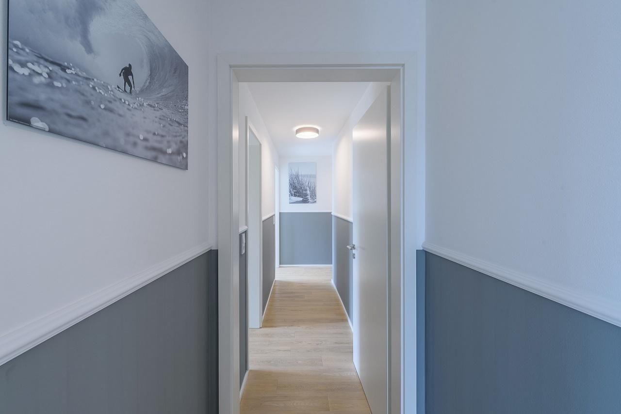 Über eine Granitsteintreppe gelangen Sie in die 1. Etage. Im Vorflur ist genügend Platz für Ihre Garderobe, Schuhe und Strandsachen. Treten Sie ein in Ihr Urlaubsparadies!