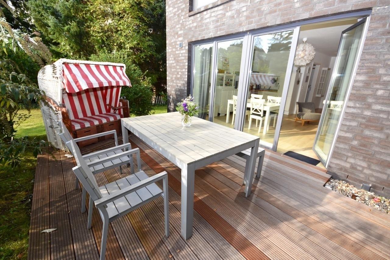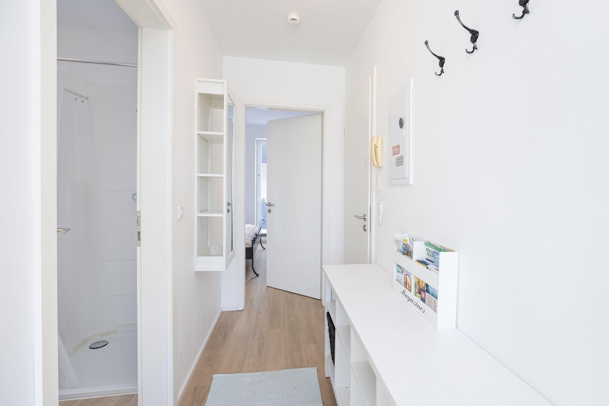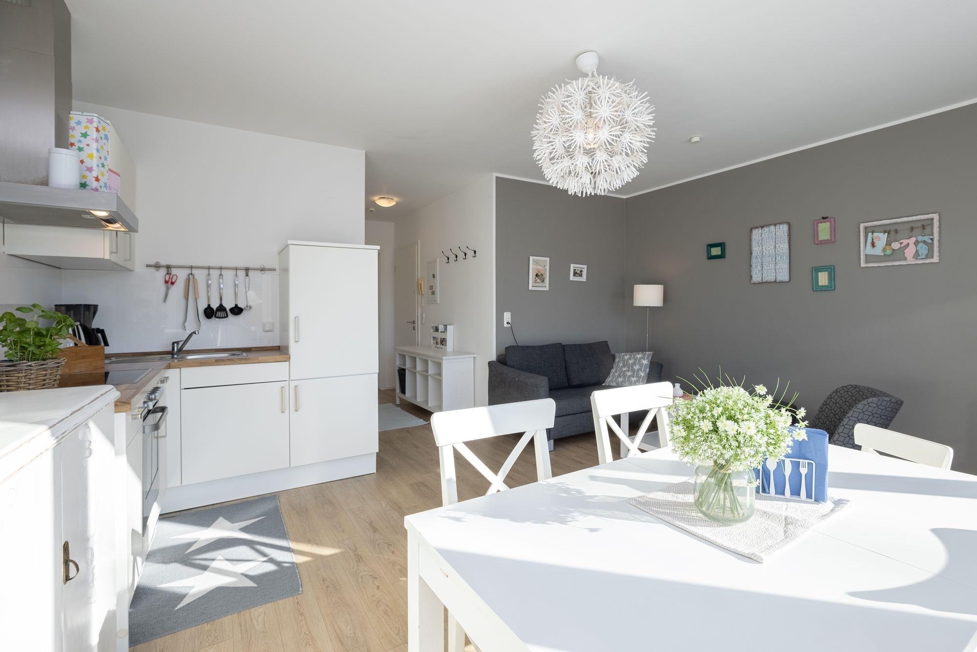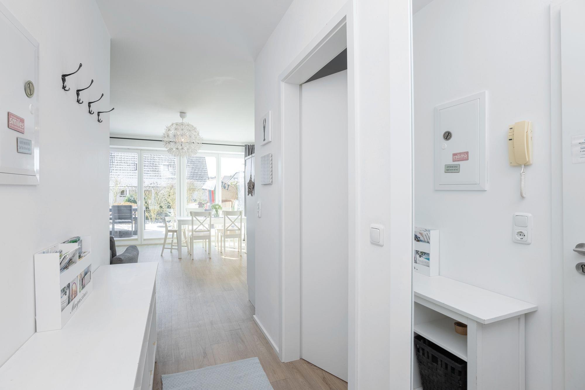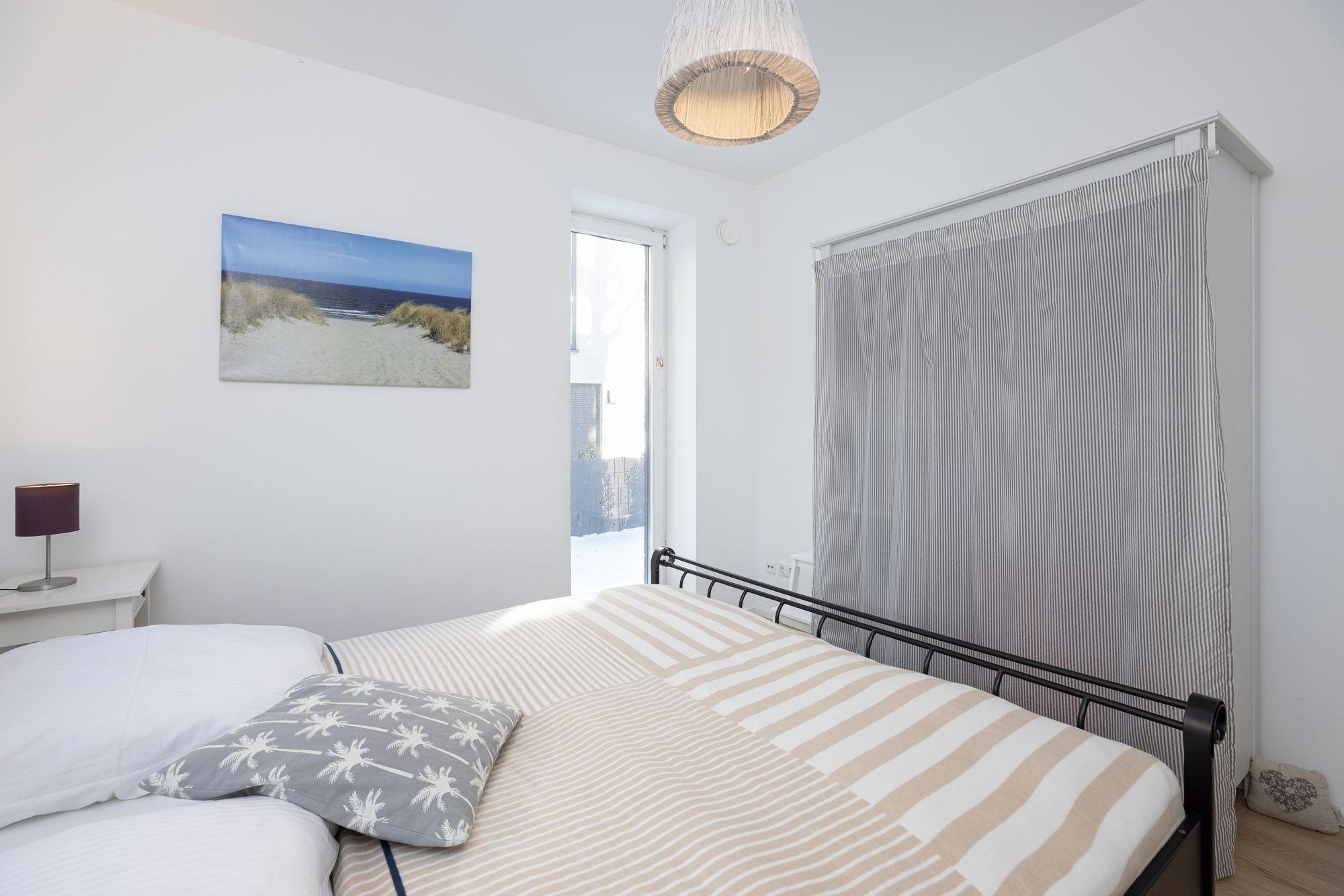 Jetzt noch ein paar Schritte im großen ebenerdigen Eingangsflur und schon schließen sie die Tür zu Ihrem Urlaubsdomizil auf. Lichtstrahlen fallen in den Flur durch die bodentiefe Fensterfront des Wohnzimmers. Herzlich willkommen! Jacken an der Garderobe aufgehängt, Schuhe aus – kommen Sie an. Ein Wohnzimmer in warmen Farben und dezent ausgesuchte Details, Essplatz und gut ausgestattete Küchenzeile erwartet Sie. Wunderbar frühstücken, Kaffee trinken oder Abendessen können Sie auf der geschützten Terrasse und das sogar im Strandkorb. Gegenüber vom Wohnraum ist das Schlafzimmer mit Doppelbett (2x 90x200 cm). Im großen Kleiderschrank können Sie Ihre Garderobe verstauen. Verdunkelungsplissees an den Fenstern schützen vor die ersten Sonnenstrahlen. Daneben ist das tageslichthelle Duschbad mit Handtuchwärmer.