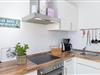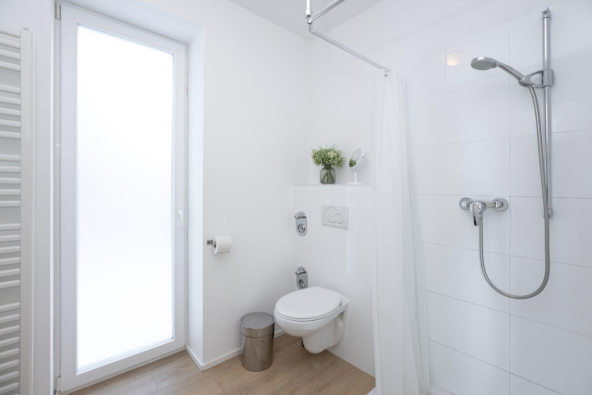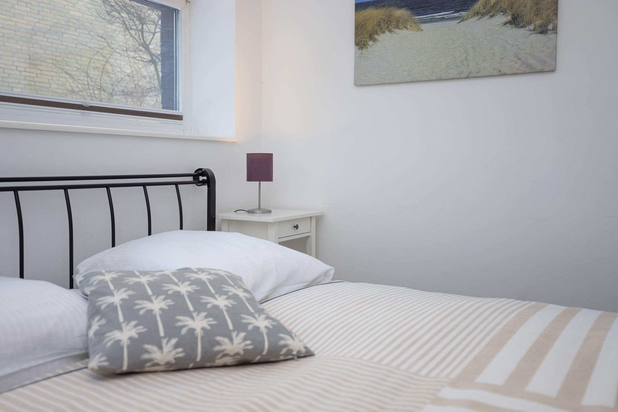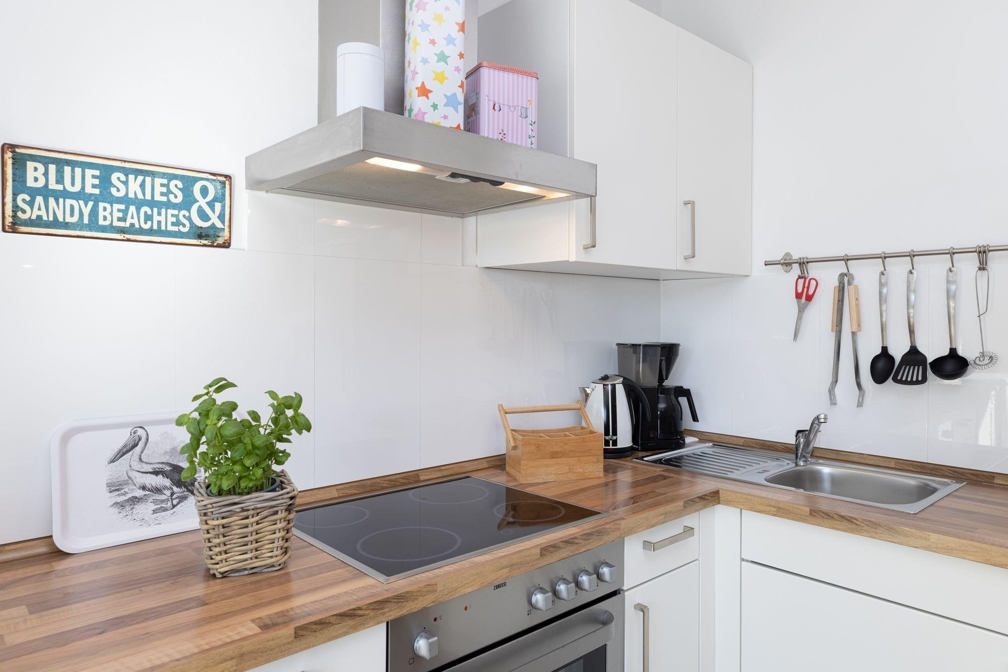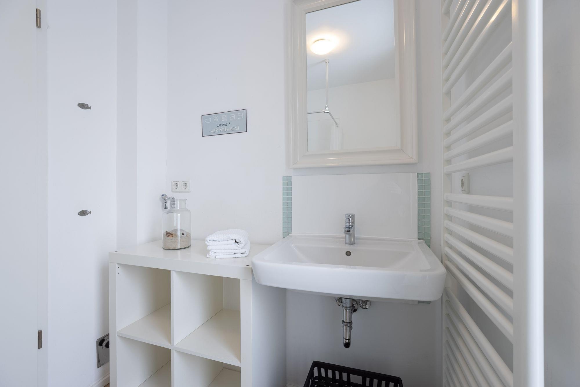 Jetzt noch ein paar Schritte im großen ebenerdigen Eingangsflur und schon schließen sie die Tür zu Ihrem Urlaubsdomizil auf. Lichtstrahlen fallen in den Flur durch die bodentiefe Fensterfront des Wohnzimmers. Herzlich willkommen! Jacken an der Garderobe aufgehängt, Schuhe aus – kommen Sie an. Ein Wohnzimmer in warmen Farben und dezent ausgesuchte Details, Essplatz und gut ausgestattete Küchenzeile erwartet Sie. Wunderbar frühstücken, Kaffee trinken oder Abendessen können Sie auf der geschützten Terrasse und das sogar im Strandkorb. Gegenüber vom Wohnraum ist das Schlafzimmer mit Doppelbett (2x 90x200 cm). Im großen Kleiderschrank können Sie Ihre Garderobe verstauen. Verdunkelungsplissees an den Fenstern schützen vor die ersten Sonnenstrahlen. Daneben ist das tageslichthelle Duschbad mit Handtuchwärmer.