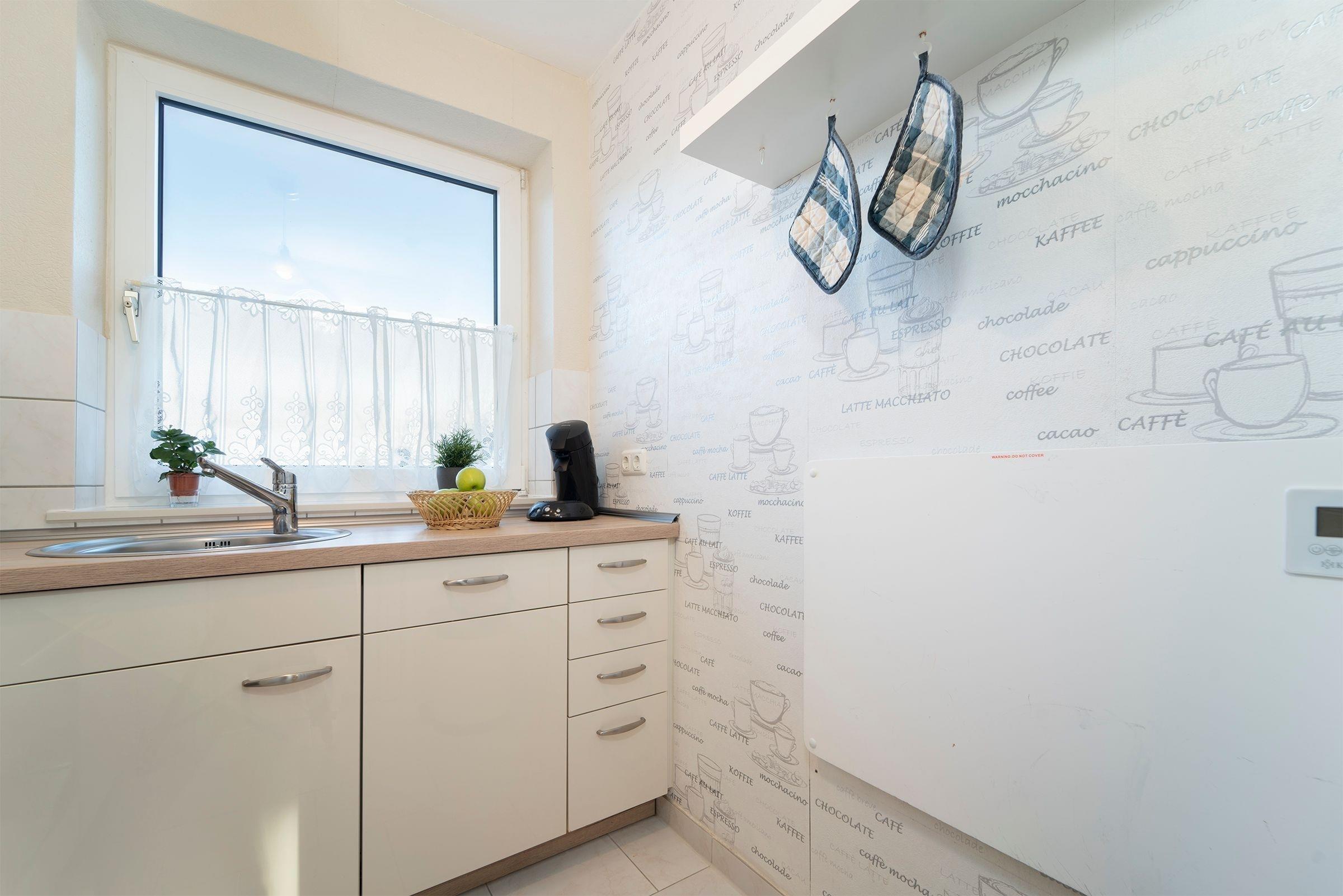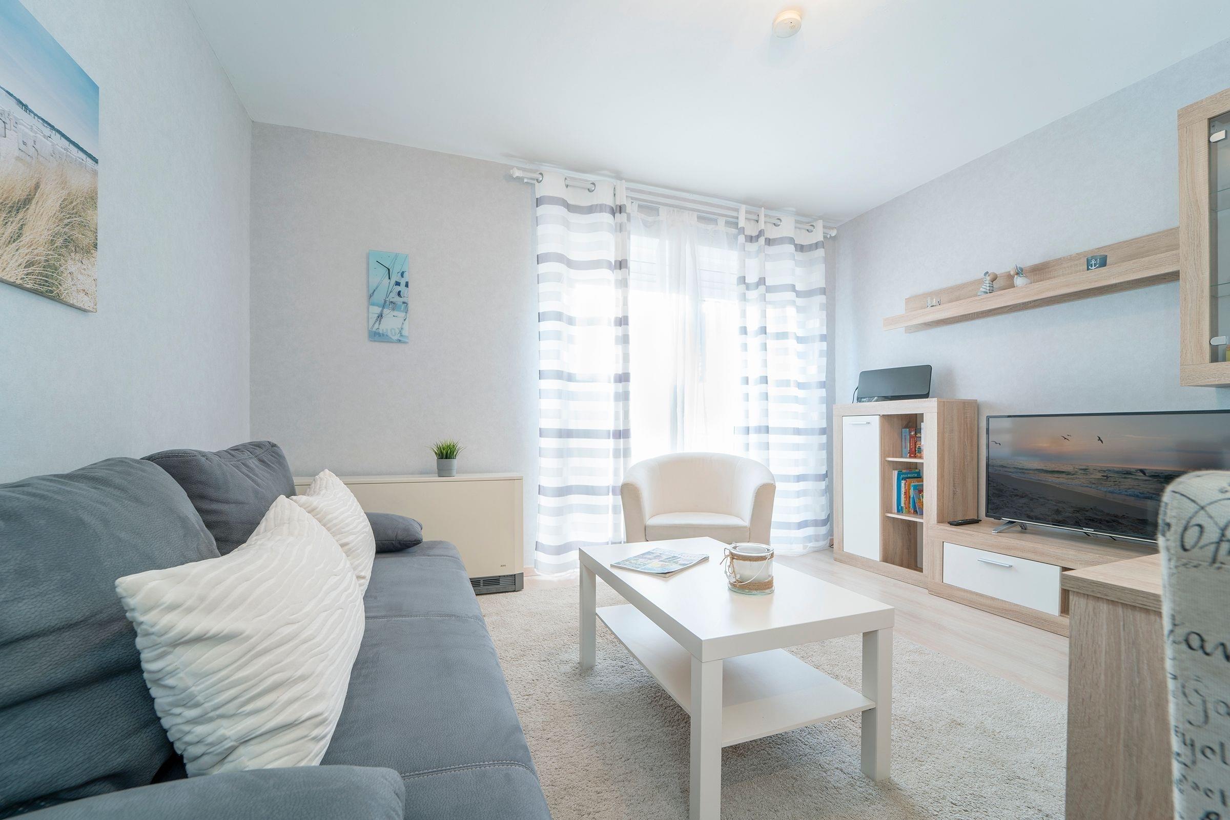 Alle Zimmer der Wohnung sind vom Flur aus erreichbar. Es erwartet Sie ein geschmackvoll modern eingerichtetes Wohn-, Schlafzimmer mit CD-Player, DVD-Player, TV, Radio, W-LAN Anschluss und einer komfortablen Schlafcouch (160x200 cm). Das separate Schlafzimmer verfügt über ein bequemes, großzügiges Doppelbett (180x200 cm). Zum Appartement gehört eine mit Kühlschrank, Gefrierfach, Backofen, Herd, Spülmaschine, Kaffeemaschine, Toaster und Wasserkocher ausgestattete Küche. Ebenso ein freundliches neu renoviertes Duschbad, das auch über einen Fön verfügt.