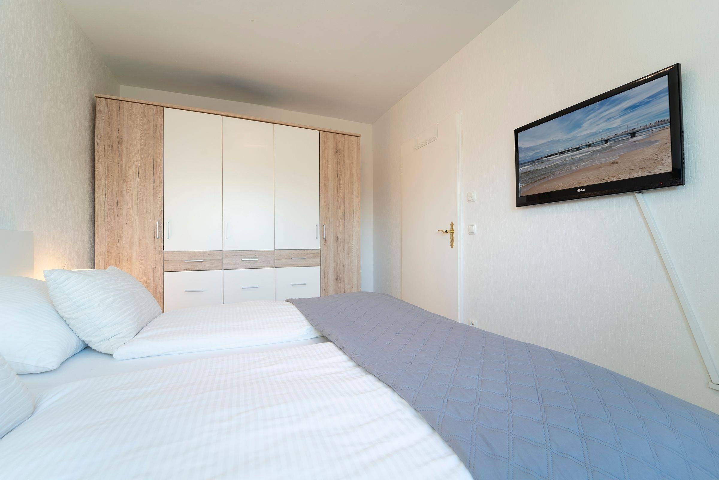 Schlafzimmer: 1 Doppelbett (180x200 cm), Kleiderschrank, Verdunkelungsmöglichkeit