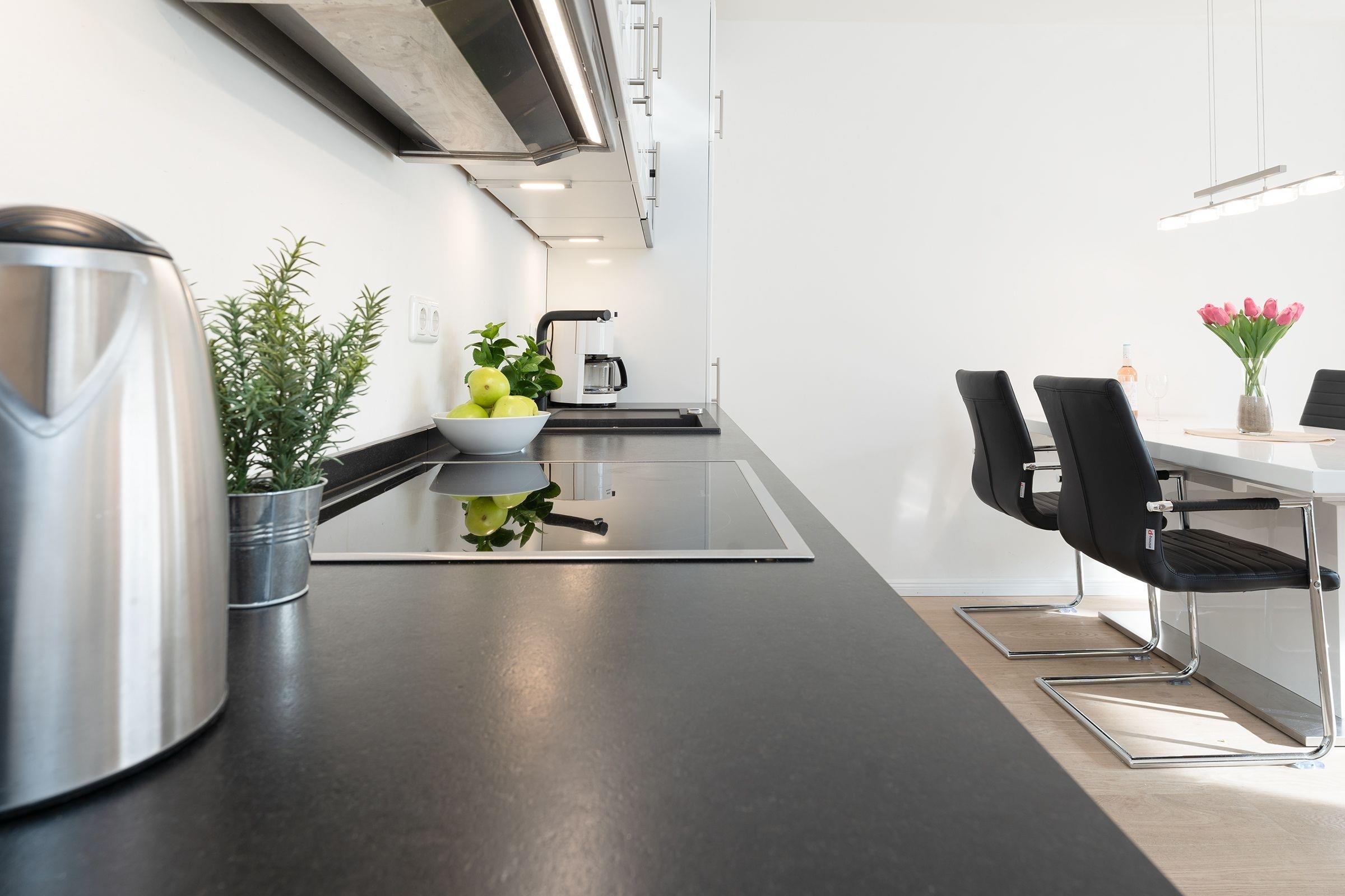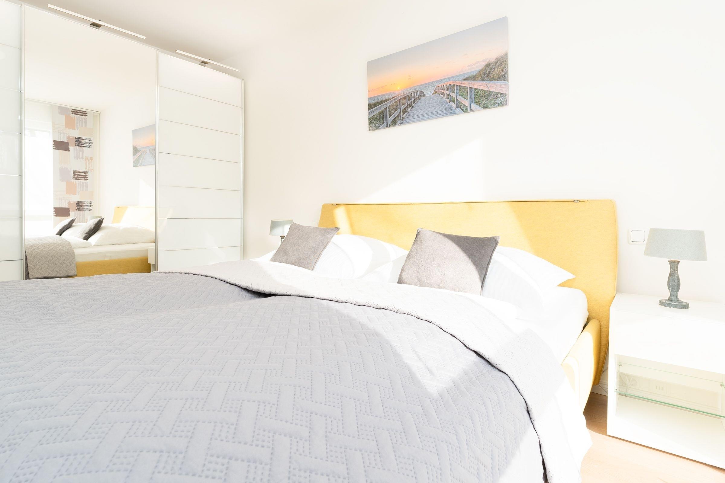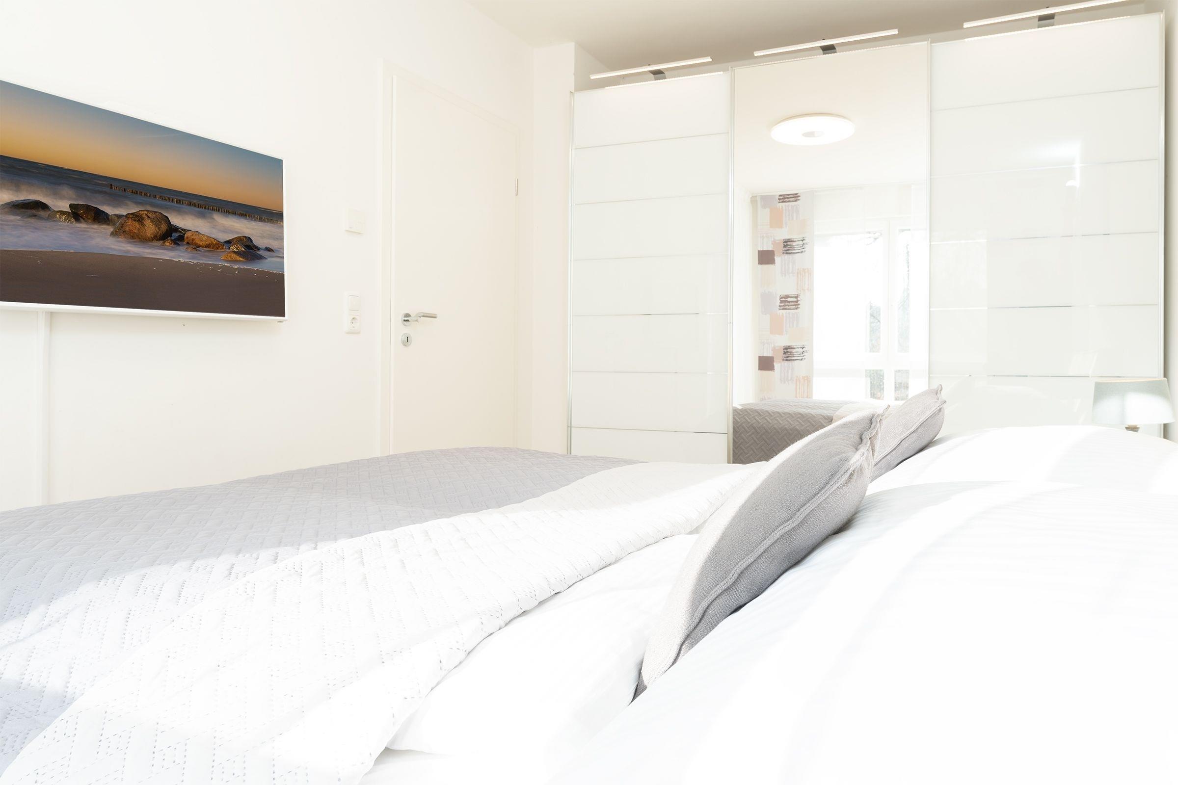 Jacken aufgehängt, Schuhe ausgezogen und erst mal Ihre Urlaubskoffer zum Schlafzimmer durch das Wohnzimmer mit offener Küche getragen. In aller Ruhe können Sie nun auspacken! Ausreichend Platz ist im großen beleuchteten Schiebetürenschrank mit Spiegel für Ihre Urlaubsgarderobe. Das Boxspringbett (2x90x200cm) ist fantastisch bequem, freuen Sie sich schon jetzt auf eine erholsame Nachtruhe. Ein Kinderreisebett kann hier mühelos aufgestellt werden. Gönnen Sie sich jetzt einen frisch gebrühten Kaffee. Die moderne Küche ist mit allem ausgestattet was Sie sich wünschen, ein Esstisch gleich daneben. Nehmen Sie Platz auf dem komfortablen Eckledersofa und genießen Sie Ihren Kaffee oder natürlich bei herrlichem Wetter gerne auf der überdachten Terrasse. Über erste Ausflugstipps können Sie sich online informieren, kostenfreies W-Lan ist selbstverständlich inklusive. Das Eckledersofa lässt sich am Abend zu einer bequemen Schlafgelegenheit (160x200 cm) für 2 Personen verwandeln. Schnell noch etwas erfrischen. Ein Duschbad mit ebenerdiger Dusche, WC, Handtuchwärmer und Föhn und ein Gäste WC rundet das Gesamtbild der Ferienwohnung ab. Praktisch - für die Wäsche zwischendurch steht Ihnen hier eine Waschmaschine mit integriertem Trockner zu Verfügung.