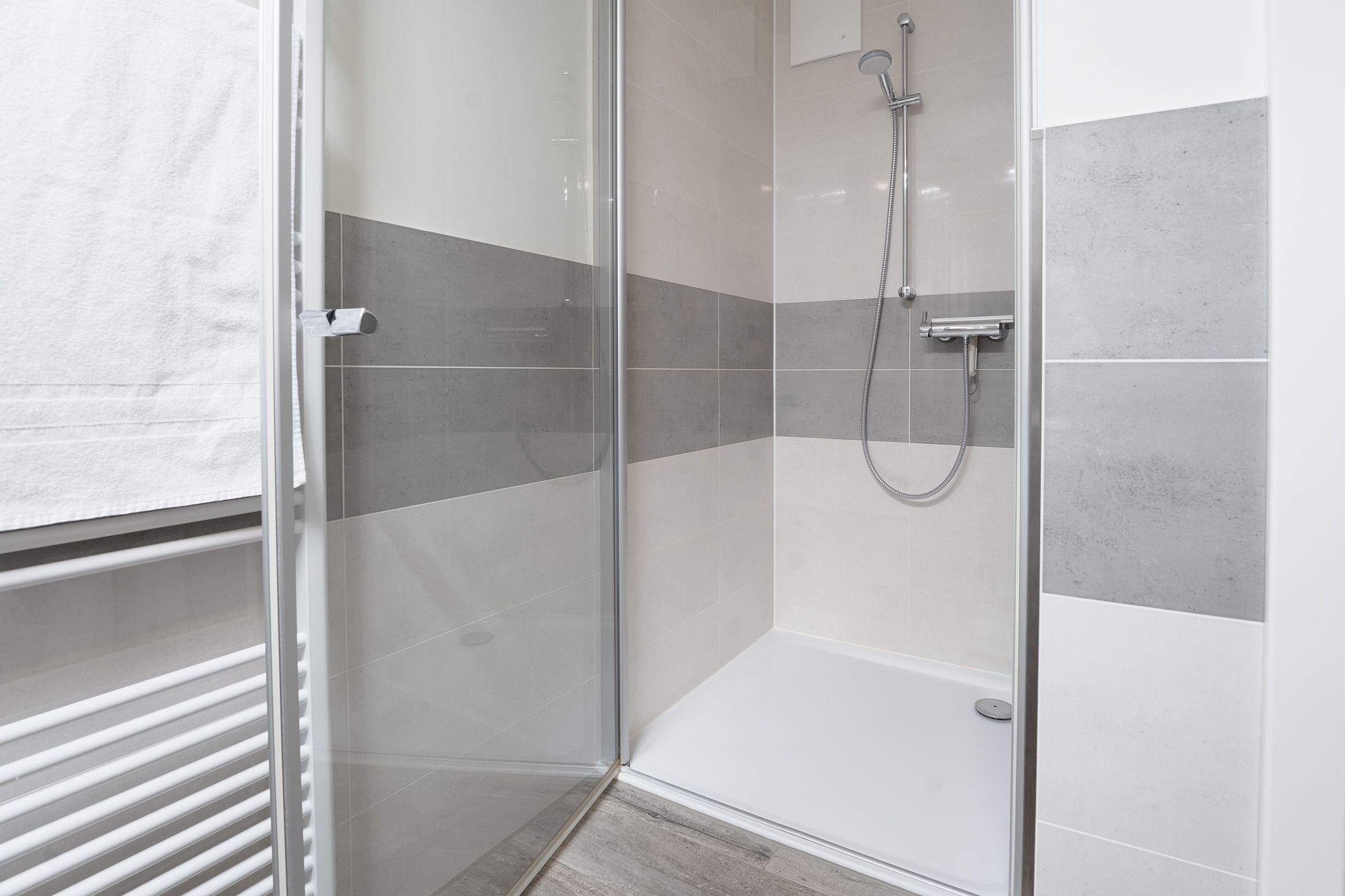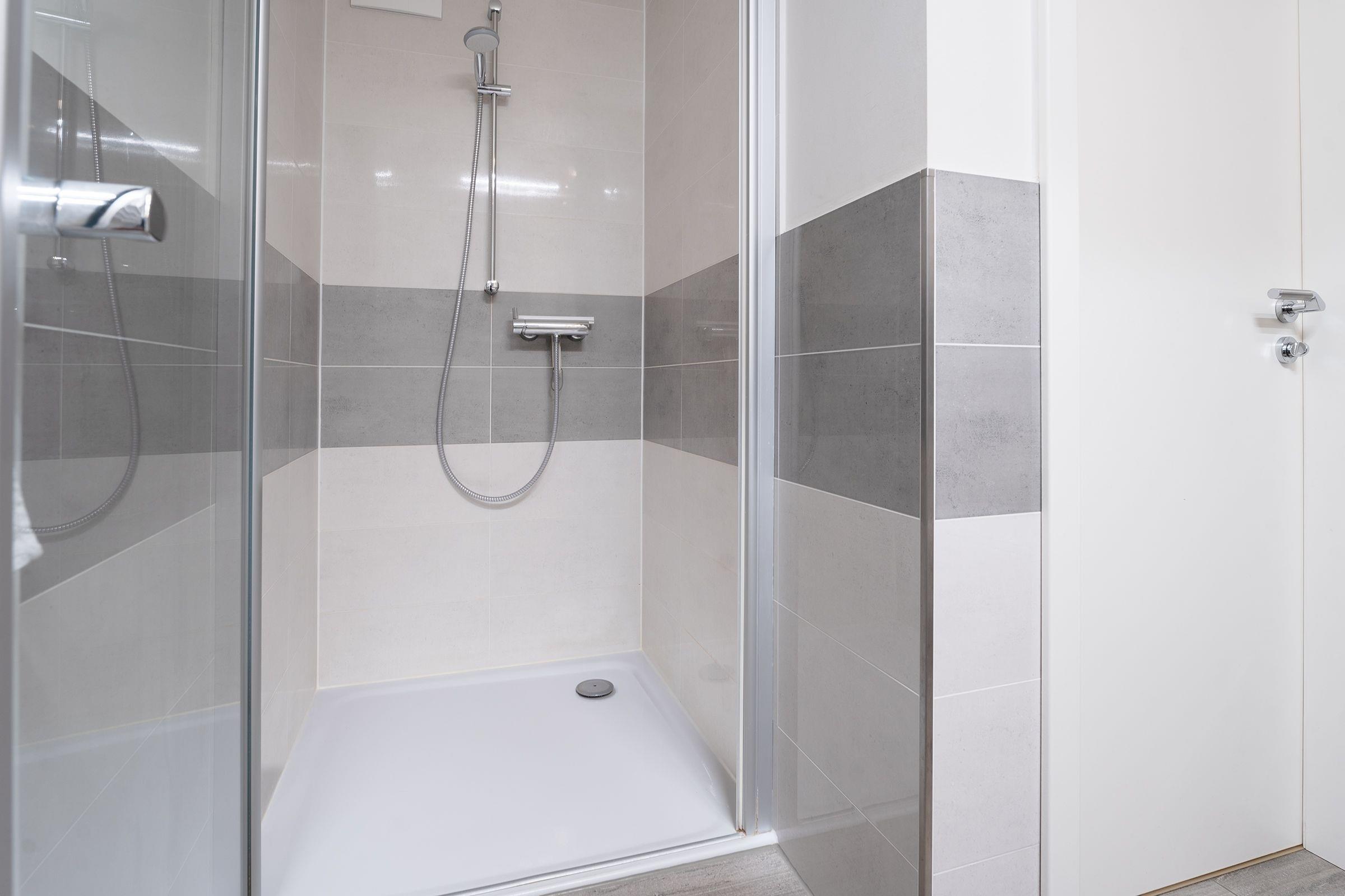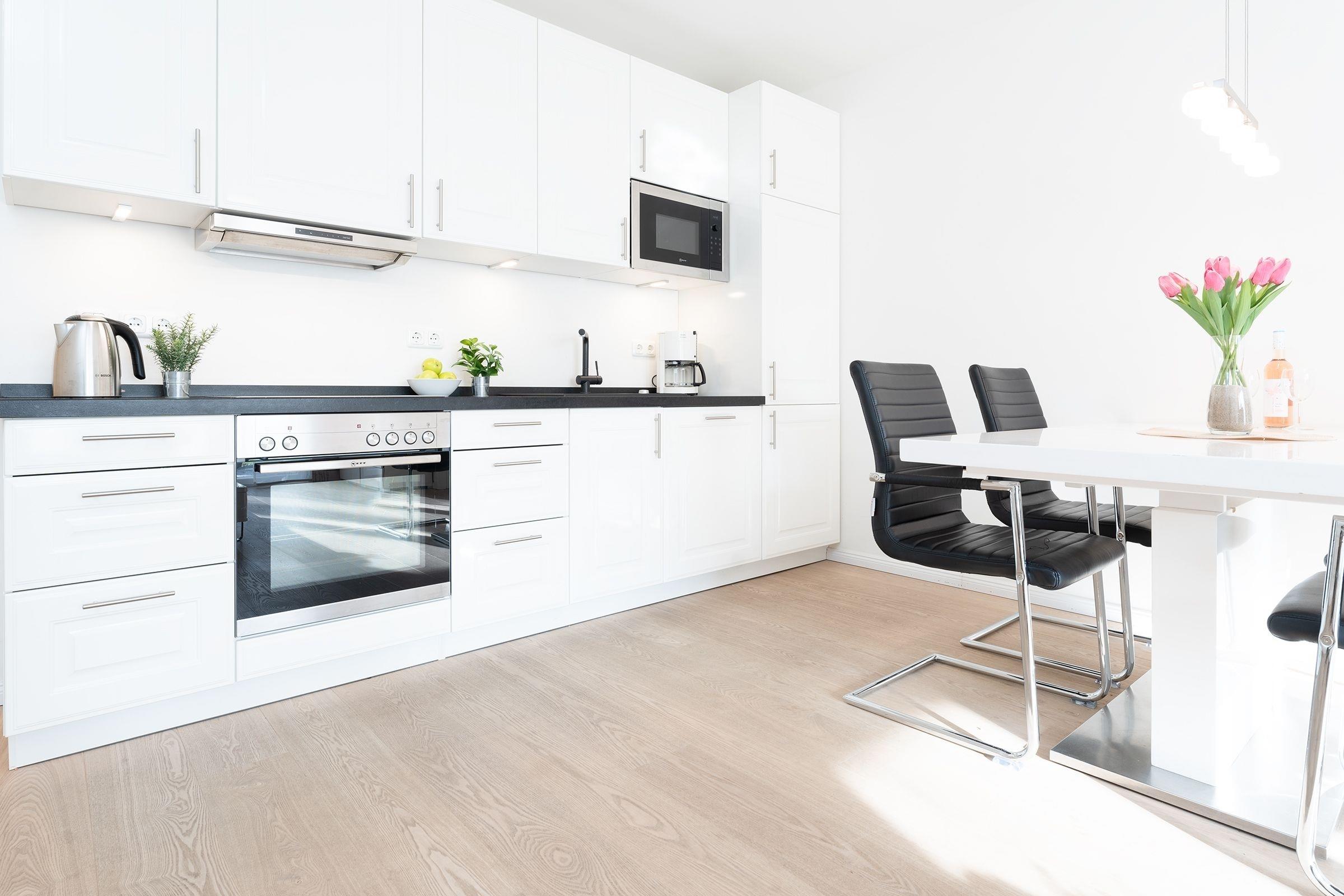 Jacken aufgehängt, Schuhe ausgezogen und erst mal Ihre Urlaubskoffer zum Schlafzimmer durch das Wohnzimmer mit offener Küche getragen. In aller Ruhe können Sie nun auspacken! Ausreichend Platz ist im großen beleuchteten Schiebetürenschrank mit Spiegel für Ihre Urlaubsgarderobe. Das Boxspringbett (2x90x200cm) ist fantastisch bequem, freuen Sie sich schon jetzt auf eine erholsame Nachtruhe. Ein Kinderreisebett kann hier mühelos aufgestellt werden. Gönnen Sie sich jetzt einen frisch gebrühten Kaffee. Die moderne Küche ist mit allem ausgestattet was Sie sich wünschen, ein Esstisch gleich daneben. Nehmen Sie Platz auf dem komfortablen Eckledersofa und genießen Sie Ihren Kaffee oder natürlich bei herrlichem Wetter gerne auf der überdachten Terrasse. Über erste Ausflugstipps können Sie sich online informieren, kostenfreies W-Lan ist selbstverständlich inklusive. Das Eckledersofa lässt sich am Abend zu einer bequemen Schlafgelegenheit (160x200 cm) für 2 Personen verwandeln. Schnell noch etwas erfrischen. Ein Duschbad mit ebenerdiger Dusche, WC, Handtuchwärmer und Föhn und ein Gäste WC rundet das Gesamtbild der Ferienwohnung ab. Praktisch - für die Wäsche zwischendurch steht Ihnen hier eine Waschmaschine mit integriertem Trockner zu Verfügung.
