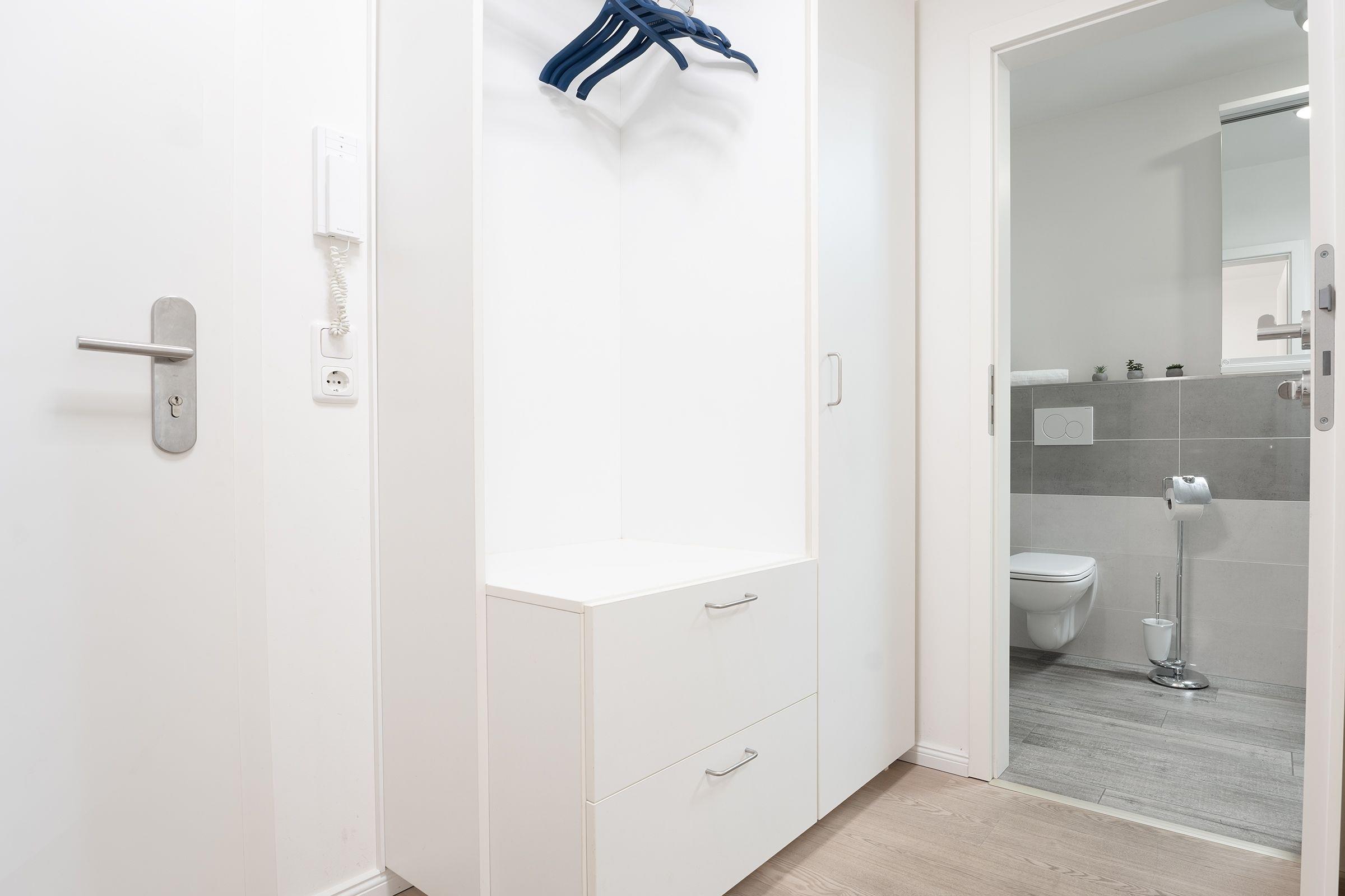 Bequem parken Sie Ihr Auto in der Tiefgarage des "Augustusbad". Der Fahrstuhl bringt Sie von hieraus in das Erdgeschoss zu Ihrem Feriendomizil. Ein heller Flur mit Garderobe empfängt Sie.