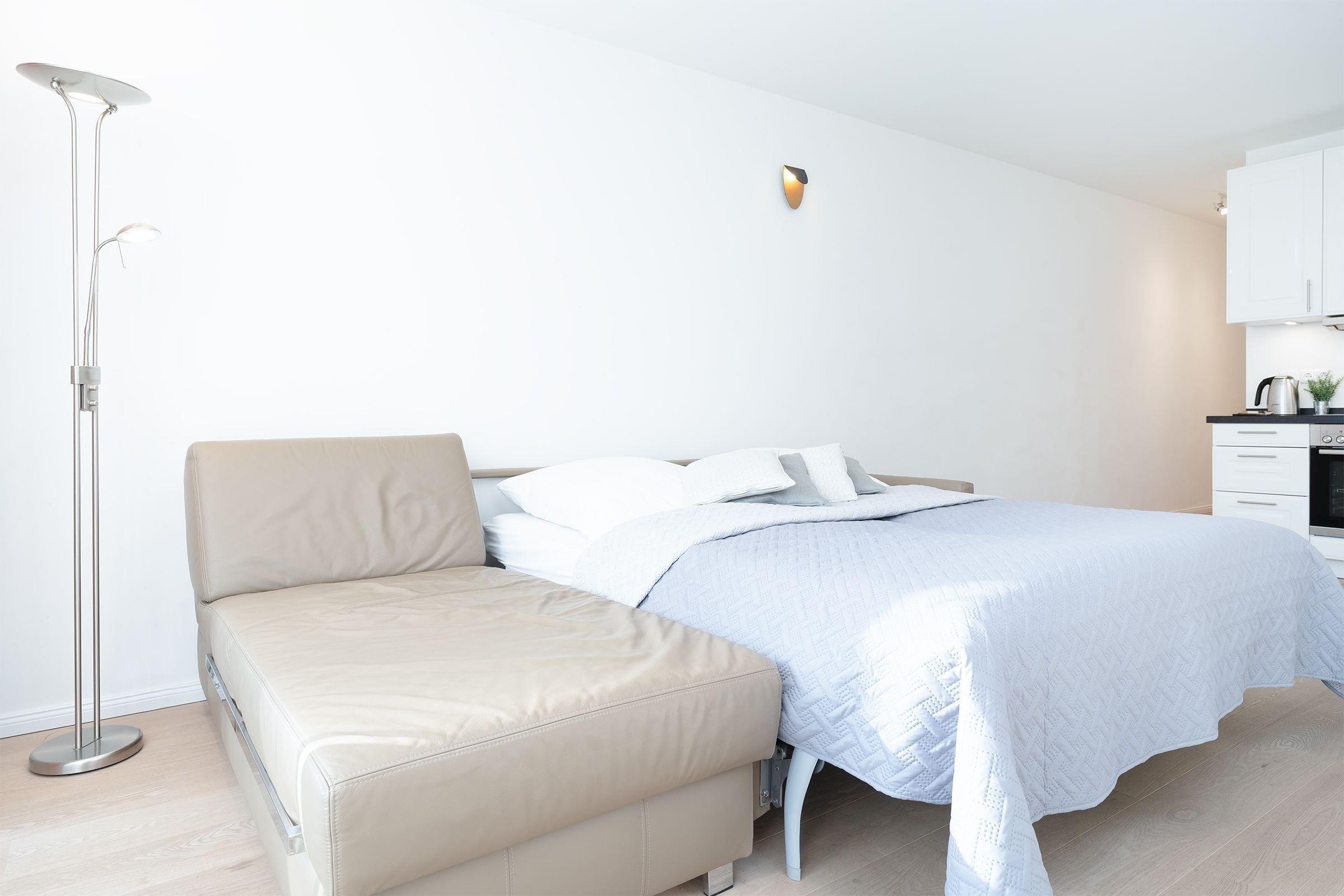 Wohnzimmer: 1 Schlafsofa (160x200 cm), elektrische Außenrollläden