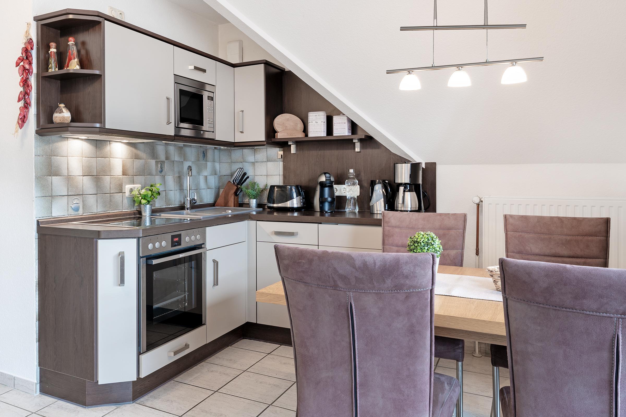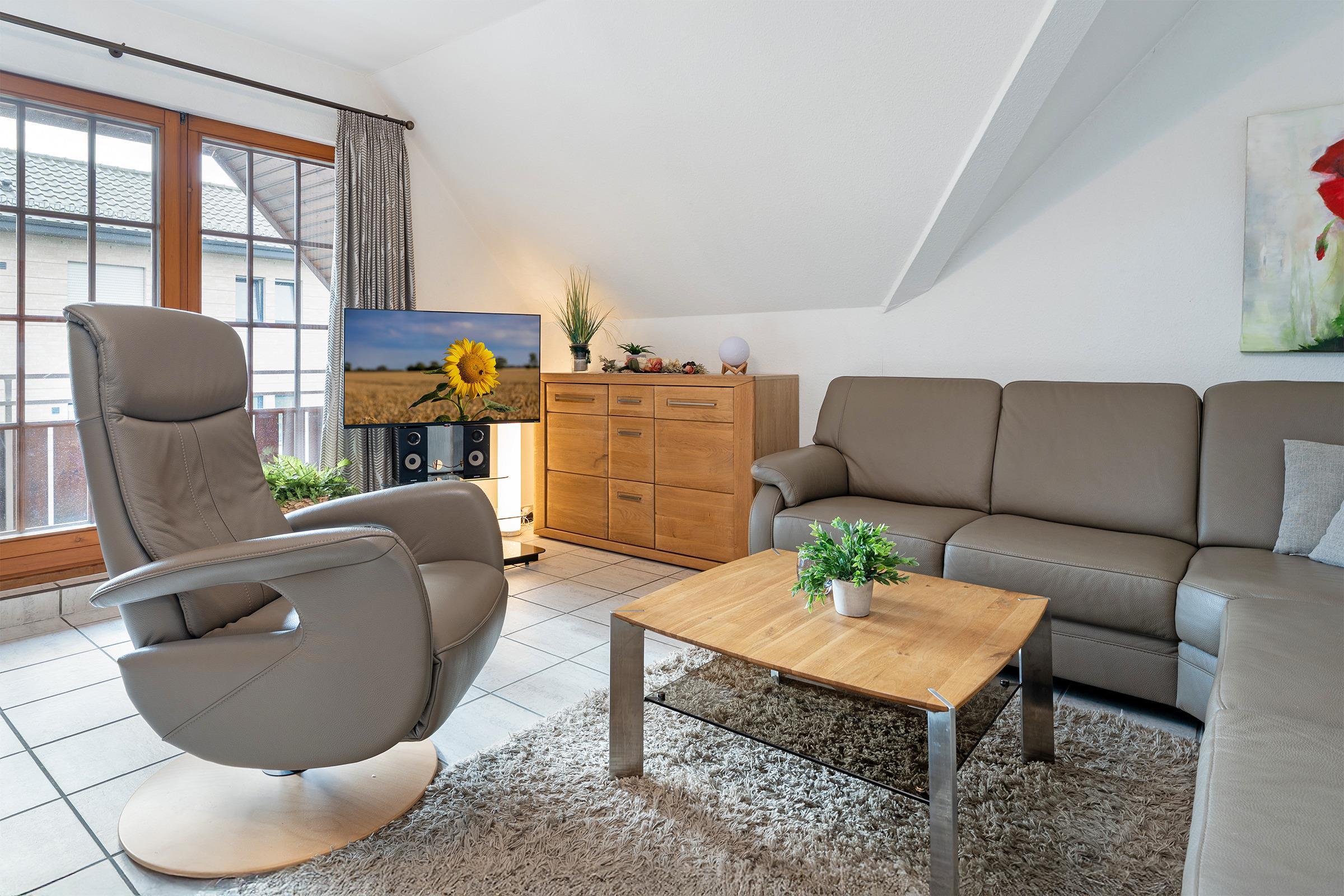 Das Appartement befindet sich in der 2. Etage (Dachgeschoss) und verfügt über einen geschmackvoll eingerichteten Wohn-/Schlafraum mit Flachbildfernseher, DVD-Player, Kombi-Stereoanlage, großer und komfortabler Ledercouch mit Schlaffunktion (120x200 cm) für 2 Personen, Südbalkon/Loggia mit Gartenmöbeln. Die Küchenzeile mit anliegender Essecke ist komplett ausgestattet mit: Backofen, Cerankochfeld, Mikrowelle, Kühlschrank mit Gefrierfach, Kaffeemaschine, Wasserkocher und Toaster. Das Schlafzimmer mit Boxspring-Doppelbett (180x200 cm), Radiowecker sowie 2 geräumigen Kleiderschränken. Ein WLAN-Anschluss ist hier inklusive