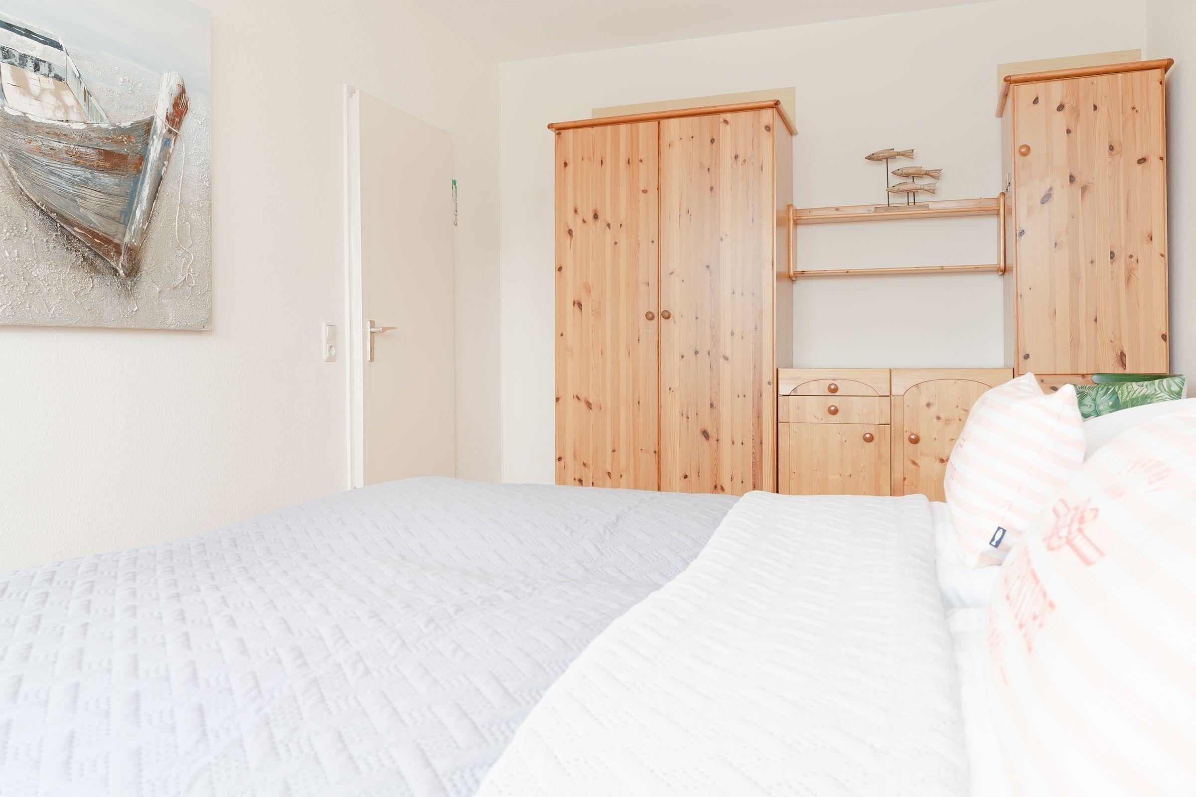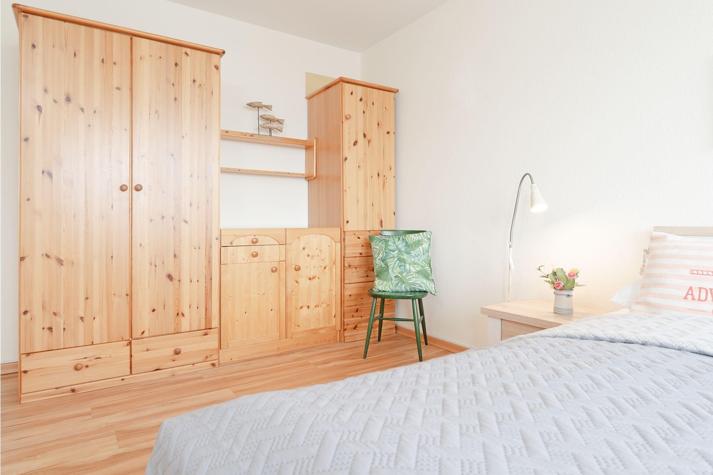 Schlafzimmer: 1 Doppelbett (2x 90x200 cm), Kleiderschrank, Verdunkelung (Plissees).