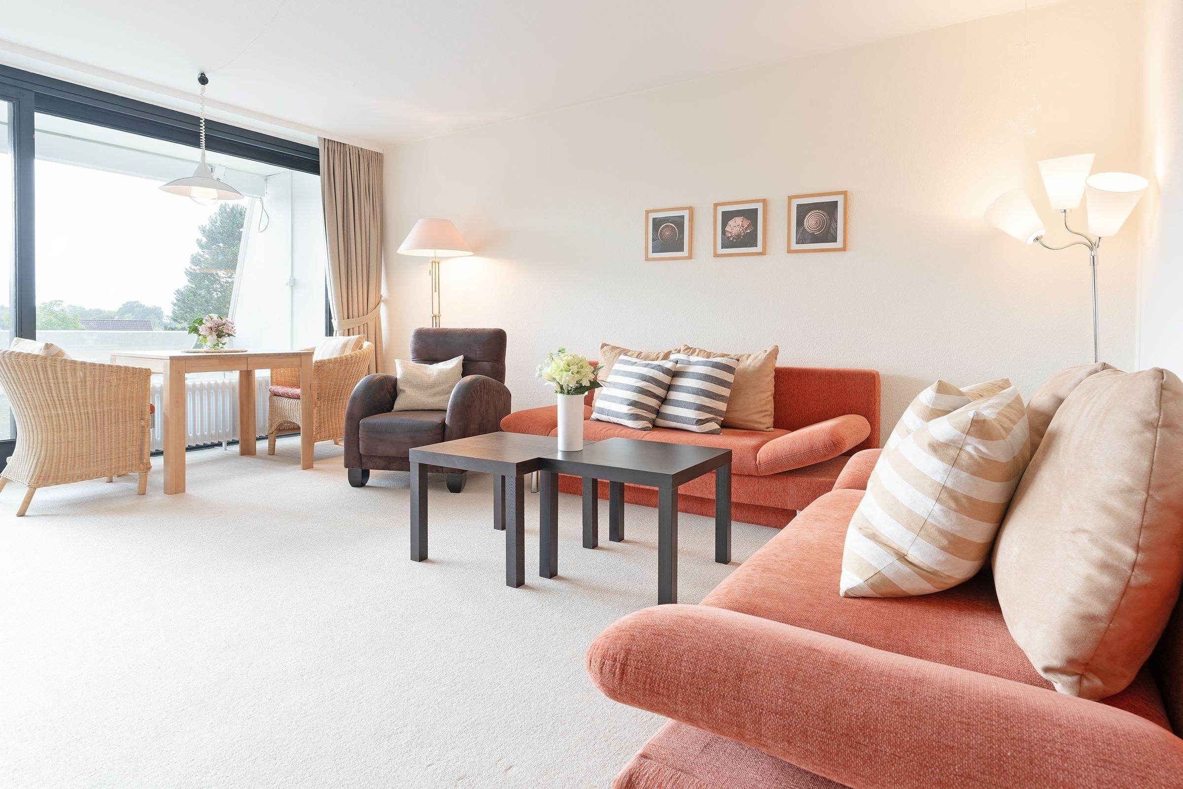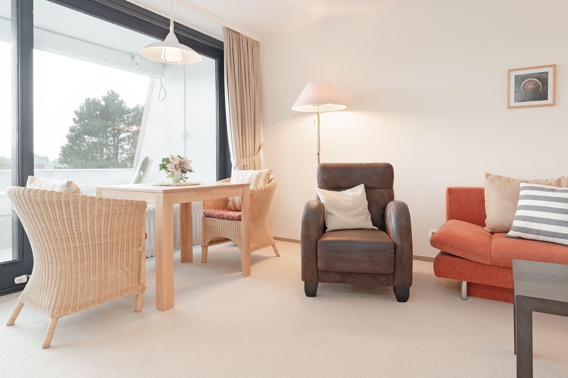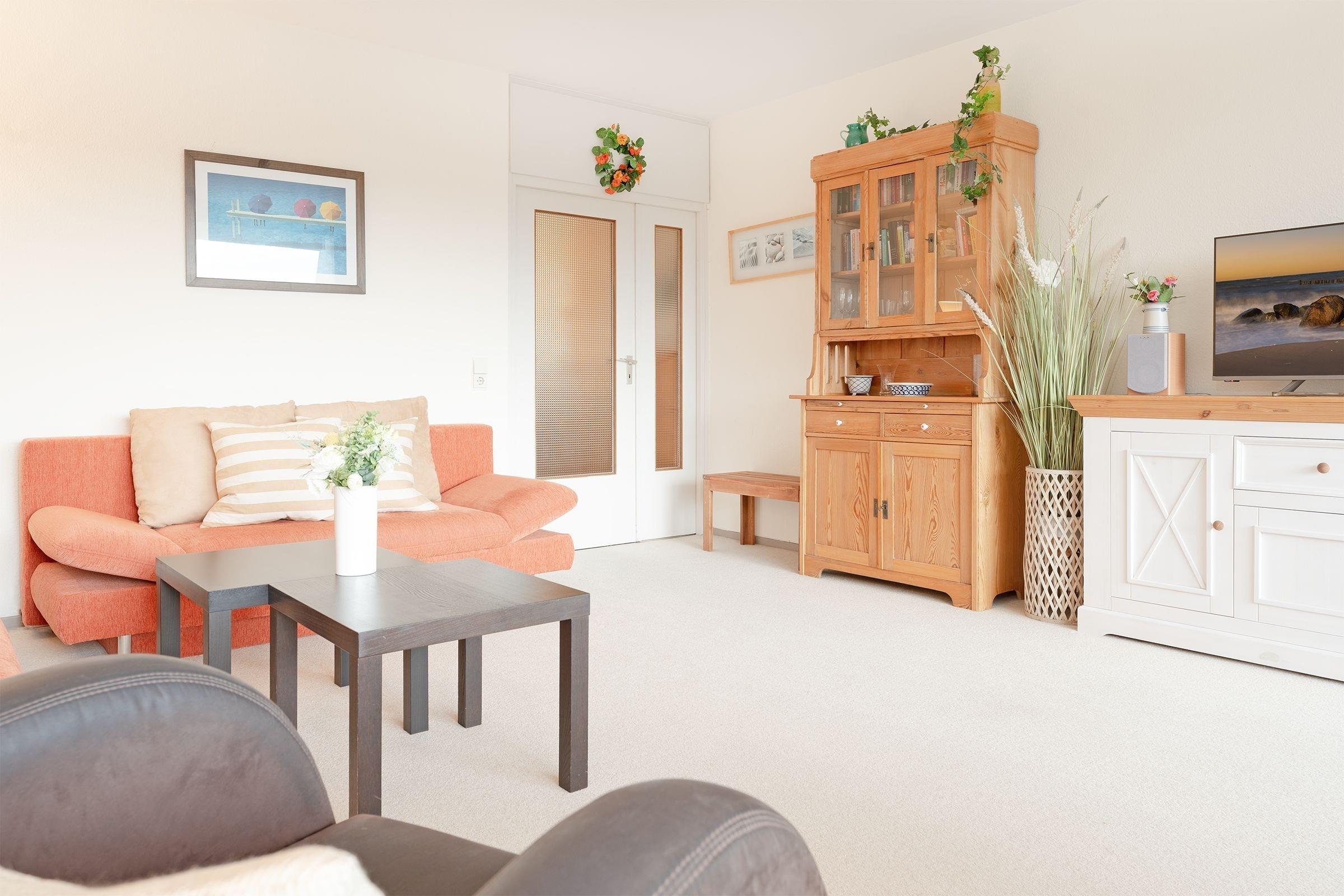 Es ist geschmackvoll und sehr gemütlich eingerichtet. Der Wohnraum verfügt über eine Couchgarnitur mit einer Schlafcouch (140x190 cm), ein TV-Gerät mit Kabelempfang und eine Stereoanlage. Der sehr großzügige Balkon in Süd-/ Westlage ist mit Balkonmöbeln ausgestattet, eine Markise spendet bei Bedarf Schatten. Im Schlafzimmer befindet sich ein Doppelbett (2x 90x200 cm) mit ausreichend Stauraum für Ihre Urlaubsgarderobe. In der separaten Küche mit Essplatz finden Sie einen 3-Plattenherd mit Backofen, Geschirrspülmaschine, Kühlschrank mit Gefrierfach, Kaffeemaschine, Wasserkocher und Toaster. Außerdem gibt es hier eine Durchreiche zum Essplatz und einen Zugang zum zweiten Balkon in Ostlage, auf dem Sie eine Tasse frischen Morgenkaffee genießen können. Das hell geflieste Badezimmer ist funktional mit Dusche/WC und beleuchtetem Spiegelschrank ausgestattet.