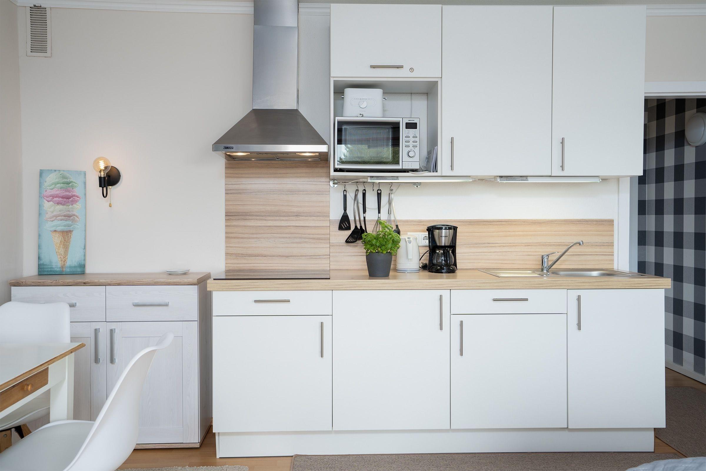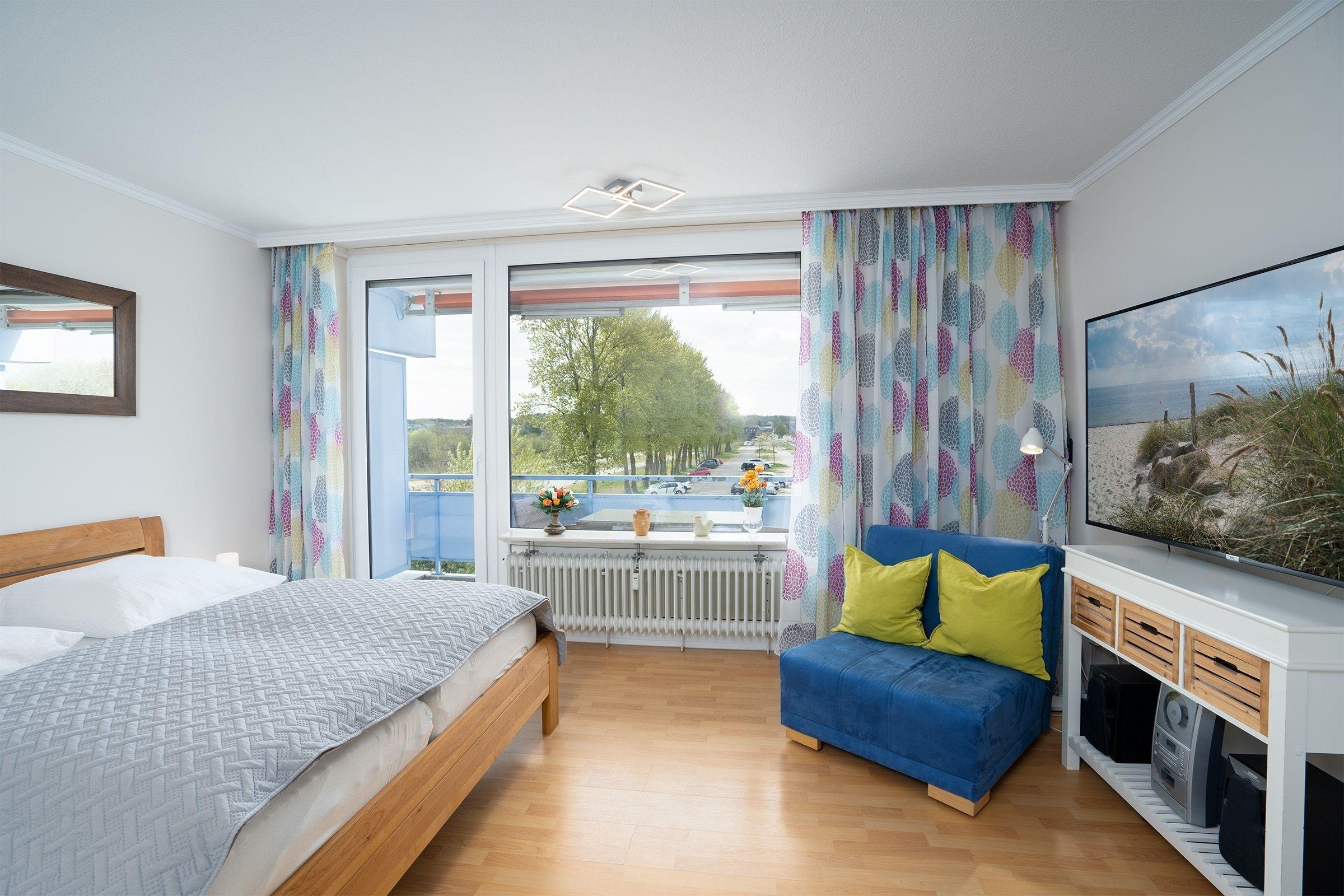 Im lichtdurchfluteten Wohnraum legen Sie abends auf dem Sofa entspannt die Füße hoch und lassen den Urlaubstag Revue passieren. Für Unterhaltung sorgen ein großer Flachbildfernseher und eine Stereo-Anlage. Im komfortablen Doppelbett (180x200 cm) können Sie sich dann entspannt in die Kissen fallen lassen. Die voll ausgestattete Küchenzeile z. B. mit Induktionsherd (4-Platten), kleinem Grill, Mikrowelle, Kühlschrank und Kaffeemaschine ist im Wohnraum integriert. Das Badezimmer erwartet Sie mit Dusche, WC und Spiegelschrank. Zum Ausklingen des Tages lädt der überdachte, möblierte Balkon zum Sonnenbaden ein. Der WLAN-Anschluss ist inklusive.
