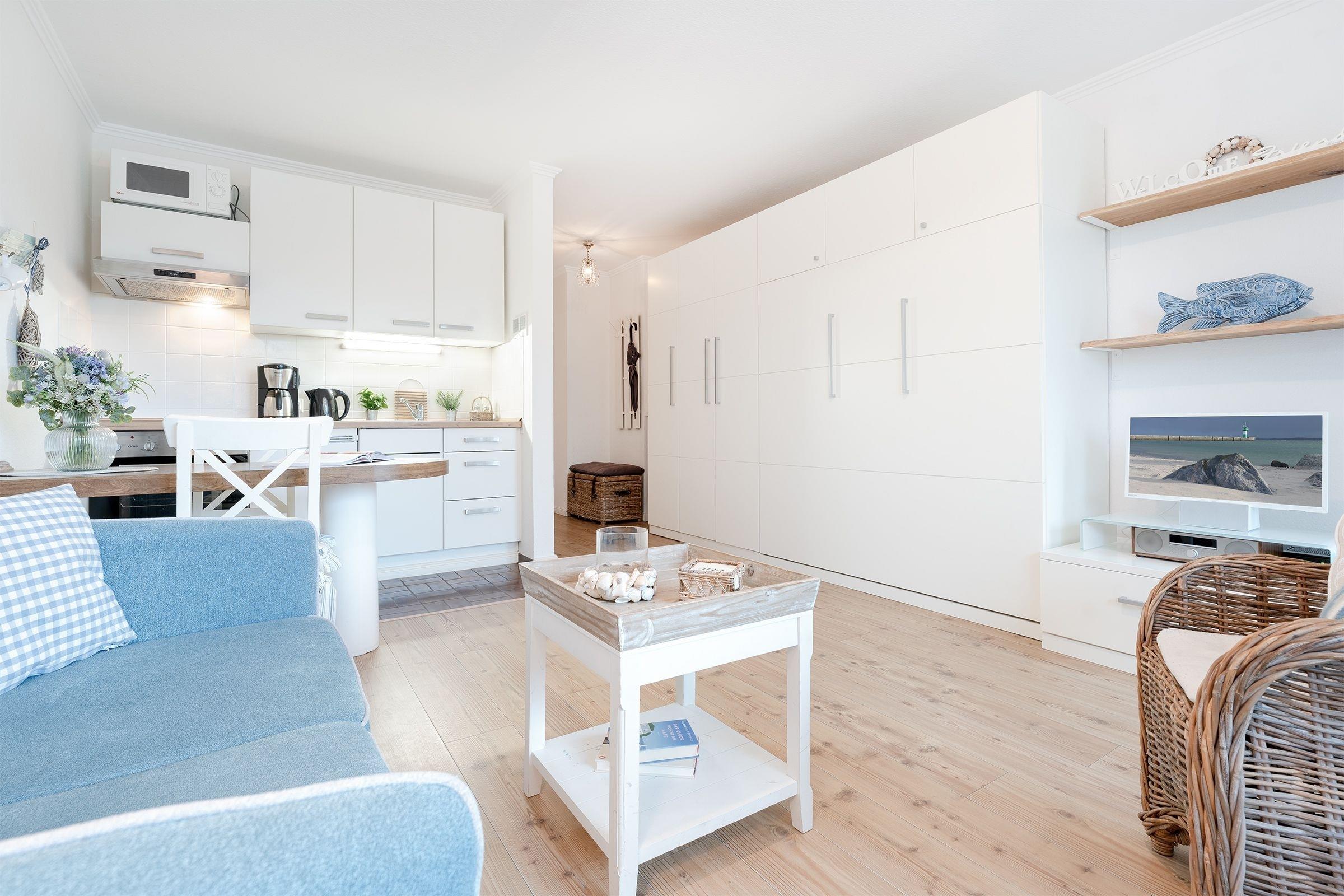 Lichtdurchflutet, hell und rundherum gemütlich begrüßt Sie dieses Kleinod in unmittelbarer Ostseenähe. Hochwertiges Laminat in schöner Holzoptik sorgt für ein angenehmes Wohnambiente. Damit Sie auch im Urlaub immer auf dem Laufenden bleiben, steht ein WLAN-Anschluss zur kostenlosen Nutzung bereit, Kabel-TV bietet zusätzliche Unterhaltung. In dem hochwertigen Schrankbett (160x190 cm) schlafen Sie so gemütlich wie zuhause. Machen Sie es sich abends auf dem Sofa bequem oder lassen Sie Ihre Urlaubstage entspannt auf dem großzügigen Balkon in Südlage mit Blick über Baumwipfel und seitlichem Meerblick ausklingen. Die blau glitzernde Ostsee ist hier zum Greifen nah!