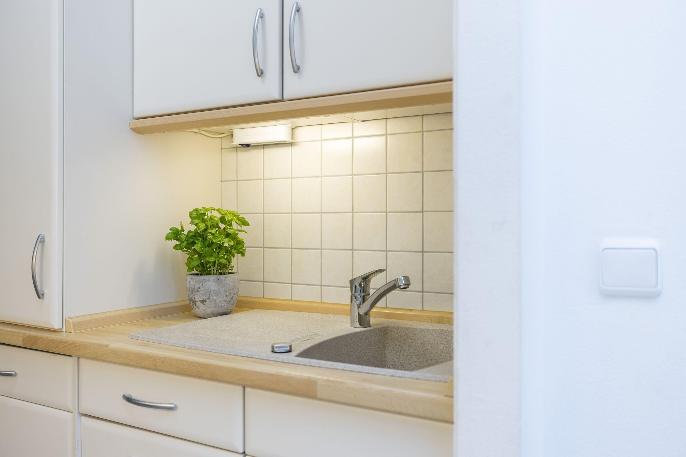 Der Flur führt in einen geräumigen Wohnbereich in dem die ganze Familie zusammen kommen kann. Hochwertige Möbel und ein Fernseher statten diesen Bereich aus. Verbringen Sie entspannte Stunden auf der Couch oder essen Sie gemeinsam am Esstisch. Von hier aus haben Sie Zugang zu einem Balkon, der mit gemütlichen Möbeln zum Verweilen einlädt. Starten Sie gemütlich in den Tag und genießen Sie die erfrischende Meeresluft bei einer Tasse Kaffee. Die Küche ist hochwertig ausgestattet. Hierzu gehört ein Kühlschrank inklusive ein Gefrierfach, ein Wasserkocher, eine Kaffeemaschine, Mikrowelle, Toaster, und ein Herd. Für ausreichend Komfort im Urlaub steht hier auch eine Spülmaschine bereit. Ein WLAN-Anschluss gehört ebenfalls zur Ausstattung.