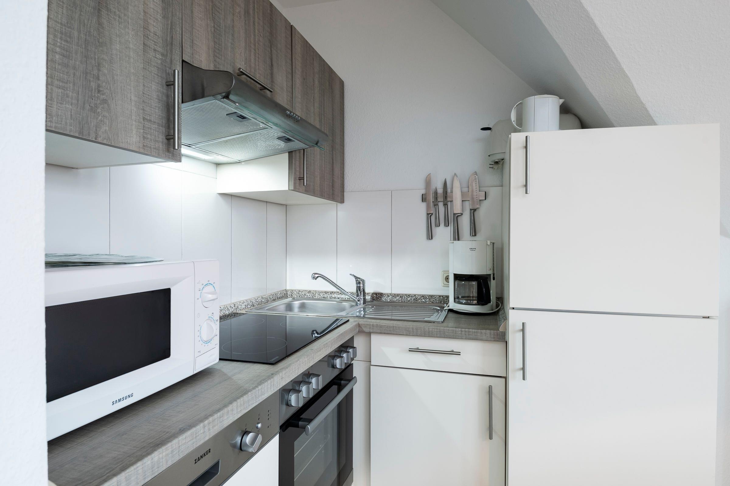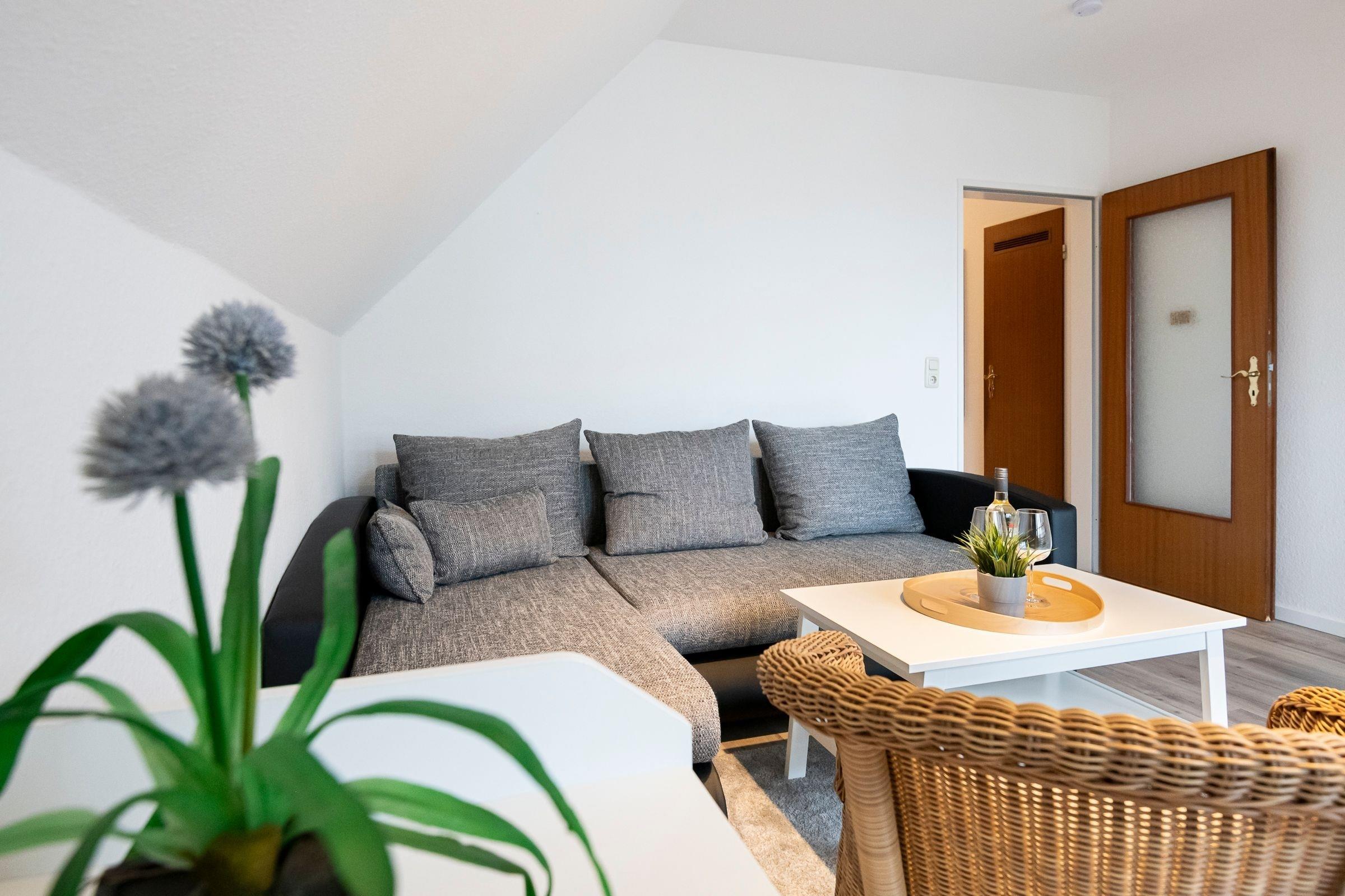 Auf zwei Zimmer verteilen sich hier das Schlafzimmer mit einem Doppelbett (2x 90x200 cm) und TV sowie das helle Wohnzimmer im Landhausstil mit gemütlicher Schlafcouch (140x190 cm), angrenzender offener Küche und Essbereich. Für Unterhaltung sorgen ein TV und ein CD-Player. Vom Wohnzimmer haben Sie Zugang zum möblierten Balkon. Starten Sie hier direkt Ihren Tag mit frischen Brötchen und heißem Kaffee. Die Küche ist z. B. mit Backofen, Gefrierfach, Herd, Kaffeemaschine, Kühlschrank, Mikrowelle und Spülmaschine voll ausgestattet. Das moderne Bad mit Dusche und Föhn rundet diese Ferienwohnung ab. Der WLAN-Anschluss ist inklusive.