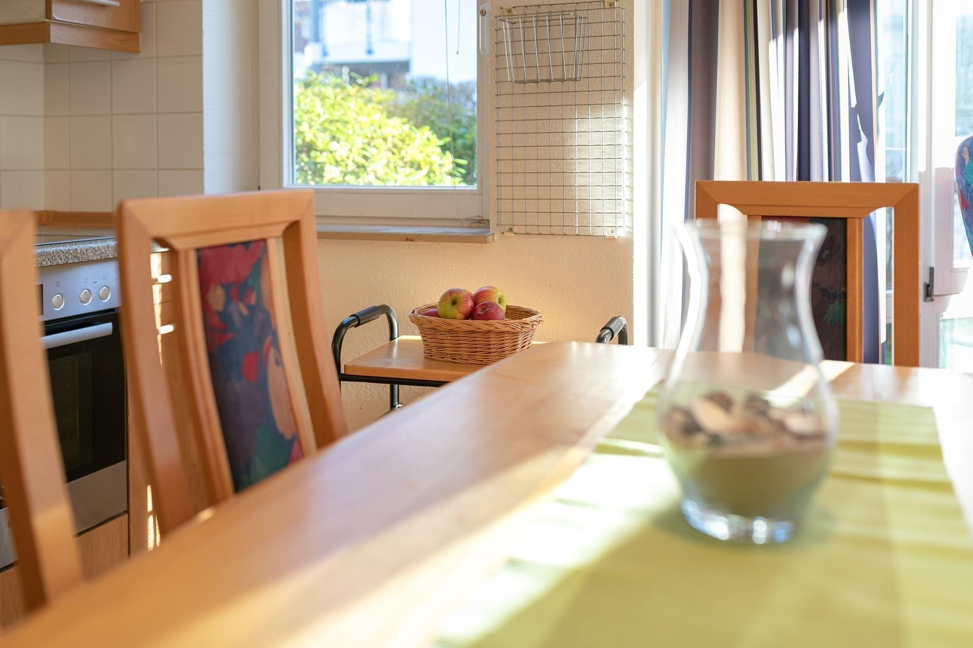 Das Appartement ist modern und sehr geschmackvoll eingerichtet. Es gibt zwei Schlafräume, welche über ein Doppelbett (2x 80x200 cm) bzw. über ein Einzelbett (80x200 cm) und ein Doppelstockbett (je 90x200 cm) verfügen. Ein Gästebett (Einzelbett/Klappbett) steht als 6. Schlafmöglichkeit bereit. Im Wohnraum befinden sich eine Couchgarnitur mit Sessel, eine Musikanlage und einen TV. Die offene Küchenzeile ist ausgestattet mit Kühlschrank inkl. Gefrierfach, 4-Plattenherd, Backofen, Geschirrspüler, Kaffeemaschine, Wasserkocher und Toaster. Der separate Esstisch ist sehr gemütlich und dient unter anderem als Essplatz. Die Terrasse bietet eine schöne Ausrichtung zum Garten und zur Sonne und verfügt über Gartenmöbel.