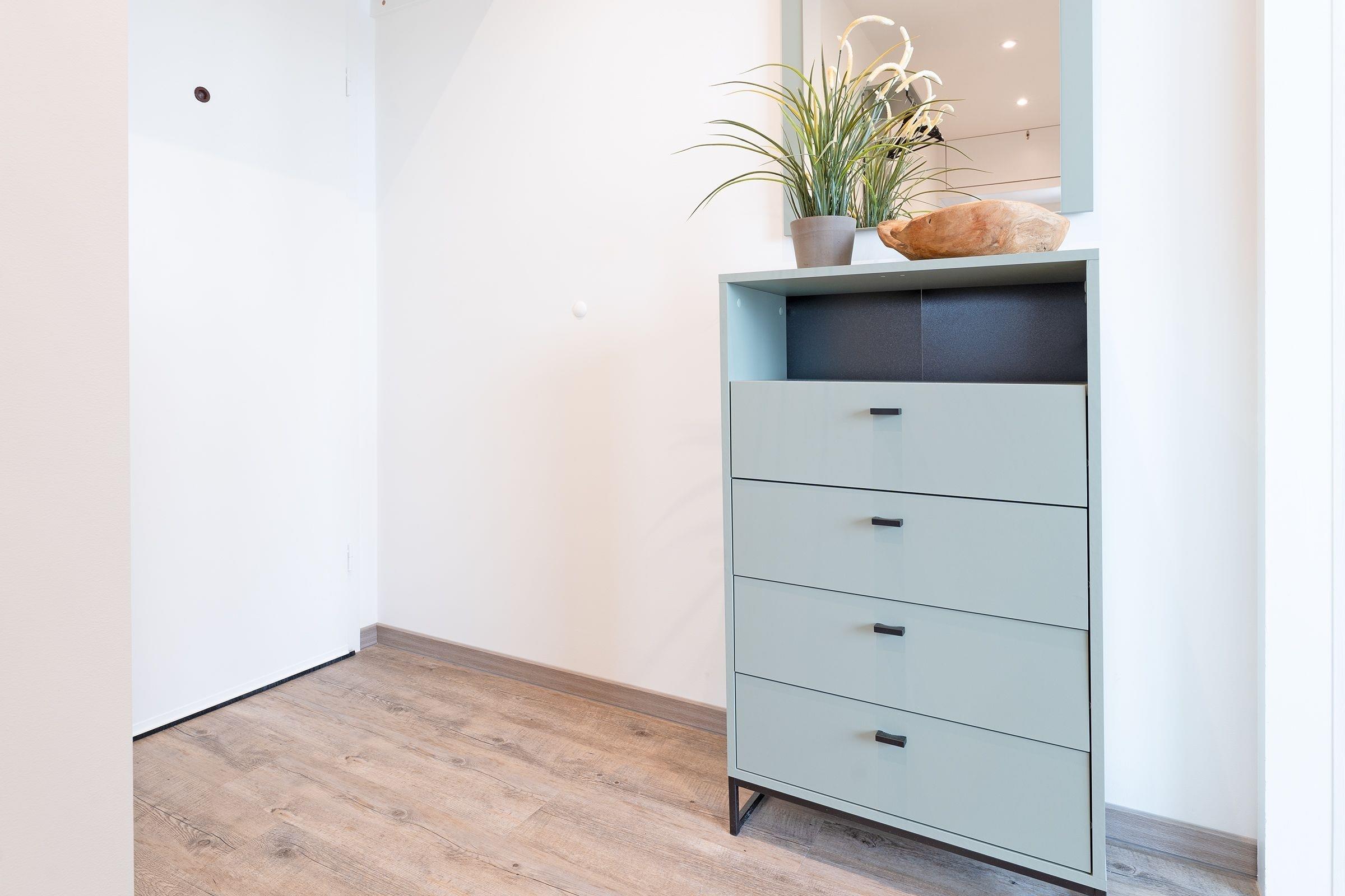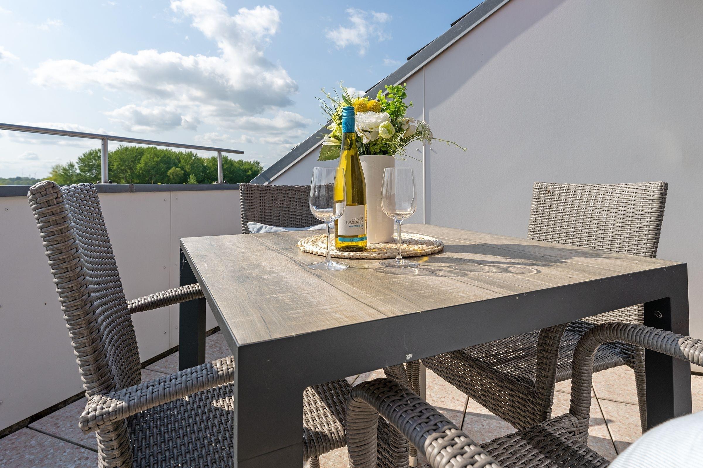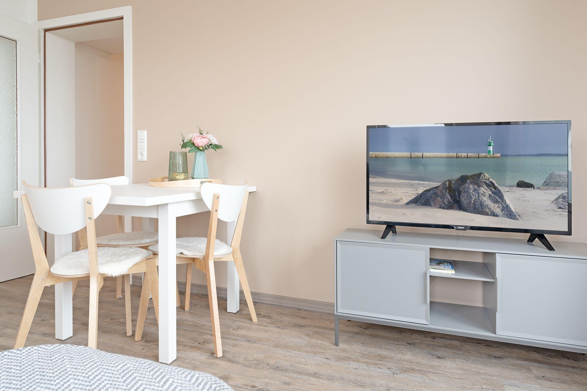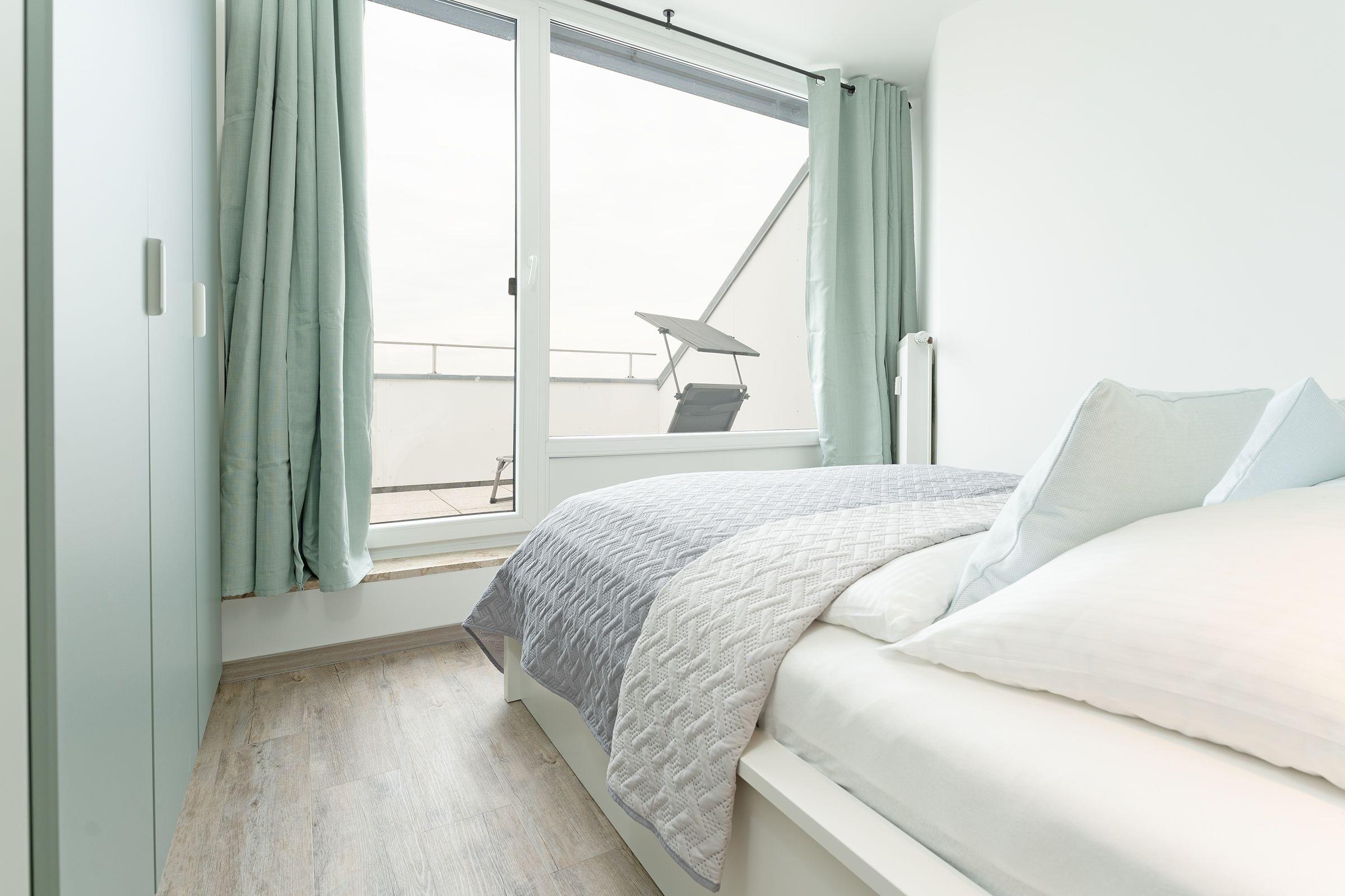 Im Wohnraum befindet sich eine gemütliche Couchgarnitur, welche sich zu einem vollwertigem Doppelbett (140x200 cm) ausklappen lässt. Außerdem finden sie hier eine Musikanlage, einen modernen Smart-TV und einen kostenlosen WLAN-Anschluss. Das Schlafzimmer mit großzügigem Doppelbett (2x 80x200 cm) verfügt über eine eigene Loggia in Richtung Sonne. Die neuwertige Küchenzeile ist ausgestattet mit Kühlschrank mit Gefrierfach, 4-Plattenherd, Kaffeemaschine, Wasserkocher und Toaster. Das Badezimmer ist modern und geschmackvoll gestaltet und begeistert unter anderem mit einer geräumigen Dusche mit bodentiefem Einstieg. Der möblierte Balkon bietet über das Dach hinweg einen seitlichen Meerblick, lassen Sie den Blick in Richtung Dünenmeile streifen und lauschen dem Klang der Wellen und Möwen.