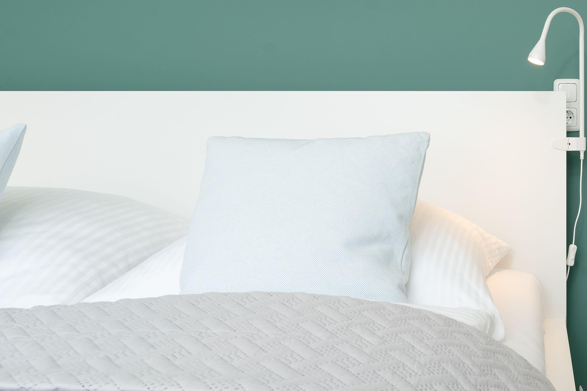 Schlafzimmer: 1 Doppelbett (2x 80x200 cm), Kleiderschrank, Verdunklung (Plissee, Gardinen)