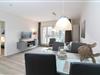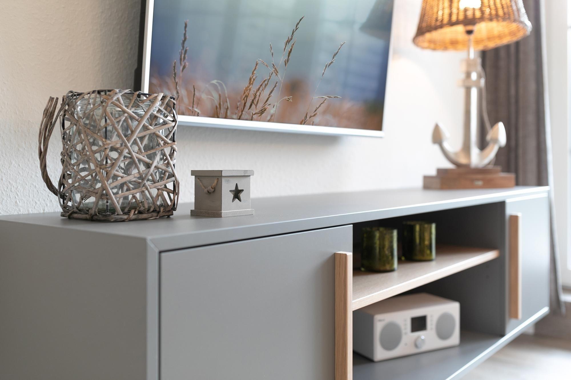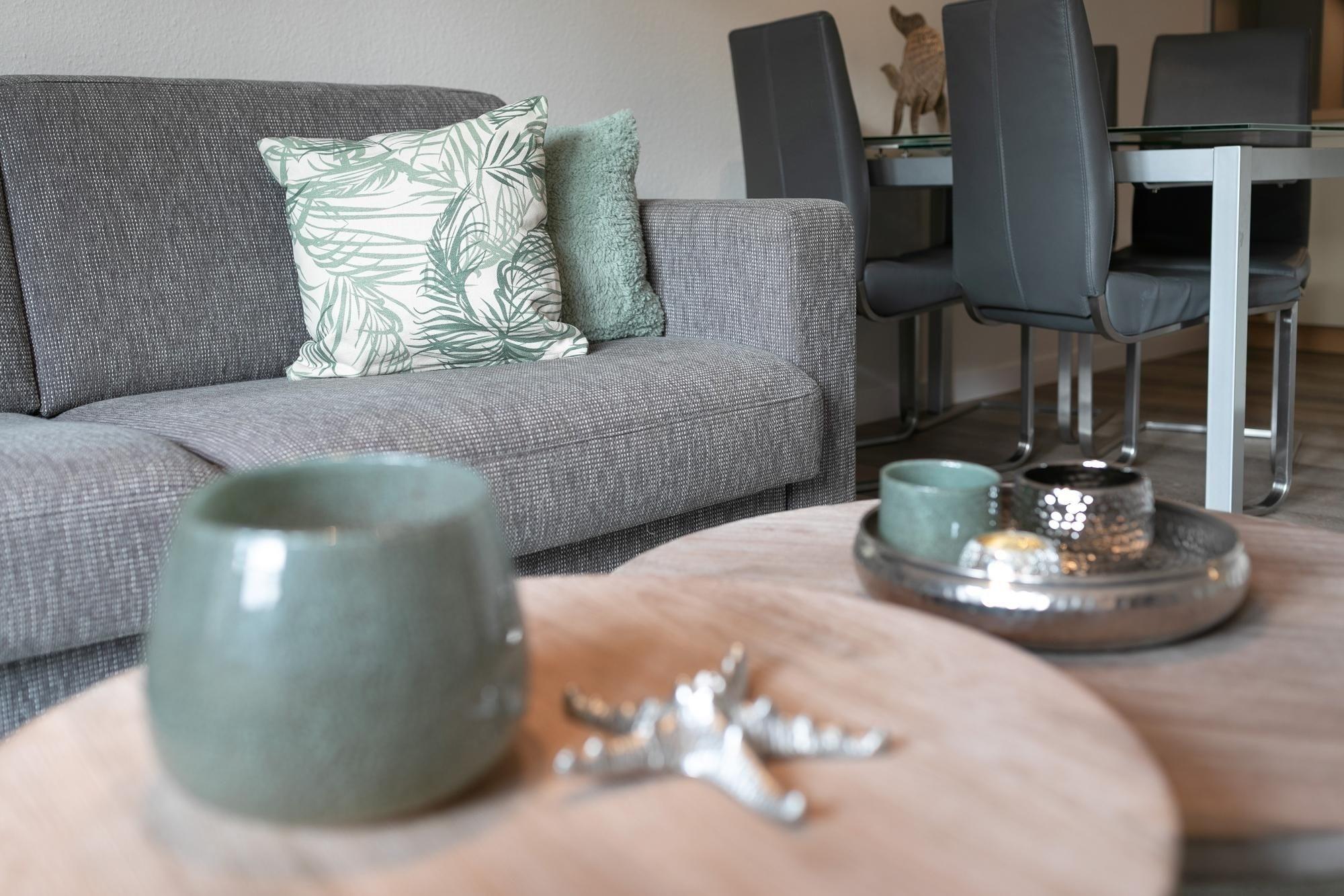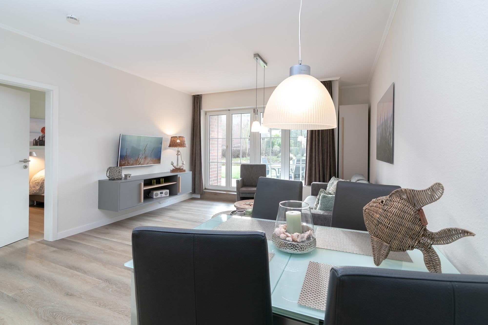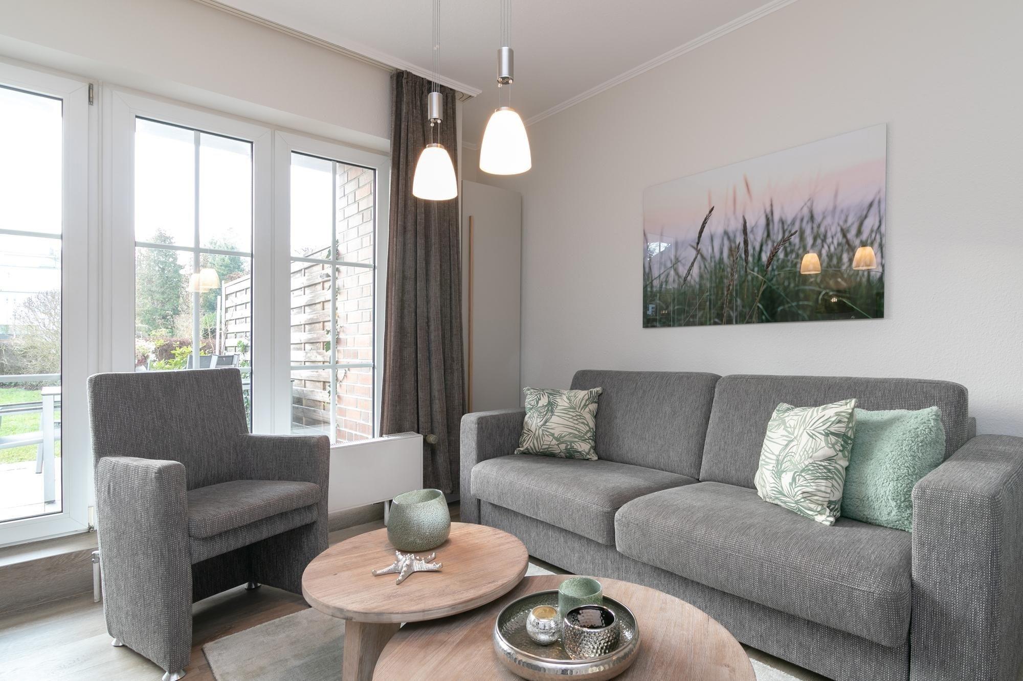 Im Wohnraum befinden sich eine Couchgarnitur, welche zu einem Doppelbett (170x 190 cm) ausgezogen werden kann, außerdem stehen eine Musikanlage und ein TV bereit. Die offene Küche ist ausgestattet mit einem Kühlschrank mit Gefrierfach, 4-Plattenherd, Backofen, Geschirrspüler, Kaffeemaschine, Wasserkocher und Toaster. Am Esstisch finden 4 Personen genug Platz. Die Terrasse mit angrenzendem Rasenstück bietet eine schöne Ausrichtung zur Sonne und verfügt über Gartenmöbel.