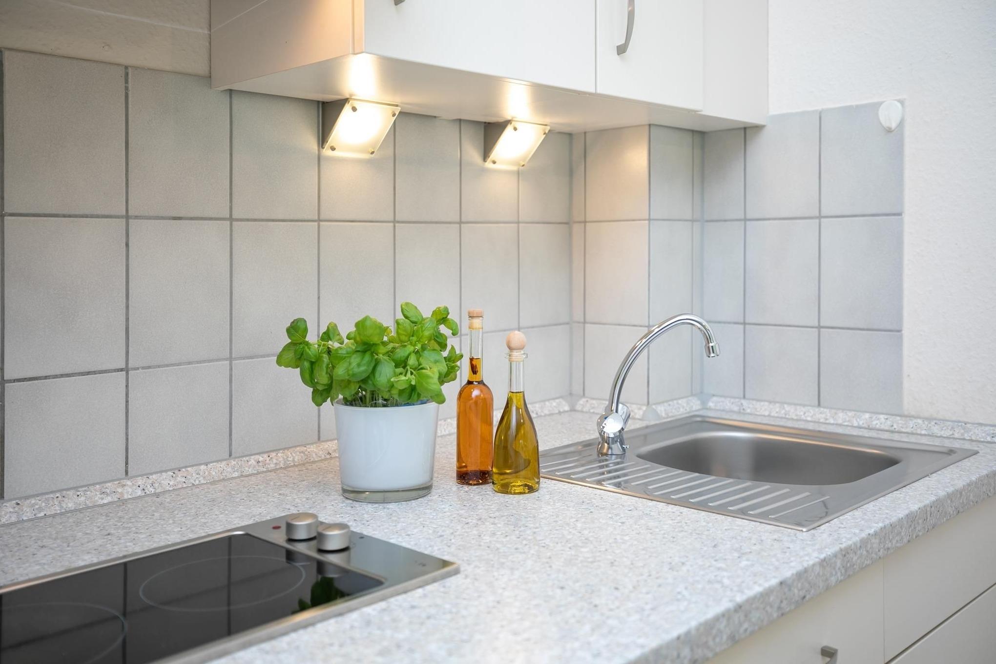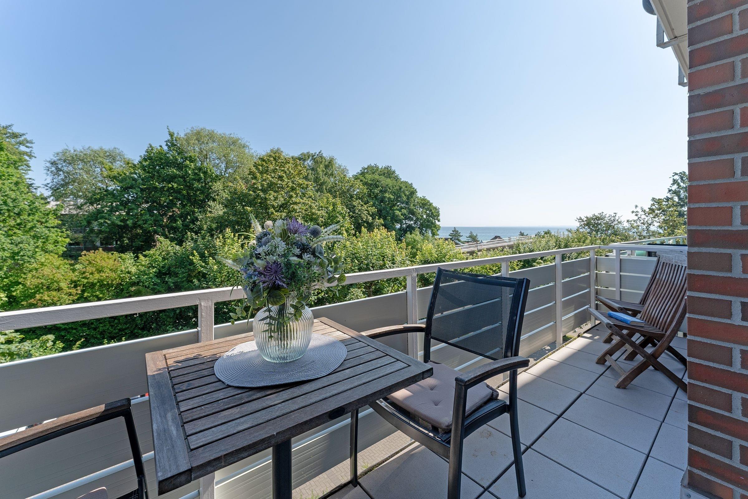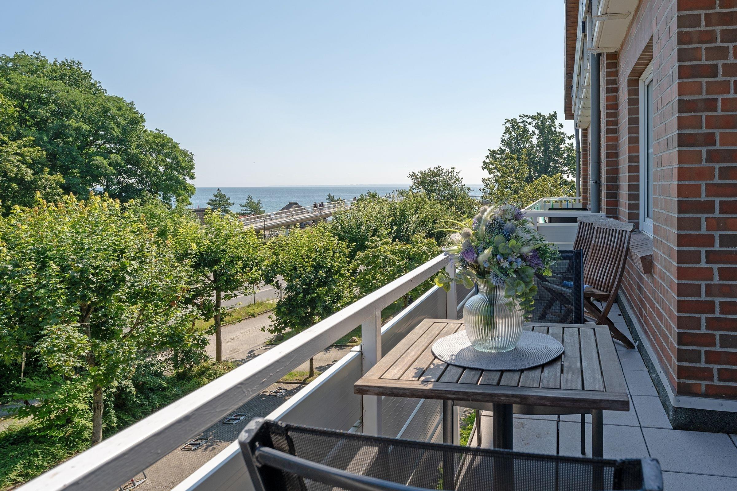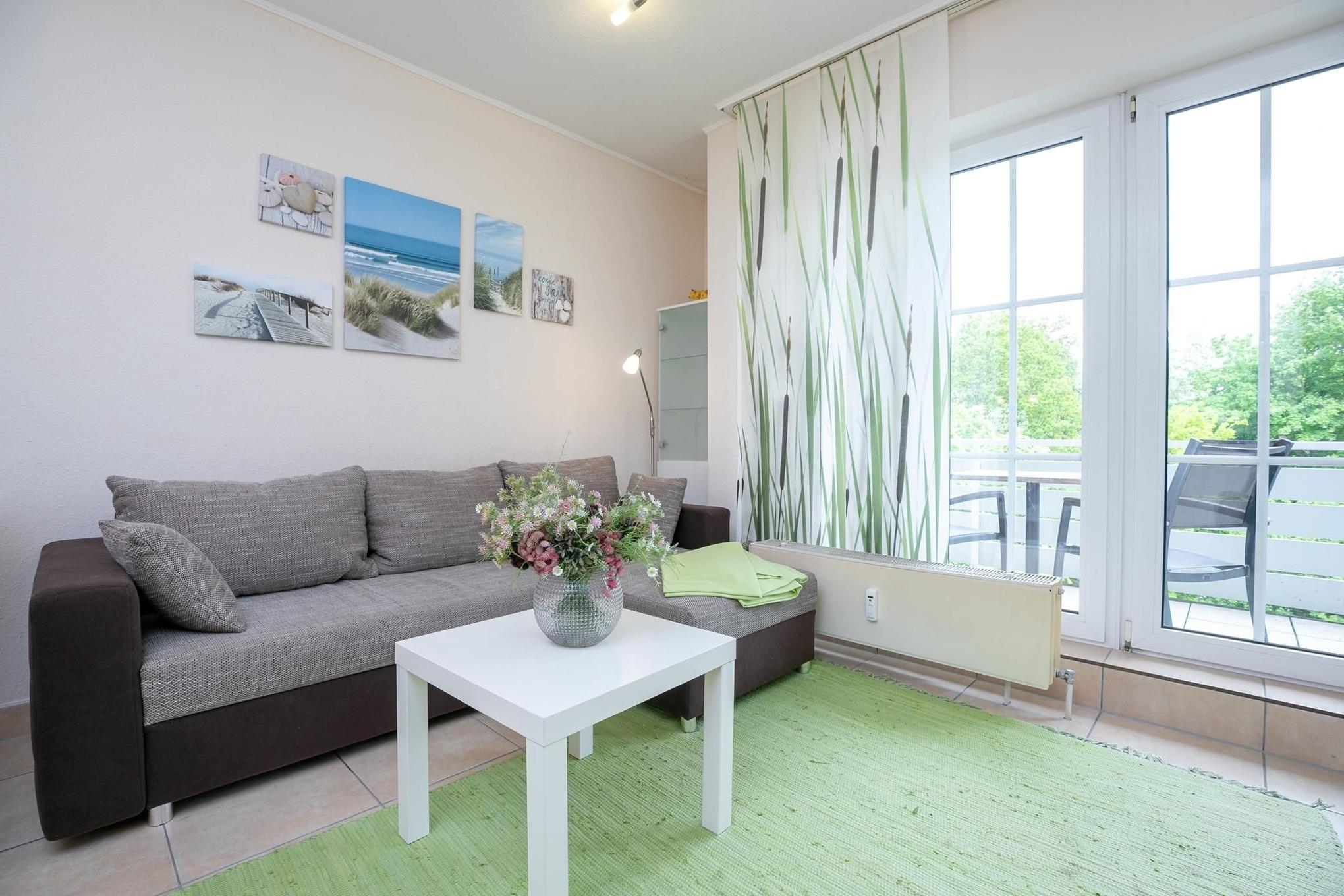 Die Ferienwohnung ist modern und geschmackvoll eingerichtet, sodass Sie sich sofort wohlfühlen werden. Im gemütlichen Wohnraum befinden sich eine Couchgarnitur mit Schlaffunktion (120x200 cm) und ein Smart-TV zum Entspannen. Die Küchenzeile ist ausgestattet mit Kühlschrank, einem Mini-Backofen, Gefrierfach, Geschirrspüler, 2-Plattenherd, Kaffeemaschine, Wasserkocher und Toaster. Genau daneben steht ein Esstisch zum Speisen. Vielleicht möchten Sie das schöne Wetter und die gute Ostseeluft genießen? Dann machen Sie es sich gemütlich auf dem möblierten Balkon mit schöner Sicht Richtung Ostsee. Zum nächtlichen Träumen lädt ein bequemes Boxspringbett (180x200 cm) im separaten Schlafzimmer ein. Das Duschbad ist hell gefliest.