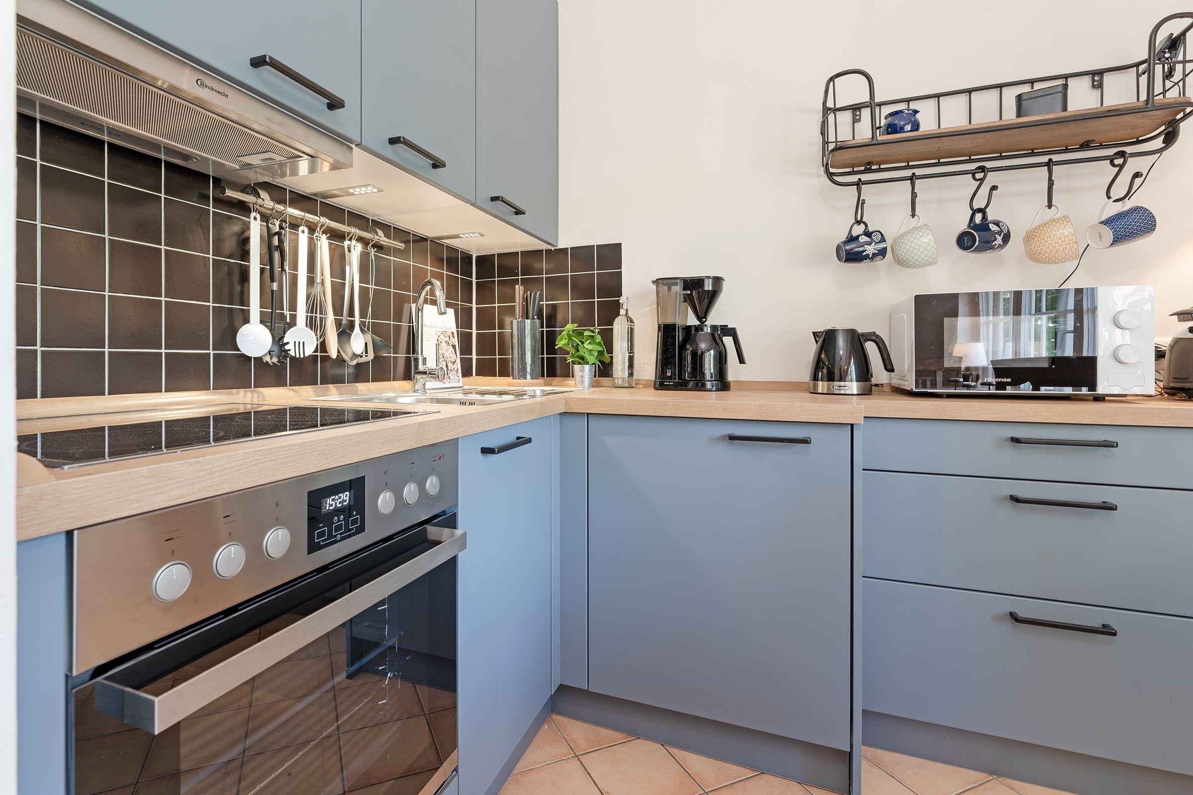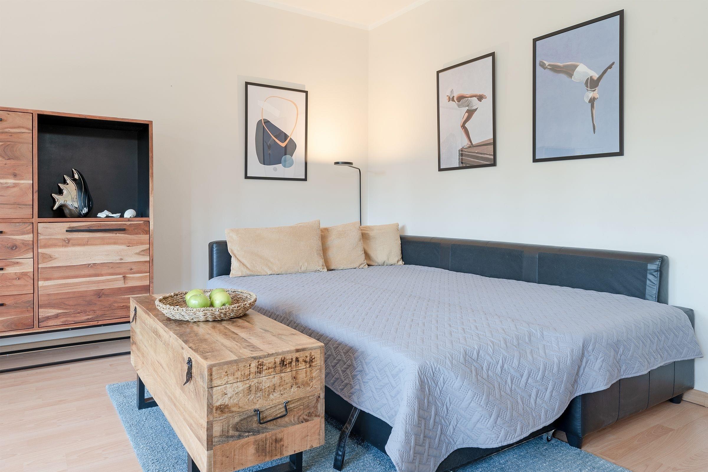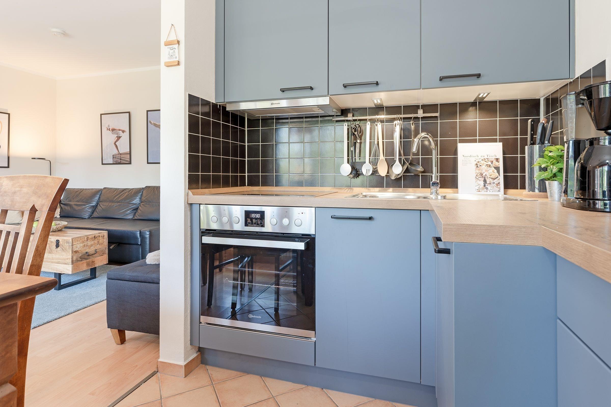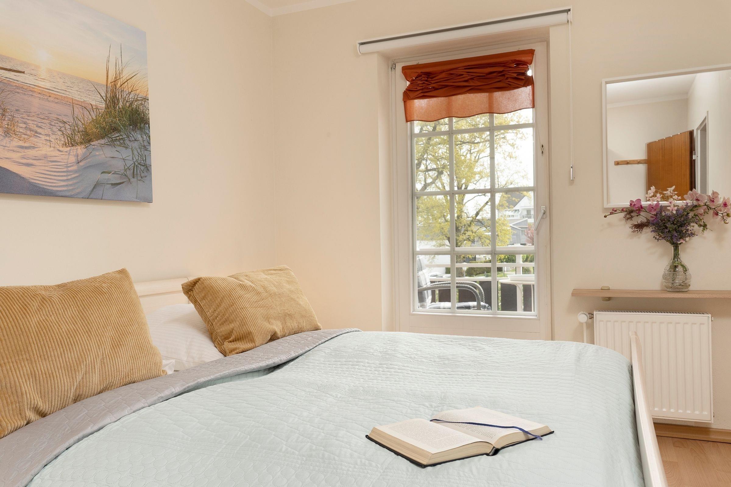 Im Wohnraum befindet sich eine Couch, die bei Bedarf zu einer weiteren Schlafmöglichkeit (140x200 cm) ausgeklappt werden kann, eine Musikanlage und ein Flachbild-TV. Die moderne integrierte Küchenzeile ist mit vielen Annehmlichkeiten ausgestattet, zudem lädt der großzügige Esstisch zu gemeinsamen Mahlzeiten oder Spieleabenden ein. Relaxen Sie auf dem angrenzenden Balkon, nehmen Platz auf den bequemen Gartenmöbeln und lassen Sie den Blick ins Grüne schweifen. Das Schlafzimmer verfügt über ein Doppelbett (2x 90x200 cm), zur Nacht können Sie das Zimmer mit einem Rollo angenehm abdunkeln. Von hier aus gelangen Sie auf den zweiten, kleineren Südost-Balkon, von dem Sie sogar einen Blick auf die Ostsee erhaschen können. Das moderne Duschbad verspricht einen guten Start in den Tag.