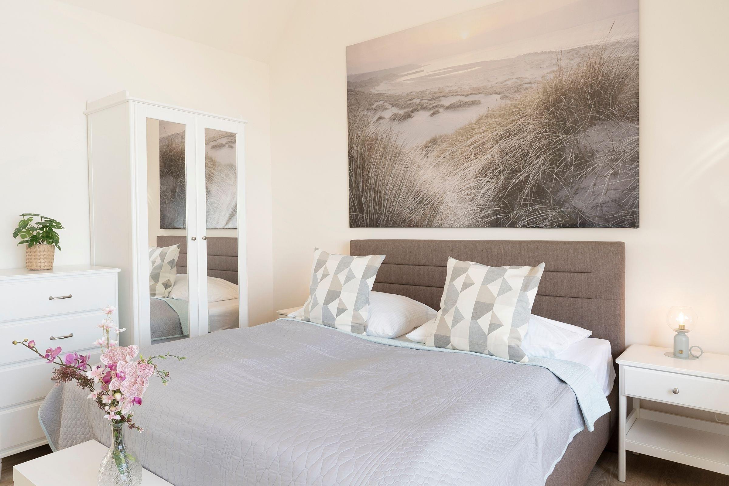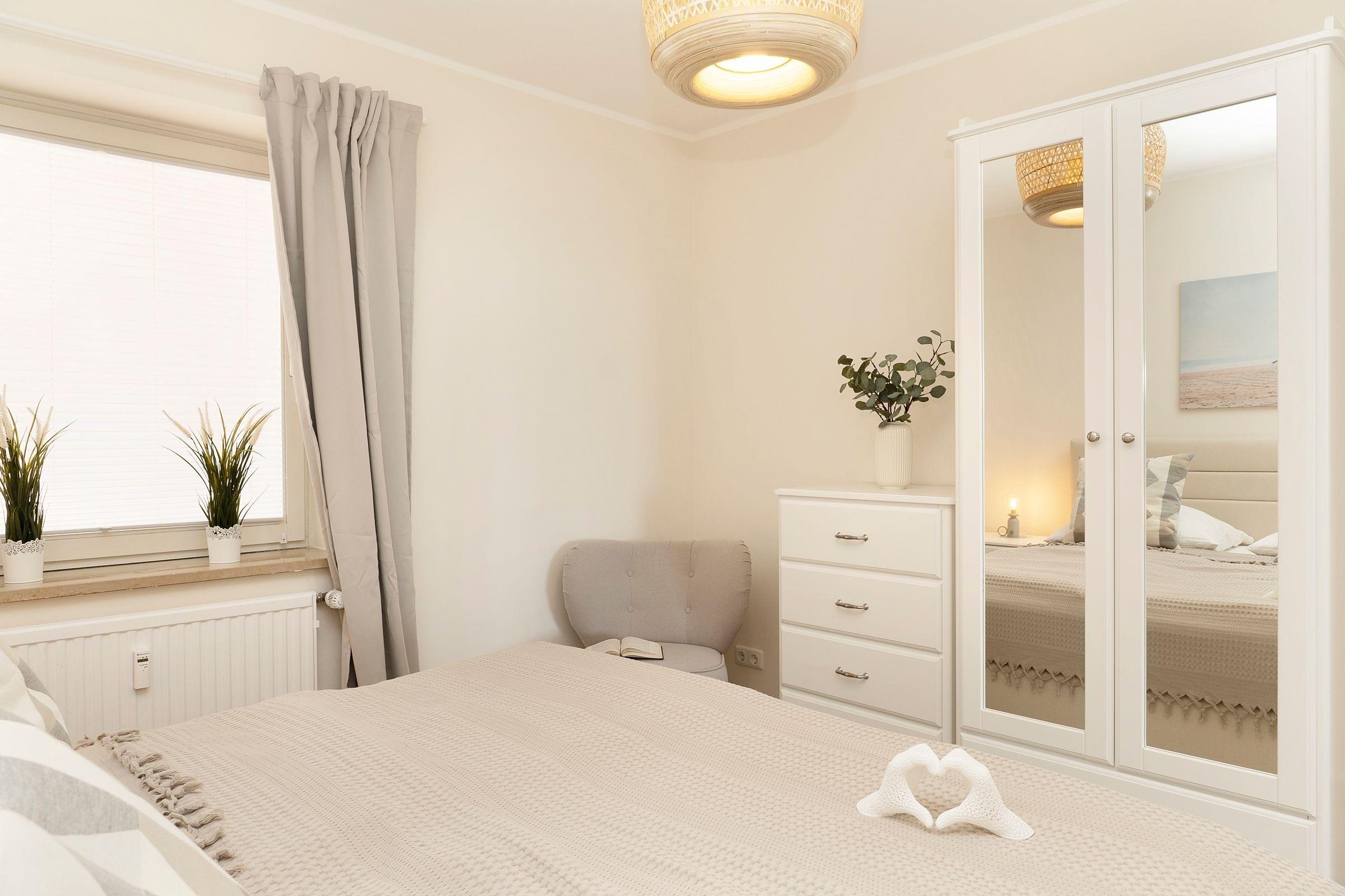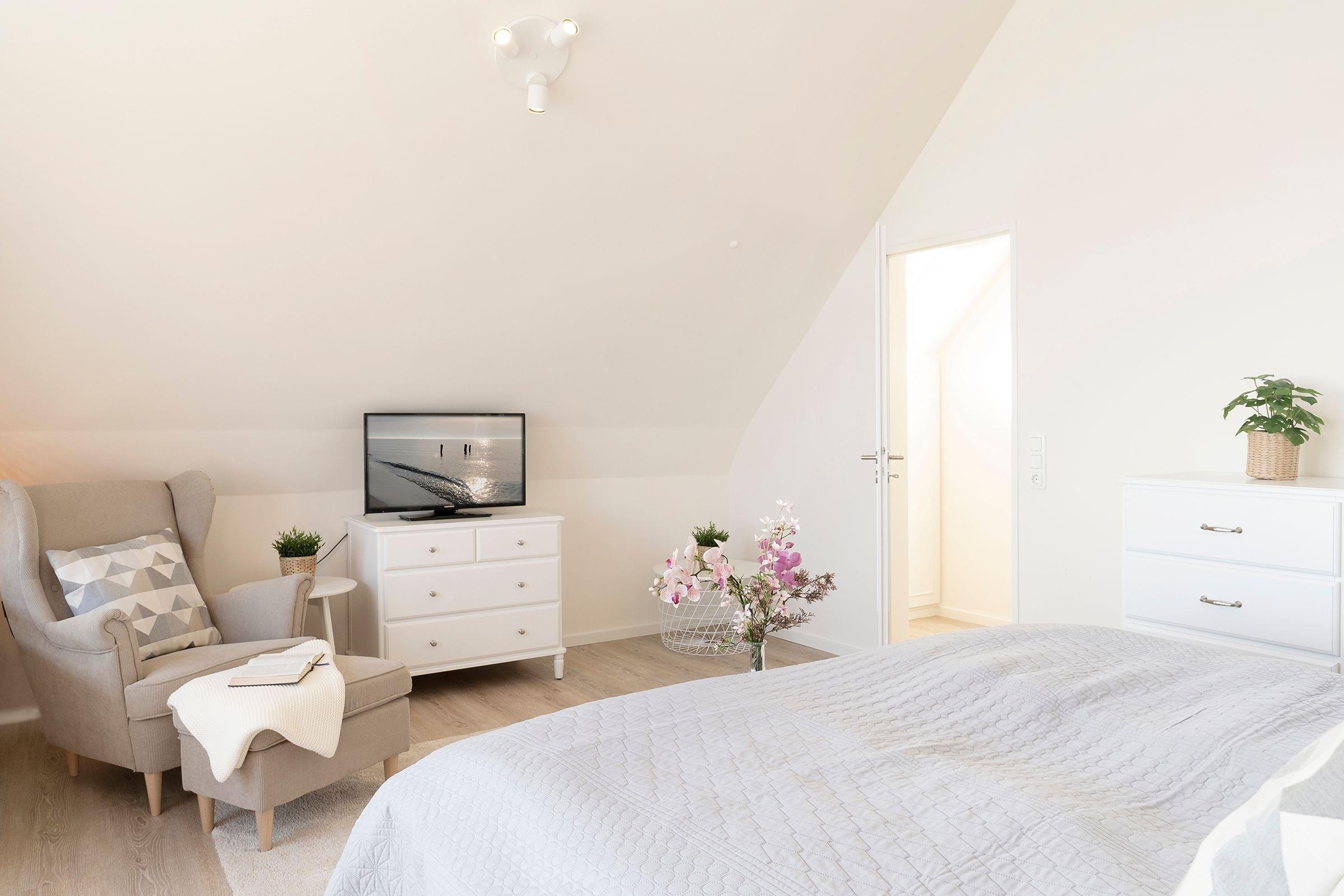 Im Obergeschoss Ihres Feriendomizils liegt ein weiteres Schlafzimmer, komfortabel ausgestattet mit bequemem Boxspring-Doppelbett (180x200 cm). Kleiderschrank und Kommode bieten reichlich Stauraum für Ihre Urlaubsgarderobe und ein 2. TV sorgt für Unterhaltung. Als absolutes Highlight verfügt dieses Schlafzimmer über einen direkten Zugang zu einem weiteren Balkon inklusive Meerblick. Das großzügige Wohlfühlbad erwartet Sie mit einer Badewanne mit Duschfunktion.