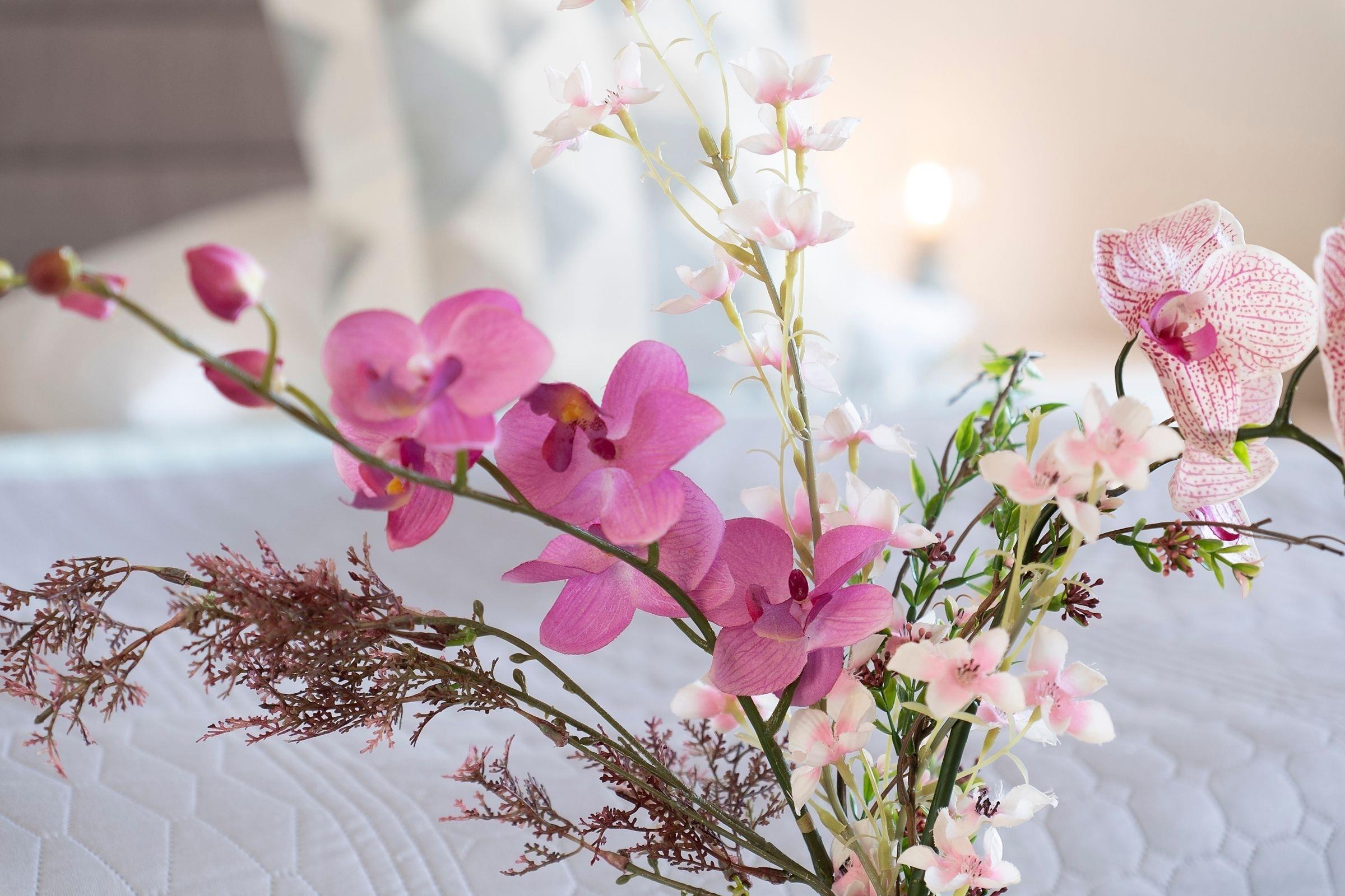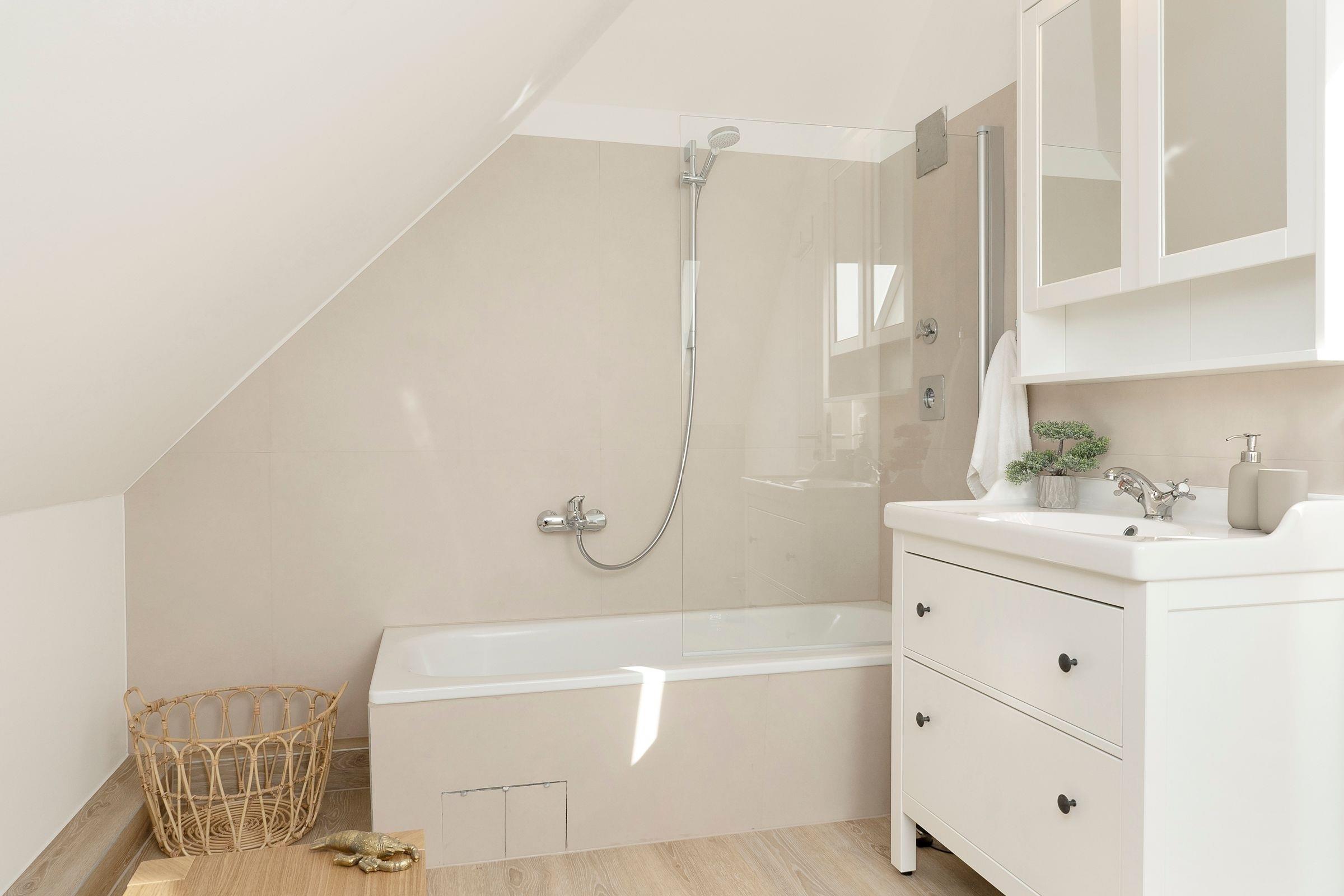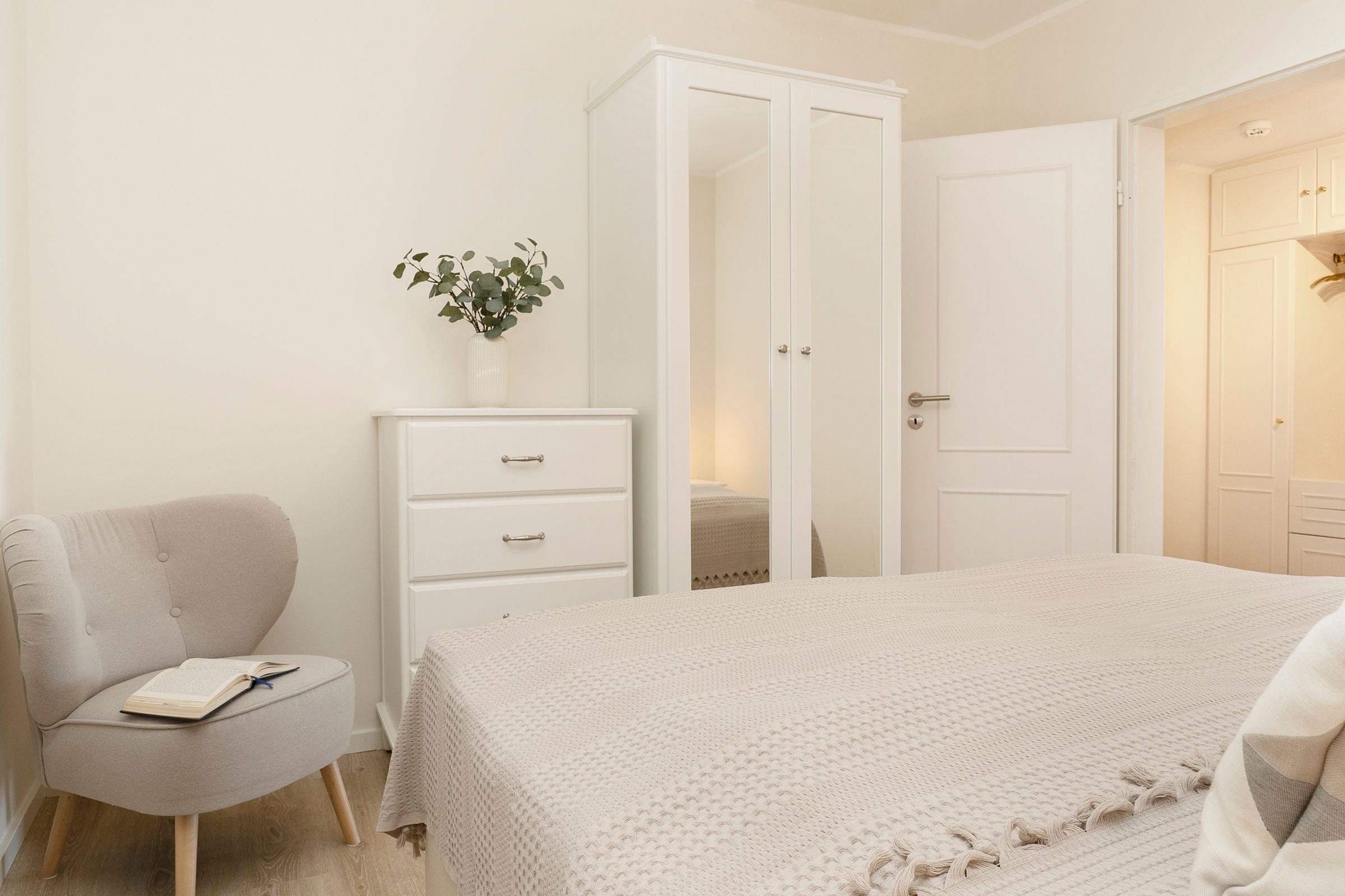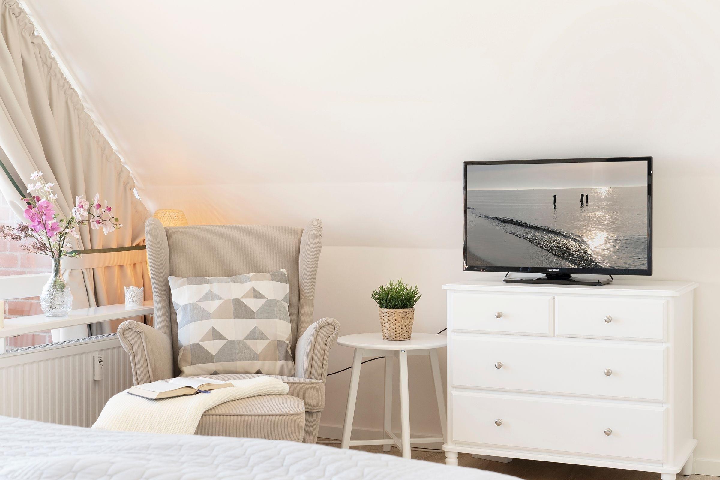 Im Obergeschoss Ihres Feriendomizils liegt ein weiteres Schlafzimmer, komfortabel ausgestattet mit bequemem Boxspring-Doppelbett (180x200 cm). Kleiderschrank und Kommode bieten reichlich Stauraum für Ihre Urlaubsgarderobe und ein 2. TV sorgt für Unterhaltung. Als absolutes Highlight verfügt dieses Schlafzimmer über einen direkten Zugang zu einem weiteren Balkon inklusive Meerblick. Das großzügige Wohlfühlbad erwartet Sie mit einer Badewanne mit Duschfunktion.
