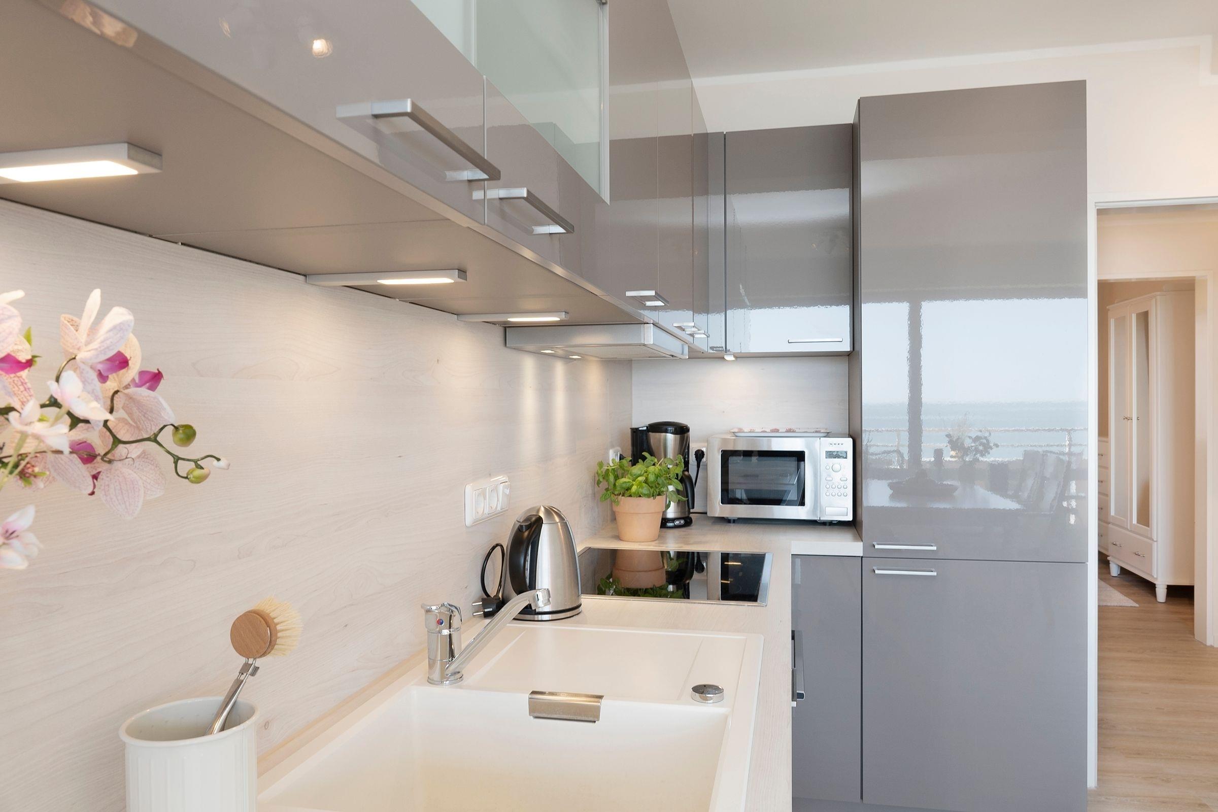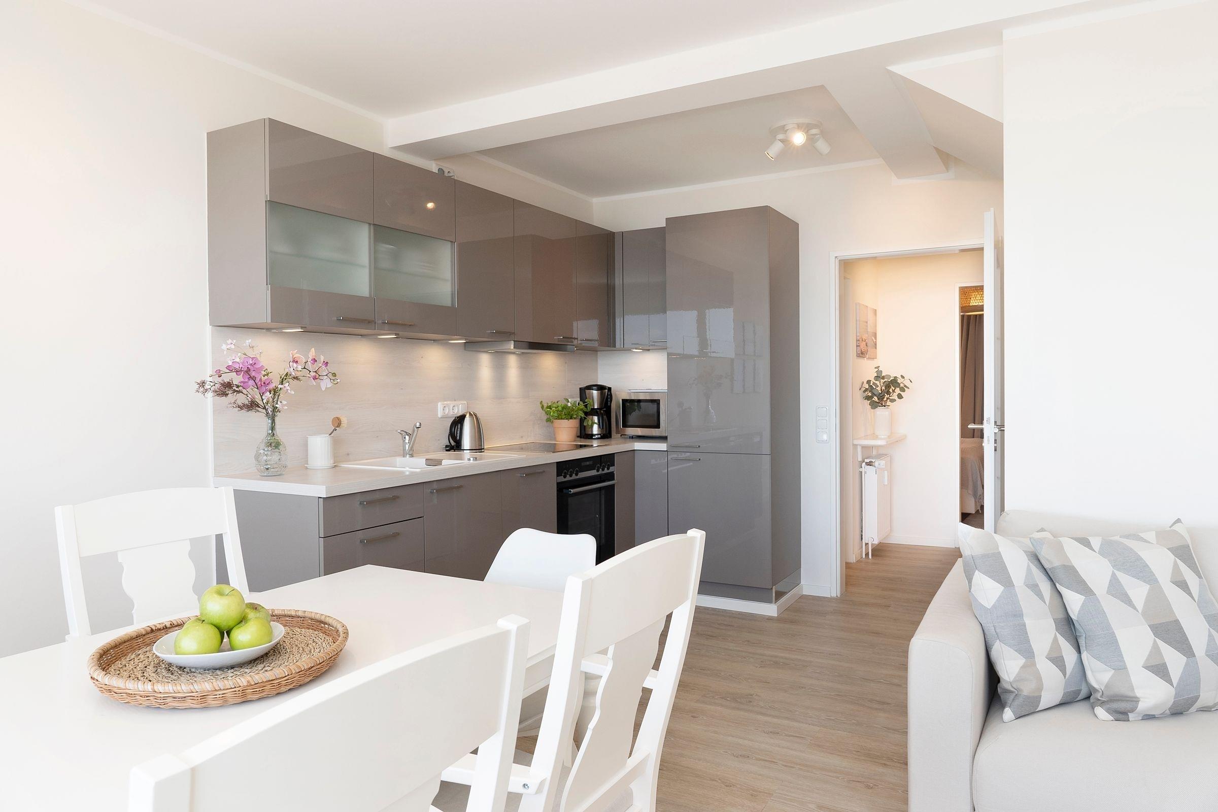 In dieser zauberhaften Ferienwohnung über 2 Etagen mit einer Wohnfläche von ca. 89 m², 2 separaten Schlafzimmern, kombiniertem Wohn-/Schlafraum mit integrierter Küchenzeile, Vollbad, Gäste-WC sowie 2 sonnigen Balkonen mit Meerblick finden max. 4 Erwachsene und 1 Kind ausreichend Platz und Komfort.