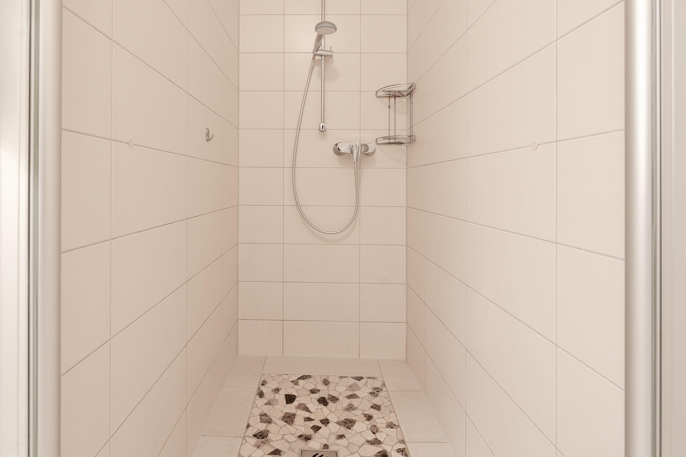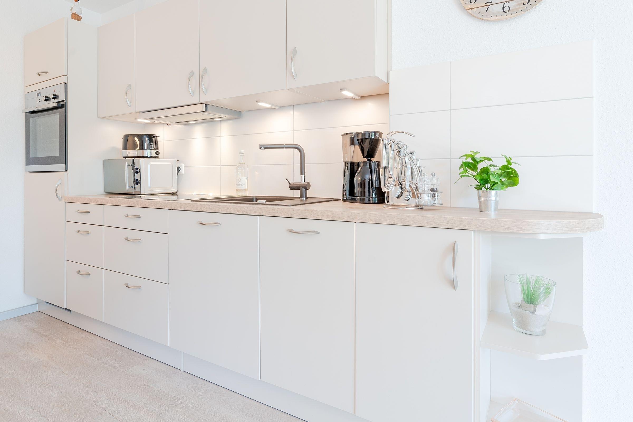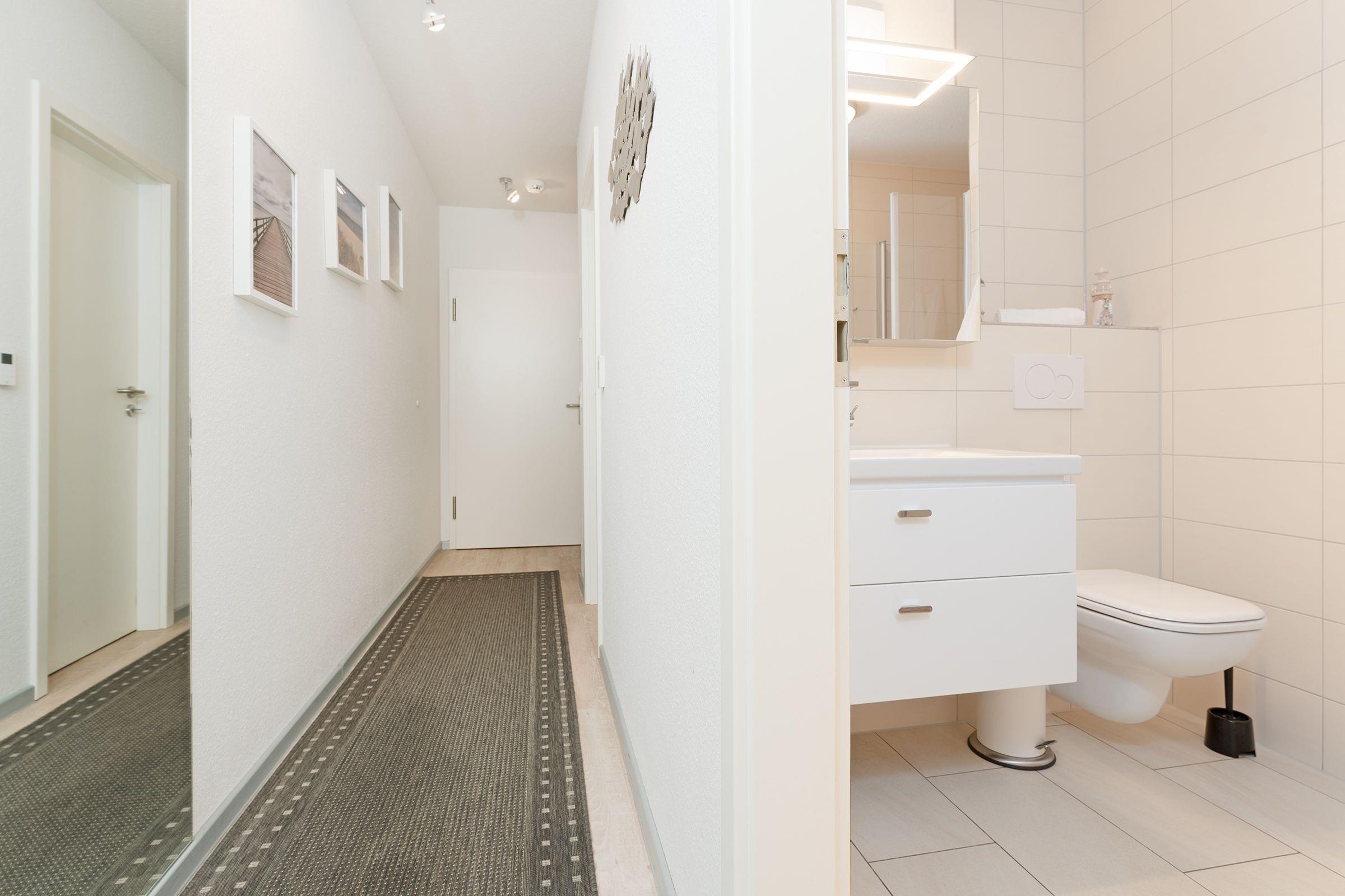 Im Eingangsflur säumen stimmungsvolle Muschelbilder den Weg bis zum Fahrstuhl. In der 2. Etage angekommen – hier liegt die Ferienwohnung Ostseeparadies. Ein langer Flur mit Garderobe empfängt Sie: Jacken aufgehängt, Schuhe ausgezogen und zuerst Ihre Urlaubskoffer zum Schlafzimmer durch das Wohnzimmer mit offener Küche getragen. In aller Ruhe können Sie nun auspacken! Ausreichend Platz ist im großen Schiebetürenschrank mit Spiegel für Ihre Urlaubsgarderobe. Das Boxspringbett (durchgehender Topper mit 180x200 cm) ist fantastisch bequem - freuen Sie sich schon jetzt auf eine erholsame Nachtruhe. Gönnen Sie sich jetzt einen frisch gebrühten Kaffee. Die moderne Küche ist mit allem ausgestattet, was Sie sich wünschen. Ein Esstisch ist gleich daneben. Nehmen Sie Platz auf dem komfortablen Eckledersofa und genießen Sie Ihren Kaffee oder natürlich bei herrlichem Wetter gerne auf dem überdachten Balkon. Über erste Ausflugstipps können Sie sich online informieren, kostenfreies WLAN ist selbstverständlich inklusive. Schnell noch etwas erfrischen - ein Duschbad mit ebenerdiger Dusche, WC, Handtuchwärmer und Föhn rundet das Gesamtbild der Ferienwohnung ab. Ihre Wohlfühltemperatur können Sie über das Einstellen der Fußbodenheizung bestimmen. Im Schlafzimmer und Wohnbereich sind außerdem elektrische Außenrollläden angebracht ... So und jetzt geht’s erst mal los zu einem Spaziergang zum Strand.