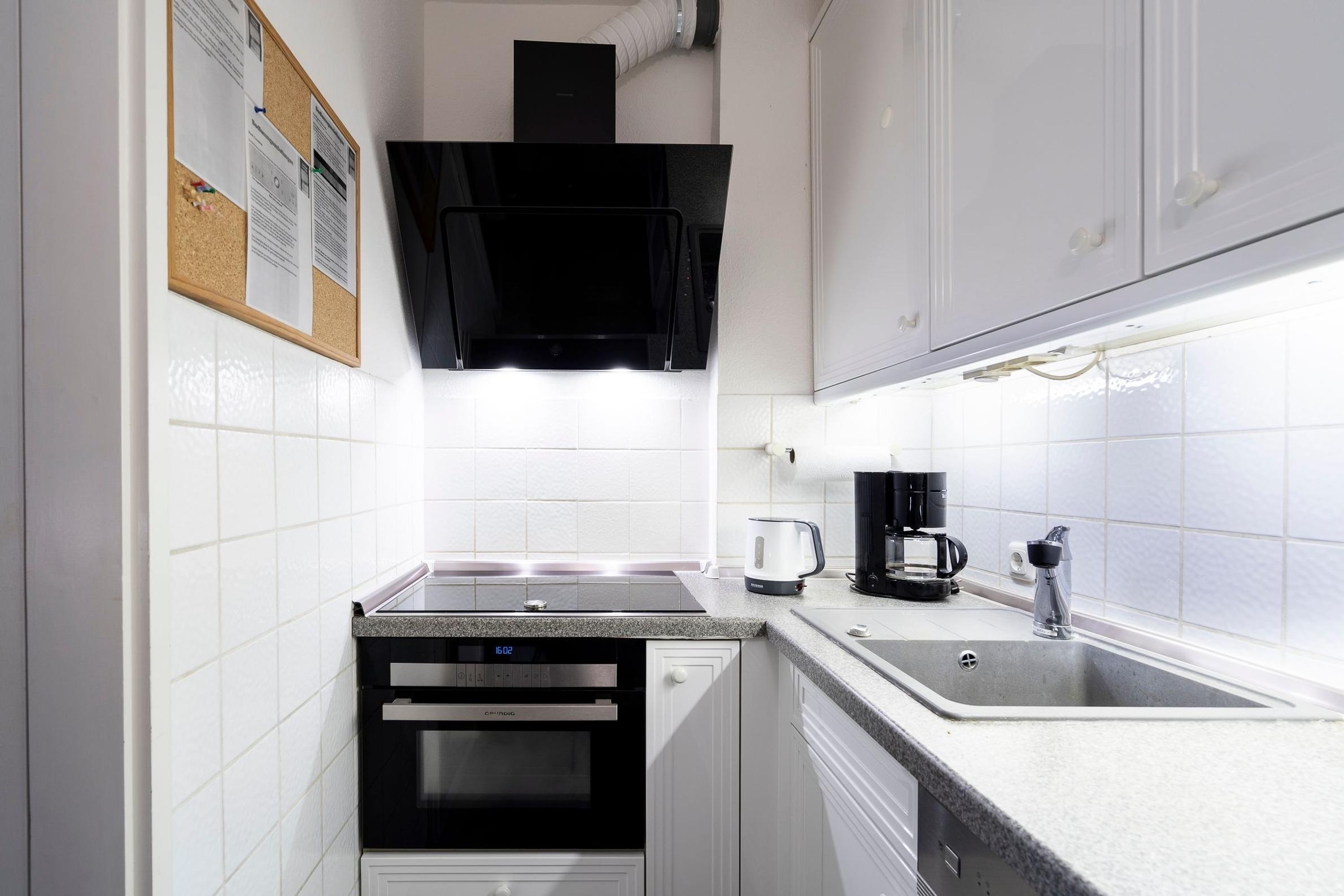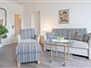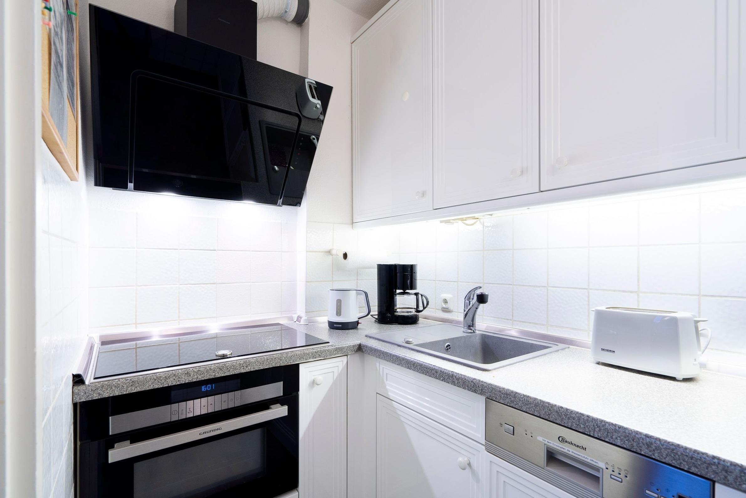 Es erwartet Sie ein großes, lichtdurchflutetes Wohnzimmer mit Essecke und gemütlicher Sitzgruppe sowie eine sehr gut ausgestattete Einbauküche mit Geschirrspüler, Herd, Backofen und Kühlschrank. Im Schlafzimmer steht ein großes Doppelbett-Boxspringbett (180x200 cm) für geruhsame Nächte zudem finden Sie hier reichlich Stauraum für Ihr Urlaubsgepäck. Durch Gardinen lässt sich das Schlafzimmer angenehm abdunkeln.