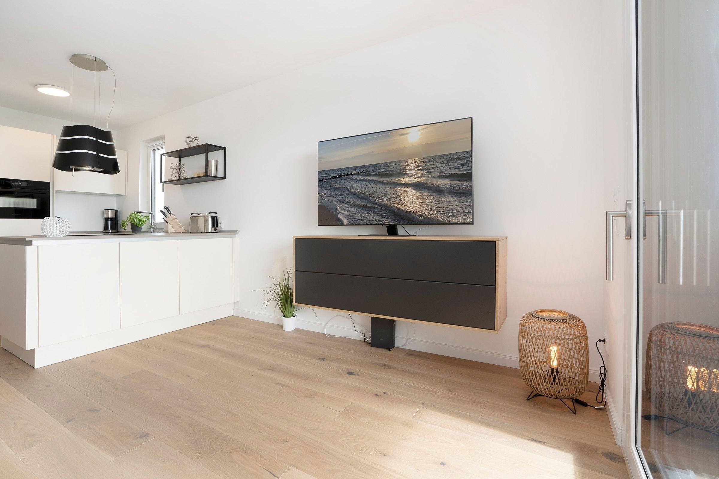 Durch die großen Fensterfronten ist das Wohnzimmer hell und gemütlich. Von hier haben Sie Zugang zum möblierten ca. 15m² großen Balkon mit herrlichem Blick auf die Ostsee. Die offene Küche ist sehr gut ausgestattet, um ein leckeres Essen zuzubereiten. Der Esstisch bietet genug Platz für bis zu 4 Personen. Für erholsame Nächte ziehen Sie sich in das separate Schlafzimmer zurück, es erwartet Sie ein komfortables Doppelbett (2x 90x200 cm) sowie ein Kleiderschrank. Die kleinen Gäste können es sich auf dem Schlafsofa bequem machen (Liegefläche 140x240 cm), beide Schlafzimmer lassen sich angenehm verdunkeln. Das moderne Badezimmer unterstreicht die geschmackvolle Ausstattung dieser tollen Ferienwohnung.