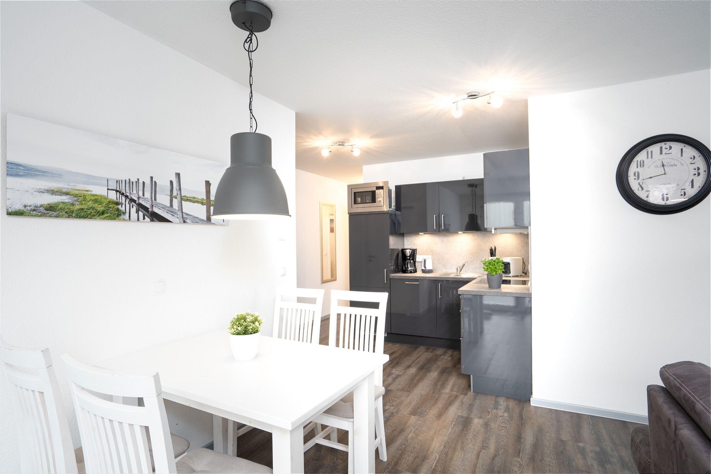 Das Wohnzimmer ist mit einem bequemen Ecksofa und einem Flachbildfernseher ausgestattet und lädt zu geselligen Abenden ein. In der offenen, gut ausgestatteten Küche finden Sie neben einem Backofen und einem Geschirrspüler viele weitere Annehmlichkeiten. Freuen Sie sich in den zwei separaten Schlafzimmern auf bequeme Boxspring-Doppelbetten (je 2x 90x200 cm) und auf zwei zusätzliche Fernseher. In beiden Badezimmern sind WC und Dusche vorhanden. Die Fußbodenheizung sorgt für eine angenehme Wärme. Die gesamte Wohnung lässt sich durch Außenjalousien verdunkeln. Auf der möblierten Terrasse können Sie sich vom Alltag erholen und schöne Urlaubsstunden verbringen.