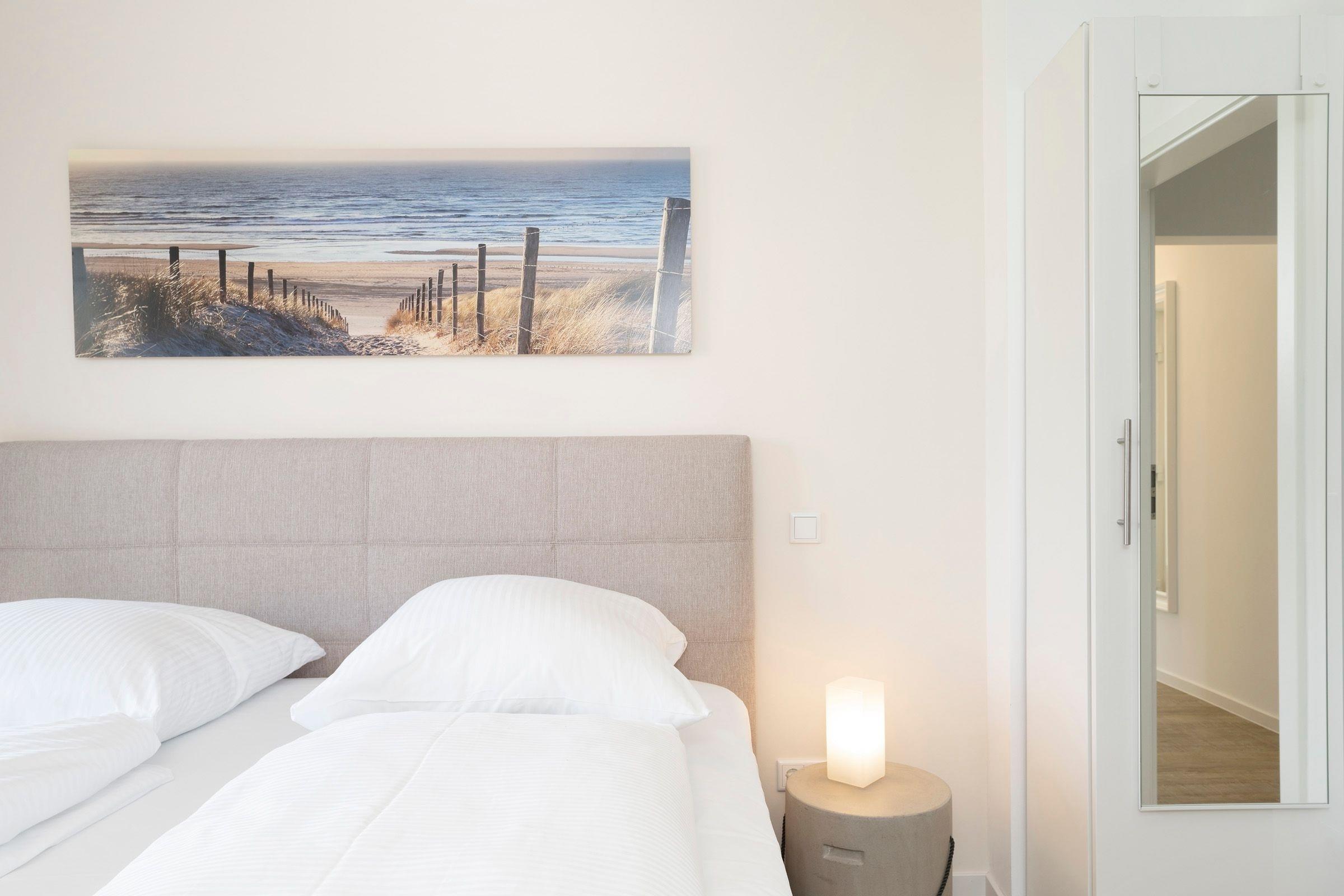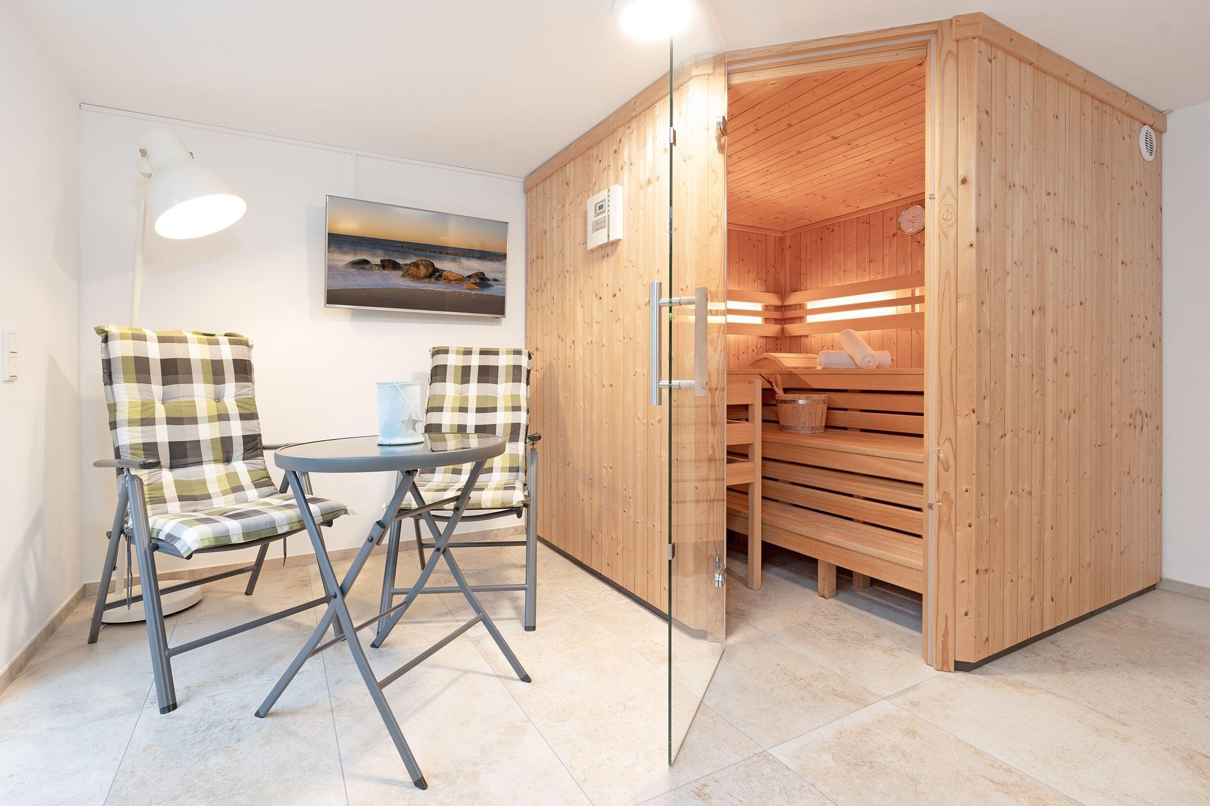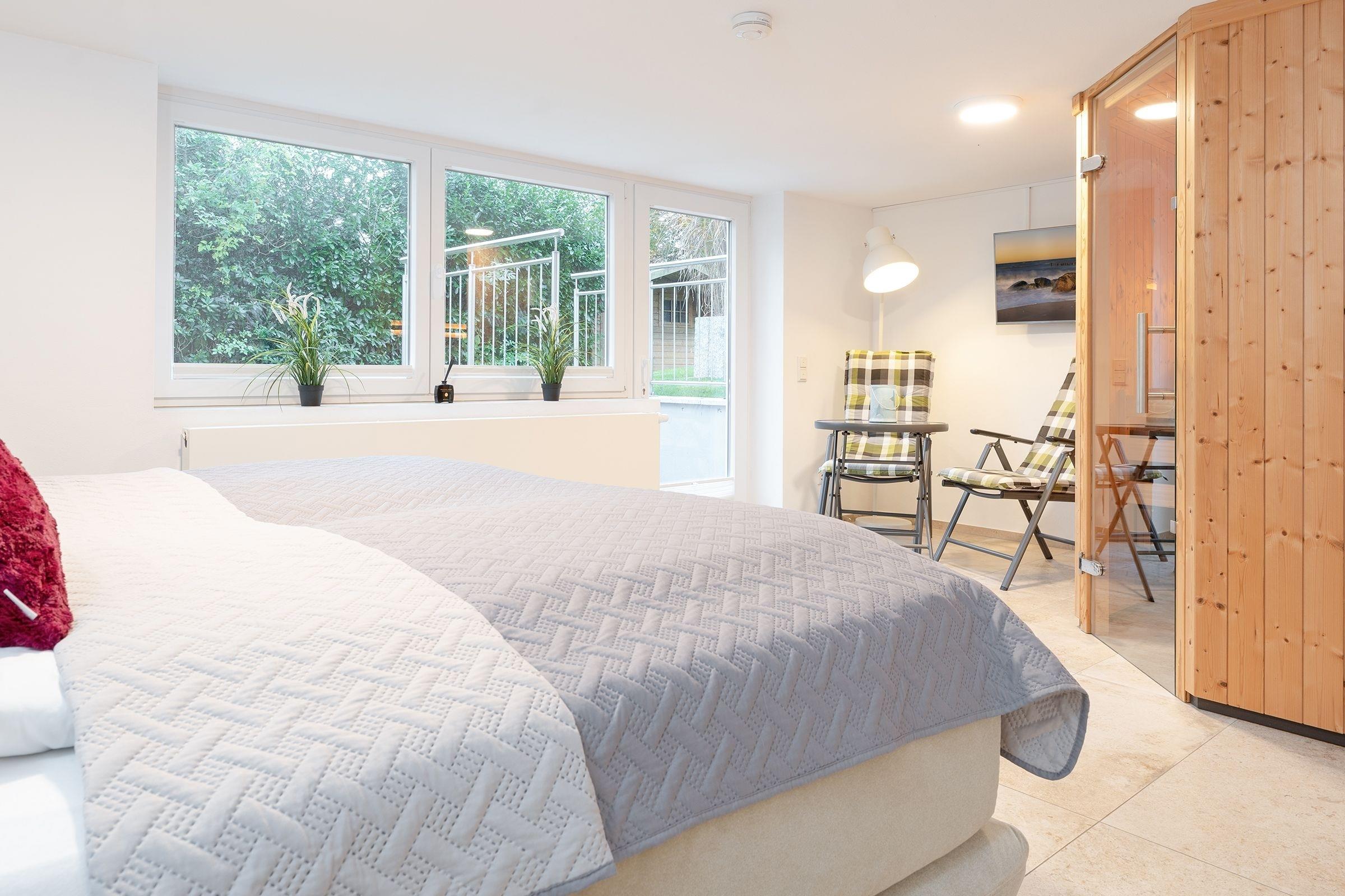 Die Wohnung empfängt Sie im Erdgeschoss mit einem gemütlichen Wohnzimmer sowie angrenzender offener Küche. Hier bereiten Sie Kaffeespezialitäten mit der Nespresso-Kapselmaschine zu, die Sie anschließend an der frischen Ostseeluft auf der Terrasse unter einem Sonnenschirm genießen können. Im Erdgeschoss befindet sich das erste Schlafzimmer mit gemütlichem Boxspring-Doppelbett (180x200 cm) und ein voll ausgestattetes Badezimmer mit bodengleicher Walk-In-Dusche und angenehmer Fußbodenheizung. Über eine Treppe gelangen Sie in die untere Etage mit eigener Sauna für kalte Winterabende. Hier gibt es außerdem ein zweites Bad mit Badewanne und bodengleicher Dusche sowie ein weiteres Schlafzimmer - ebenso mit einem Boxspring-Doppelbett (180x200 cm) ausgestattet. Der WLAN-Anschluss ist inklusive.
